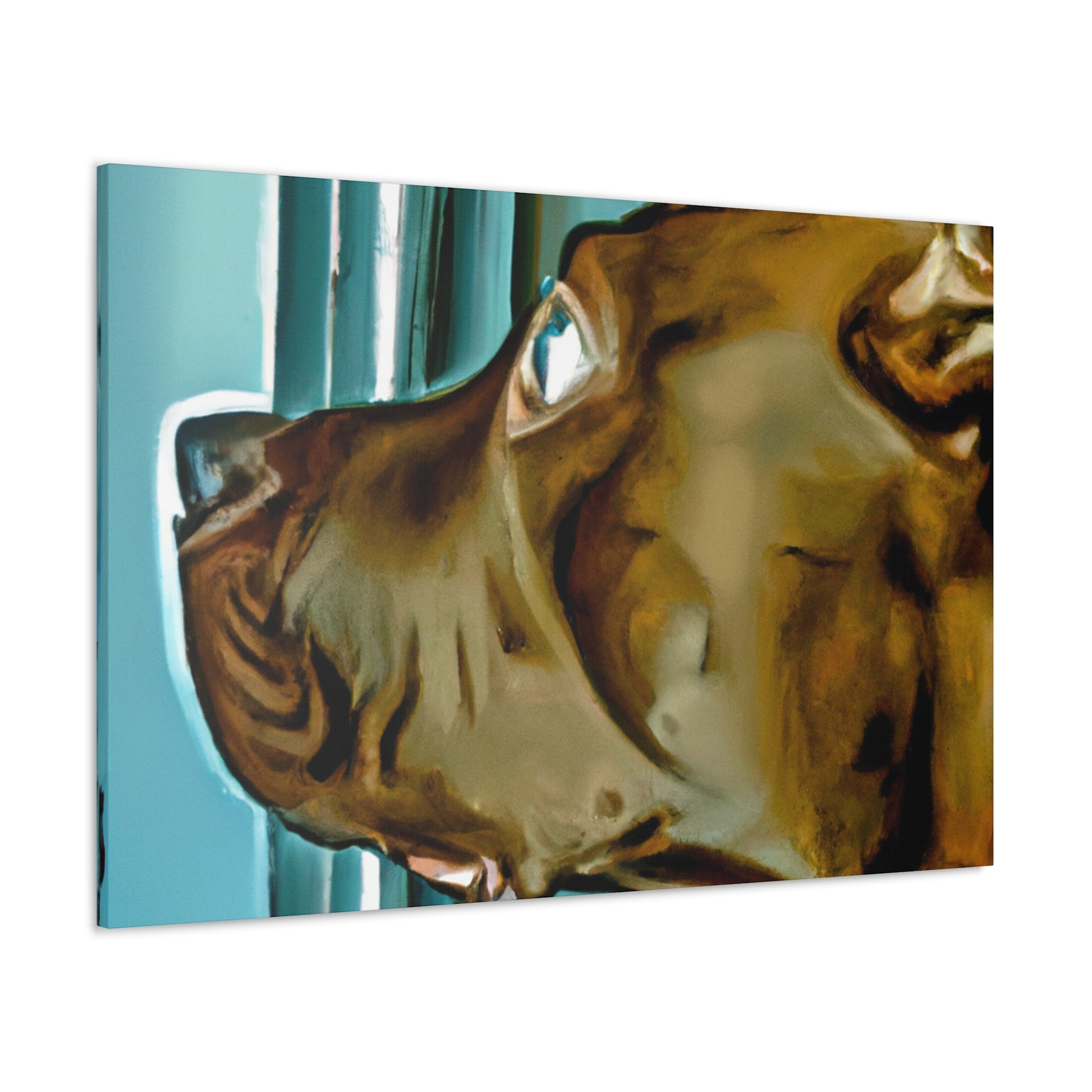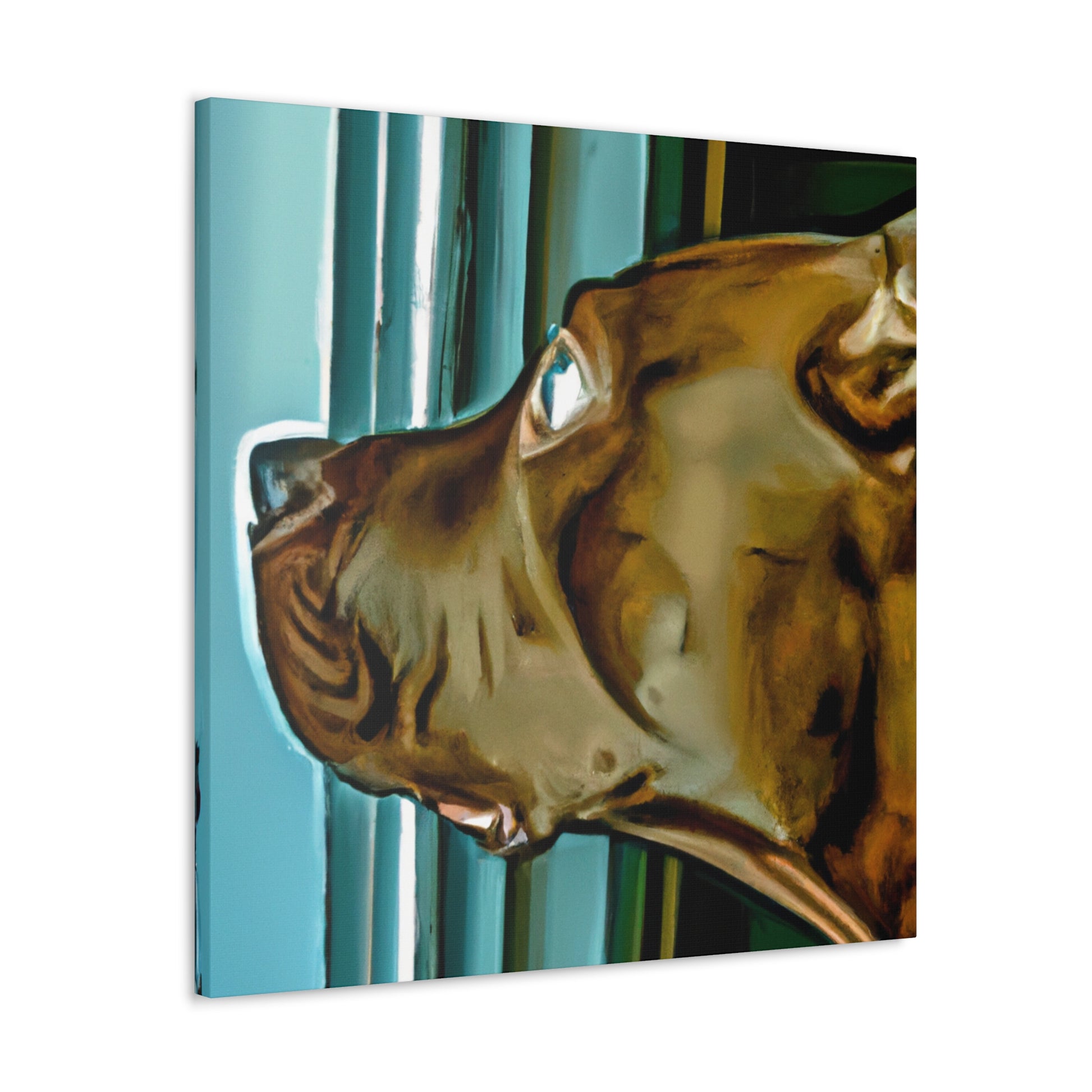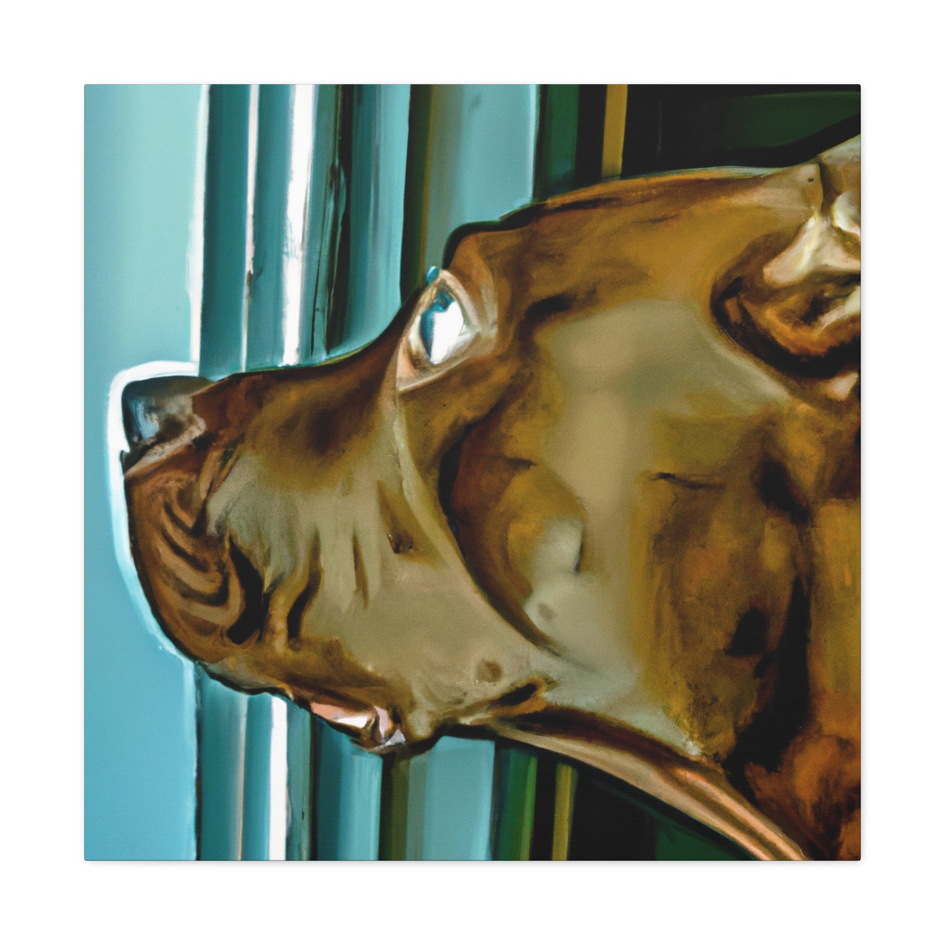 This abstract painting features a young brown pit bull with eyes full of life and longing, gazing out of a psychedelic window. Each element of the painting has been carefully designed and crafted to create an aesthetically pleasing and classy work of art. Let your guests be drawn in by the realism of the pup and mesmerized by its otherworldly elements. #puppy #pitbull #dog #canvas #painting #abstract #art #psychedelic #realistic #young #classy