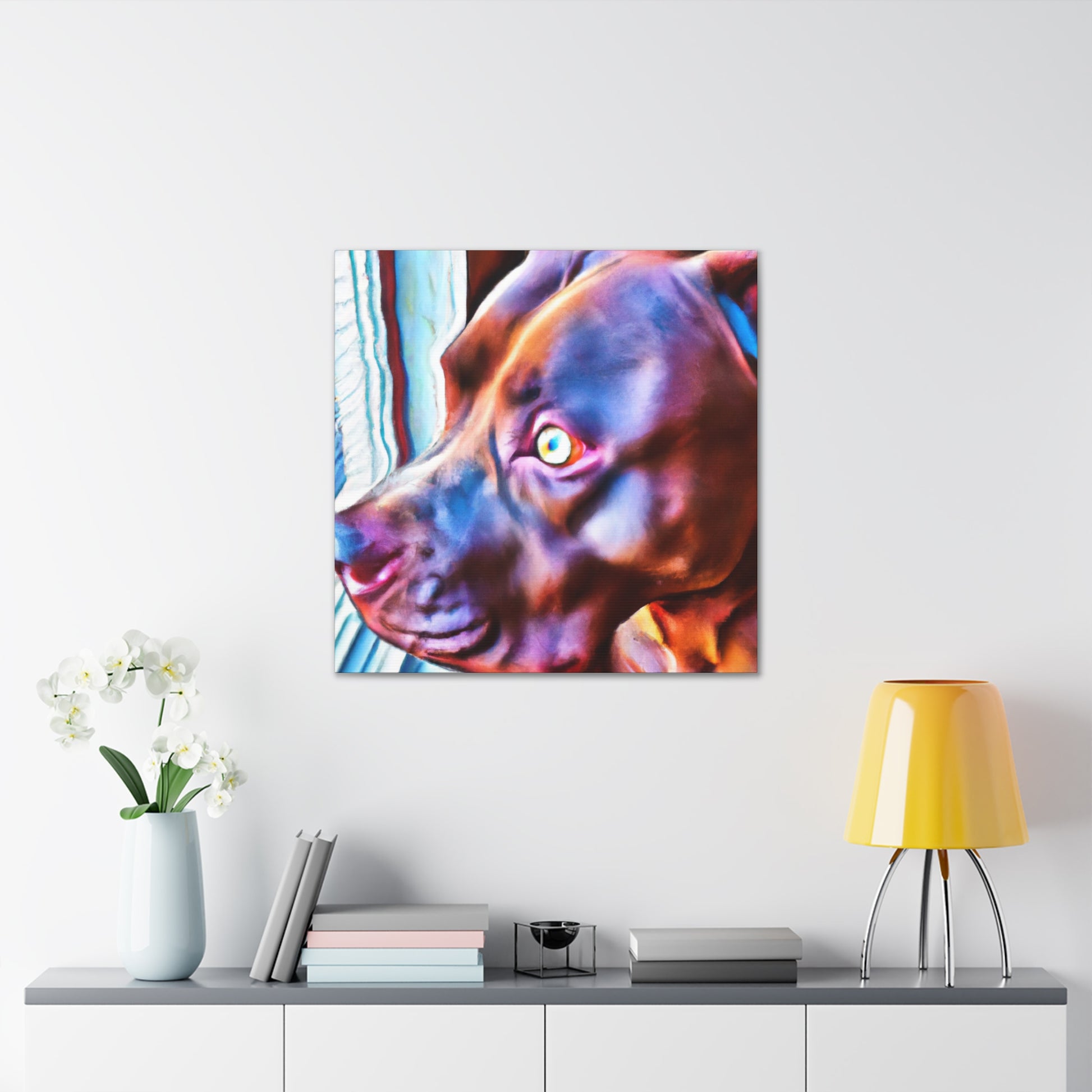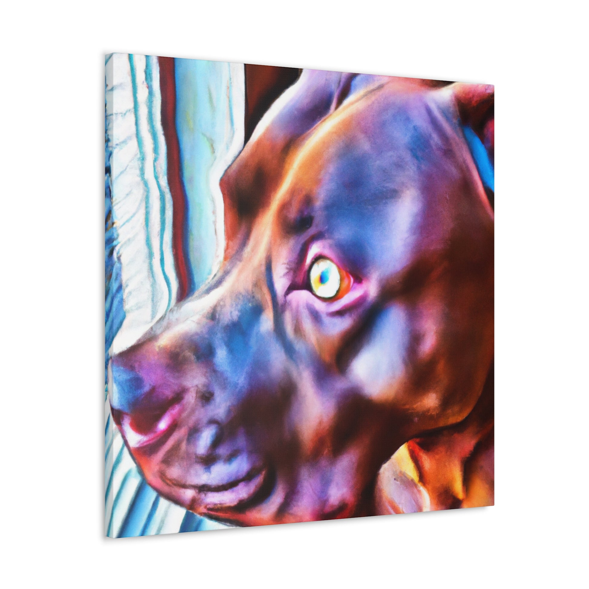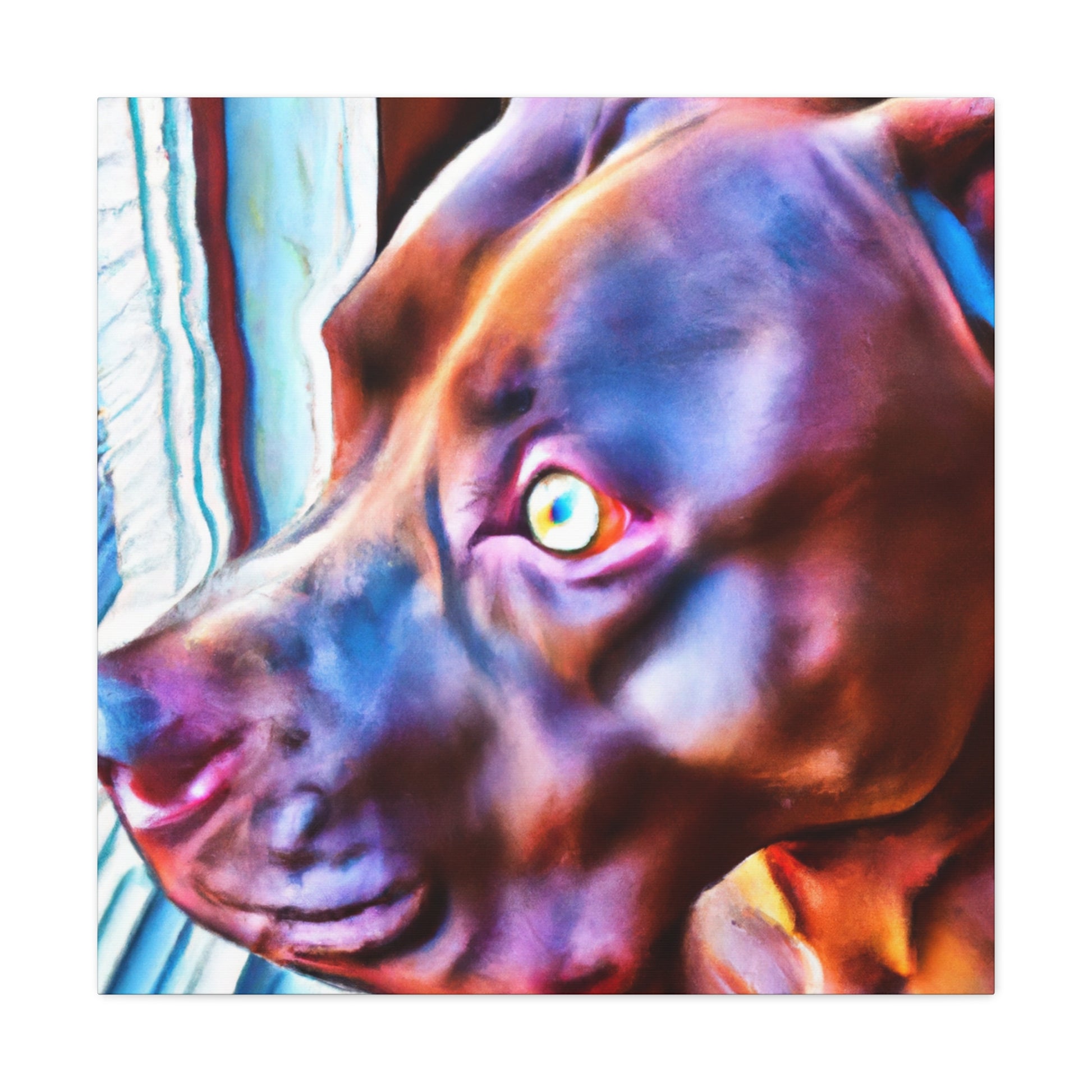 A stunningly colorful abstract painting of a loyal young brown pit bull looking out the window with eyes filled with life and longing. The canvas portrays this young pup against a psychedelic backdrop of bright neon colors, an ode to the joyful life of youth. Perfect for living spaces, offices, and bedrooms. #youngdog #pitbullsofinstagram #abstractart #neoncolors #pitsforlife #doglovers #dogwindow #canvasart #painting #loyalpet #happypup #youthfulenergy