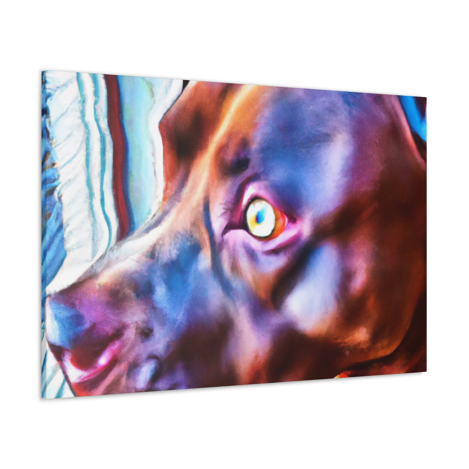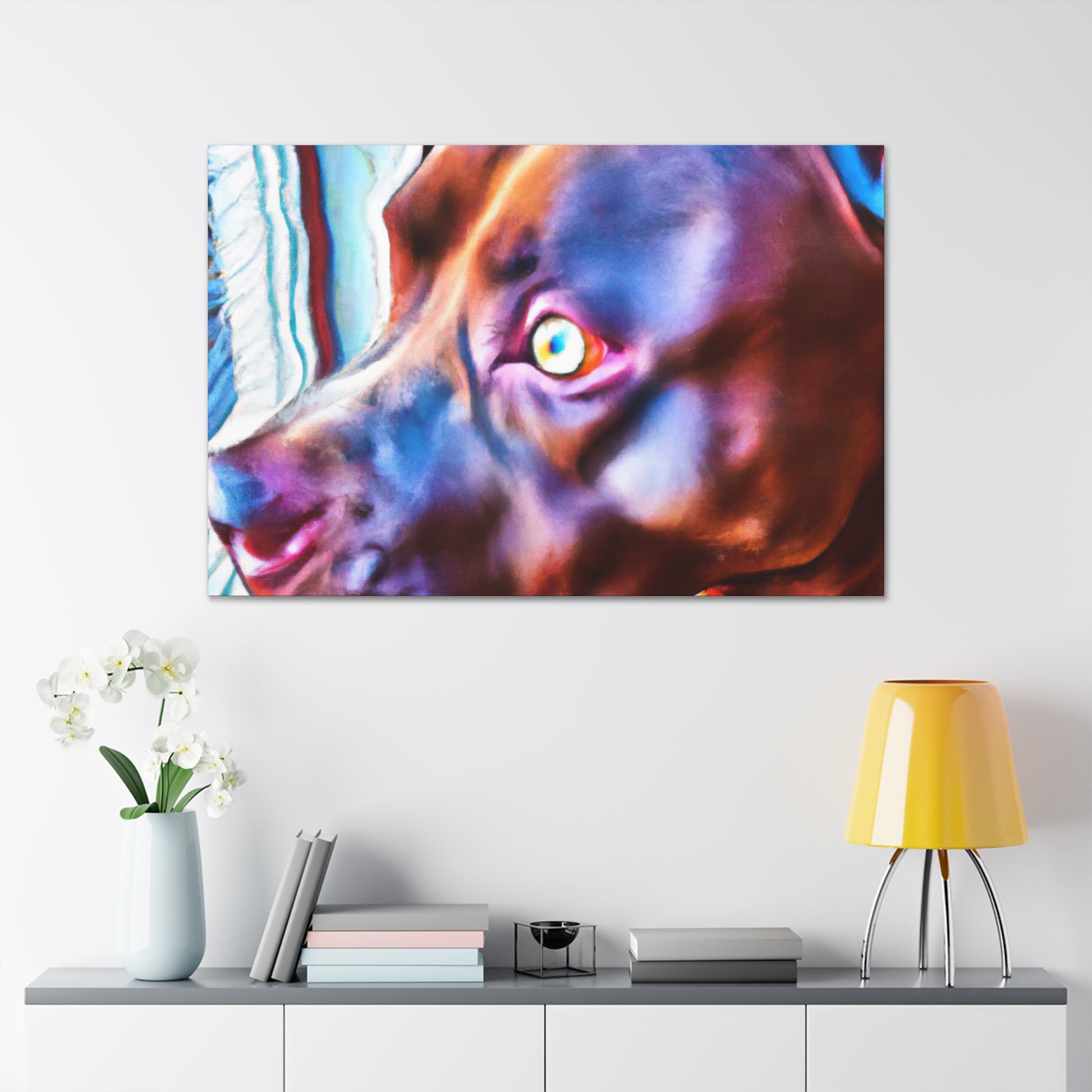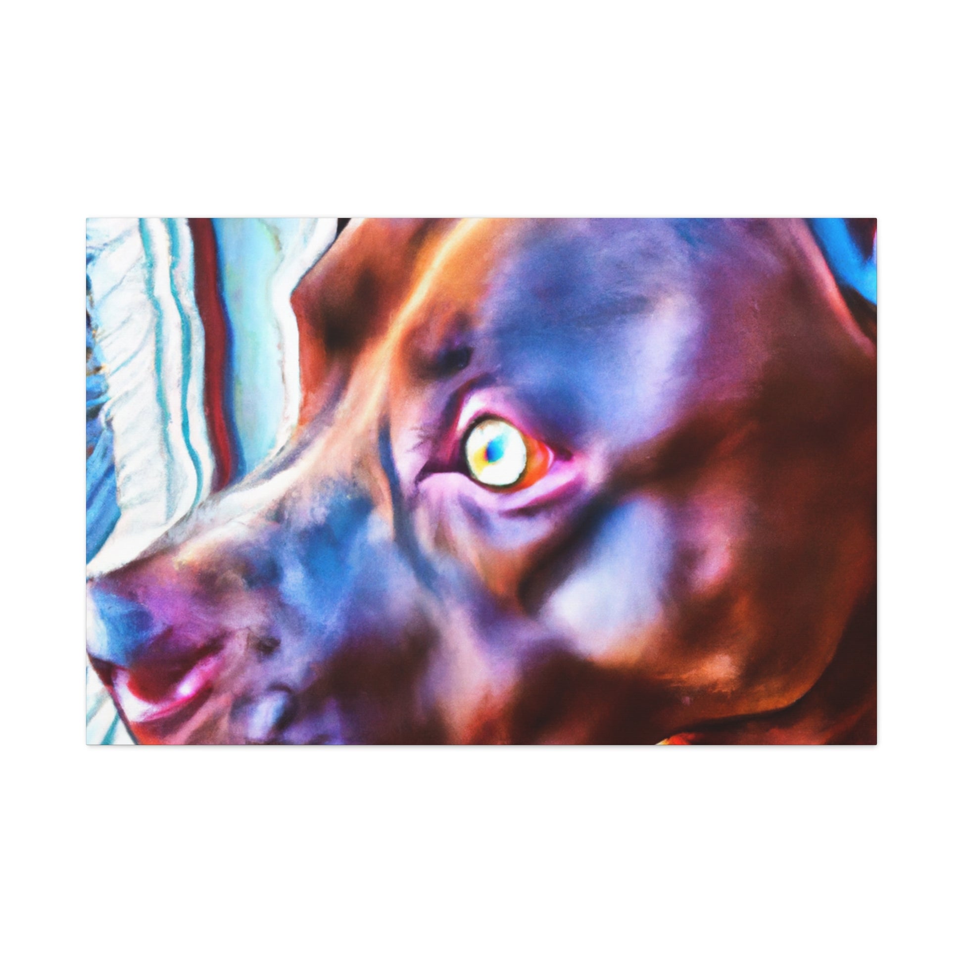 A stunningly colorful abstract painting of a loyal young brown pit bull looking out the window with eyes filled with life and longing. The canvas portrays this young pup against a psychedelic backdrop of bright neon colors, an ode to the joyful life of youth. Perfect for living spaces, offices, and bedrooms. #youngdog #pitbullsofinstagram #abstractart #neoncolors #pitsforlife #doglovers #dogwindow #canvasart #painting #loyalpet #happypup #youthfulenergy