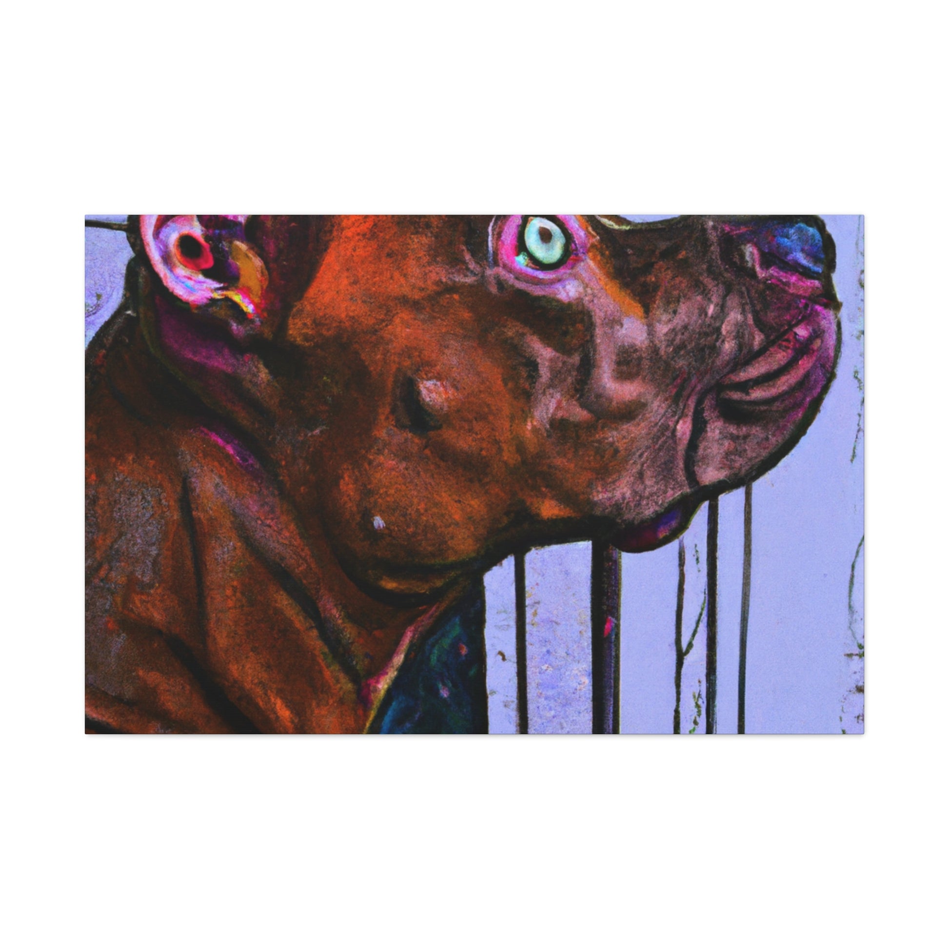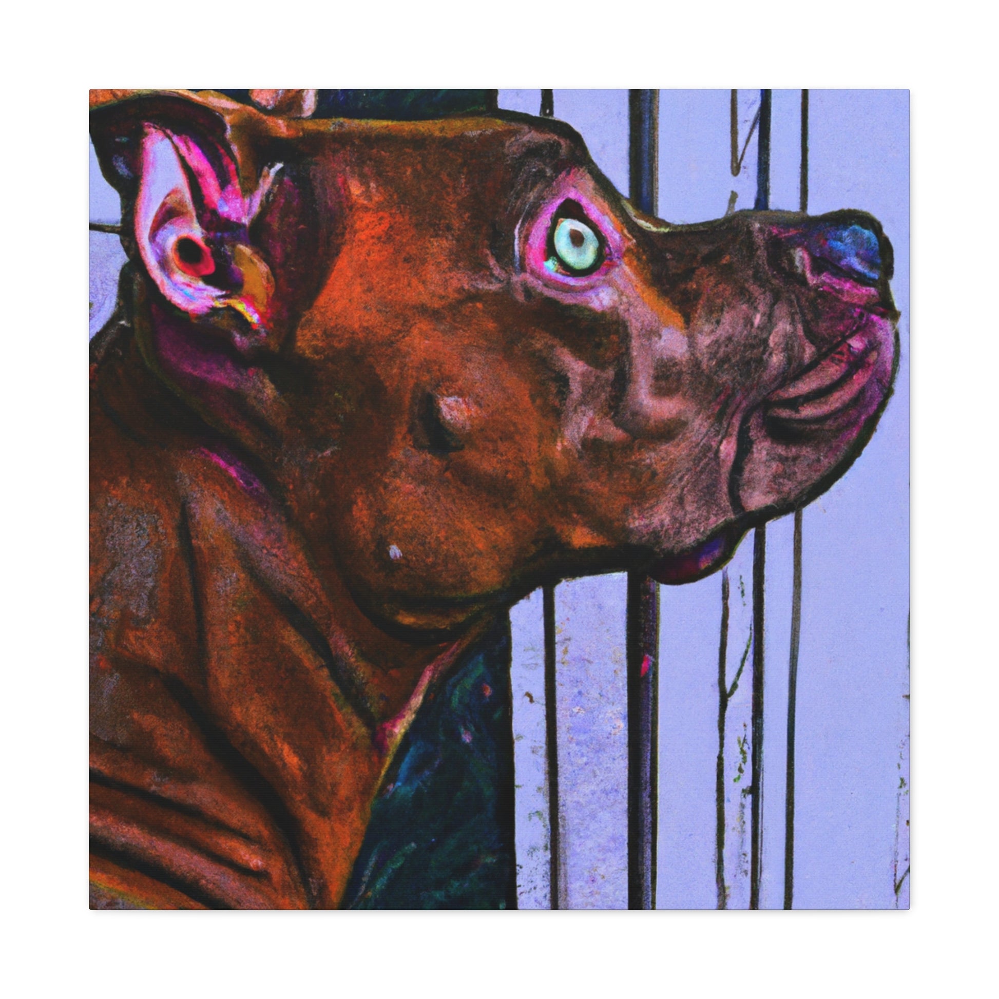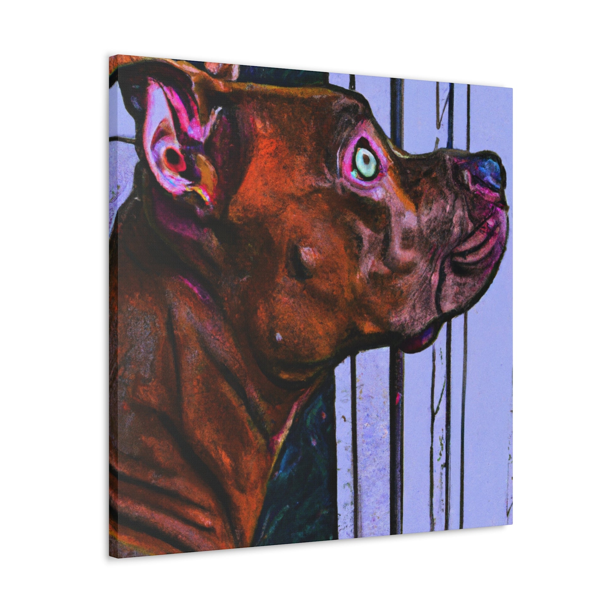 This canvas painting captures the beautiful and endearing spirit of young innocence in a young pit bull, looking with longing out the window with glistening eyes. A kaleidoscopic array of colors reveals the peaceful atmosphere, with the dog himself standing in stark contrast to the vibrant background. A timeless classic, this canvas is certain to bring alluring refinement to any home. #abstractart #canvasart #youngpup #pitbullsofinstagram #innocence #longinggaze #kaleidoscopic #vibrantcolors #timelessclassic #homedecor #artdecor