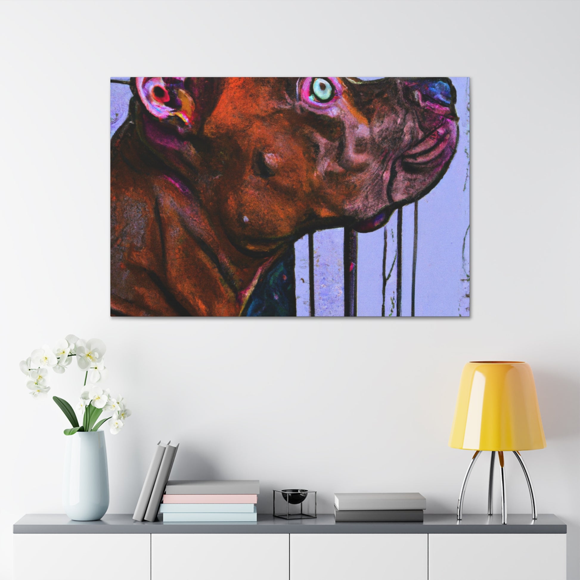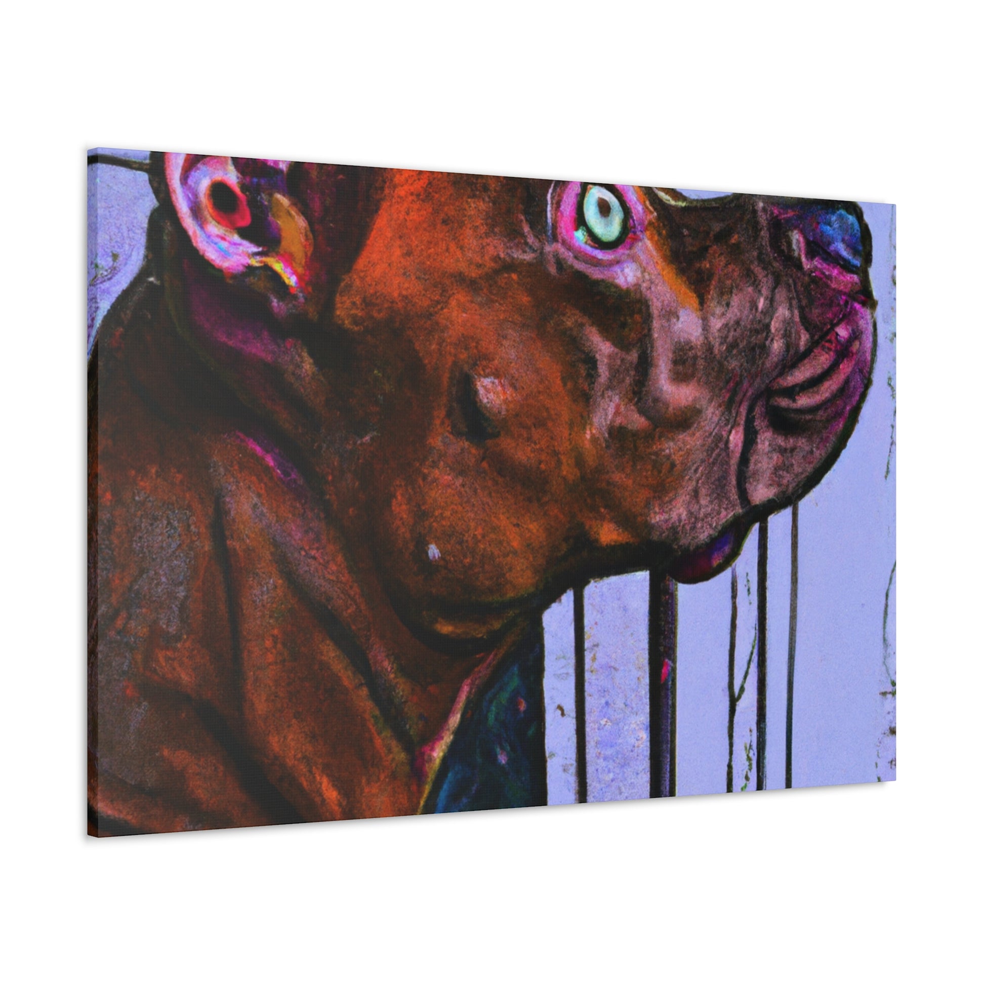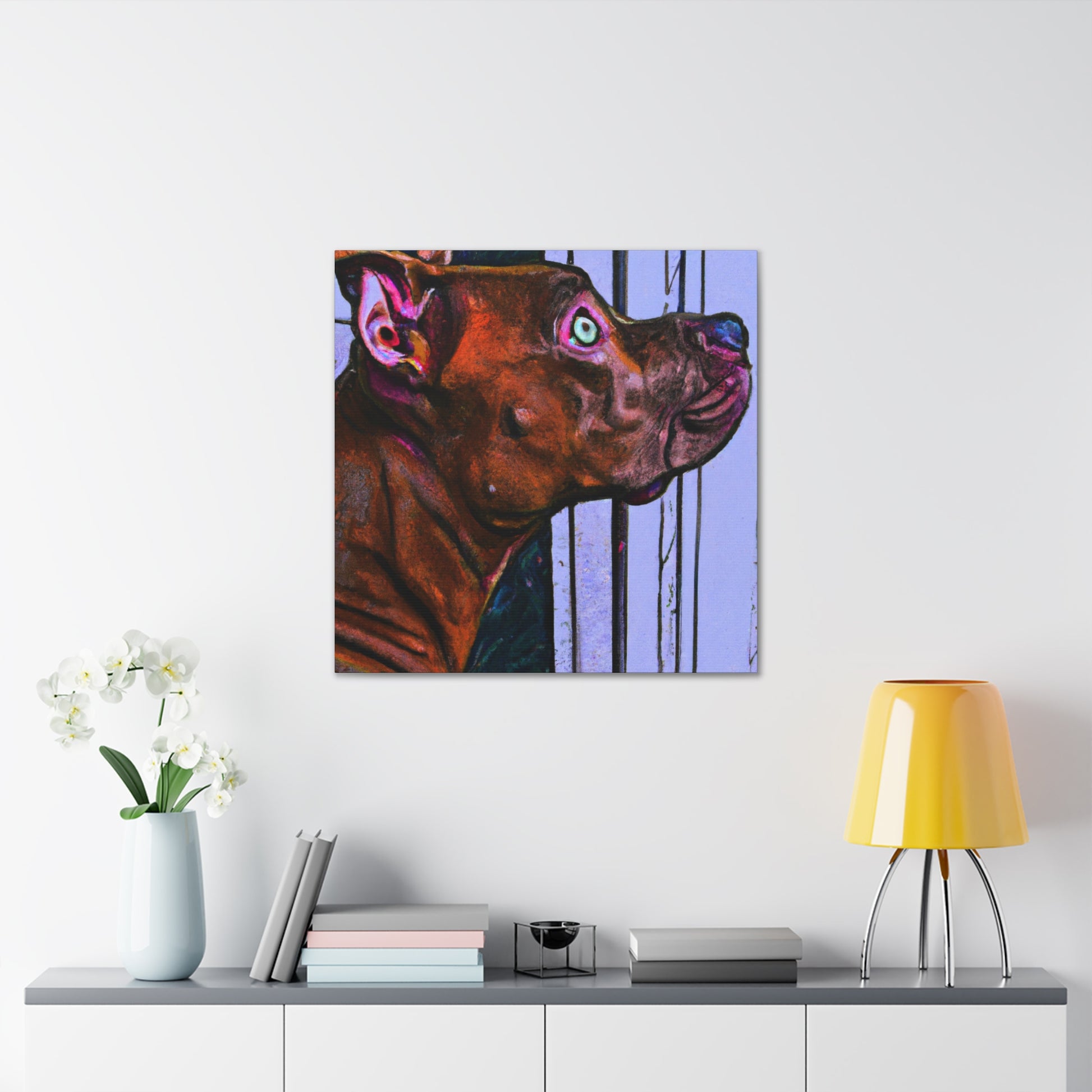 This canvas painting captures the beautiful and endearing spirit of young innocence in a young pit bull, looking with longing out the window with glistening eyes. A kaleidoscopic array of colors reveals the peaceful atmosphere, with the dog himself standing in stark contrast to the vibrant background. A timeless classic, this canvas is certain to bring alluring refinement to any home. #abstractart #canvasart #youngpup #pitbullsofinstagram #innocence #longinggaze #kaleidoscopic #vibrantcolors #timelessclassic #homedecor #artdecor