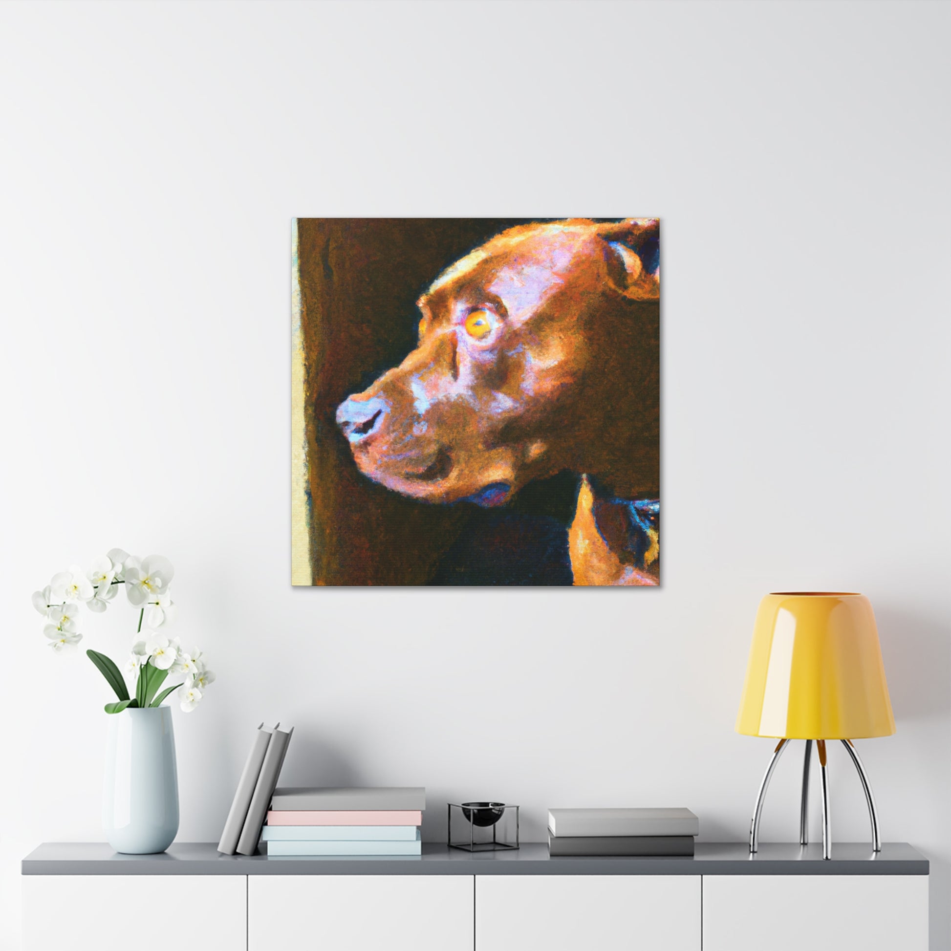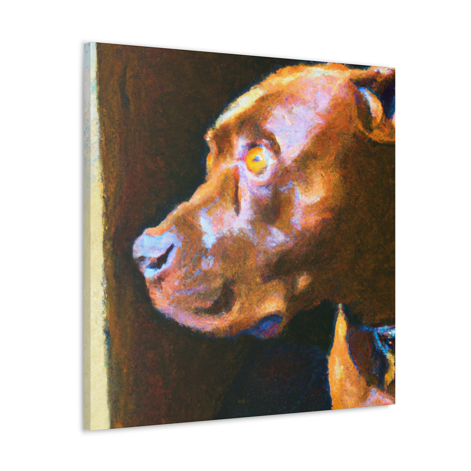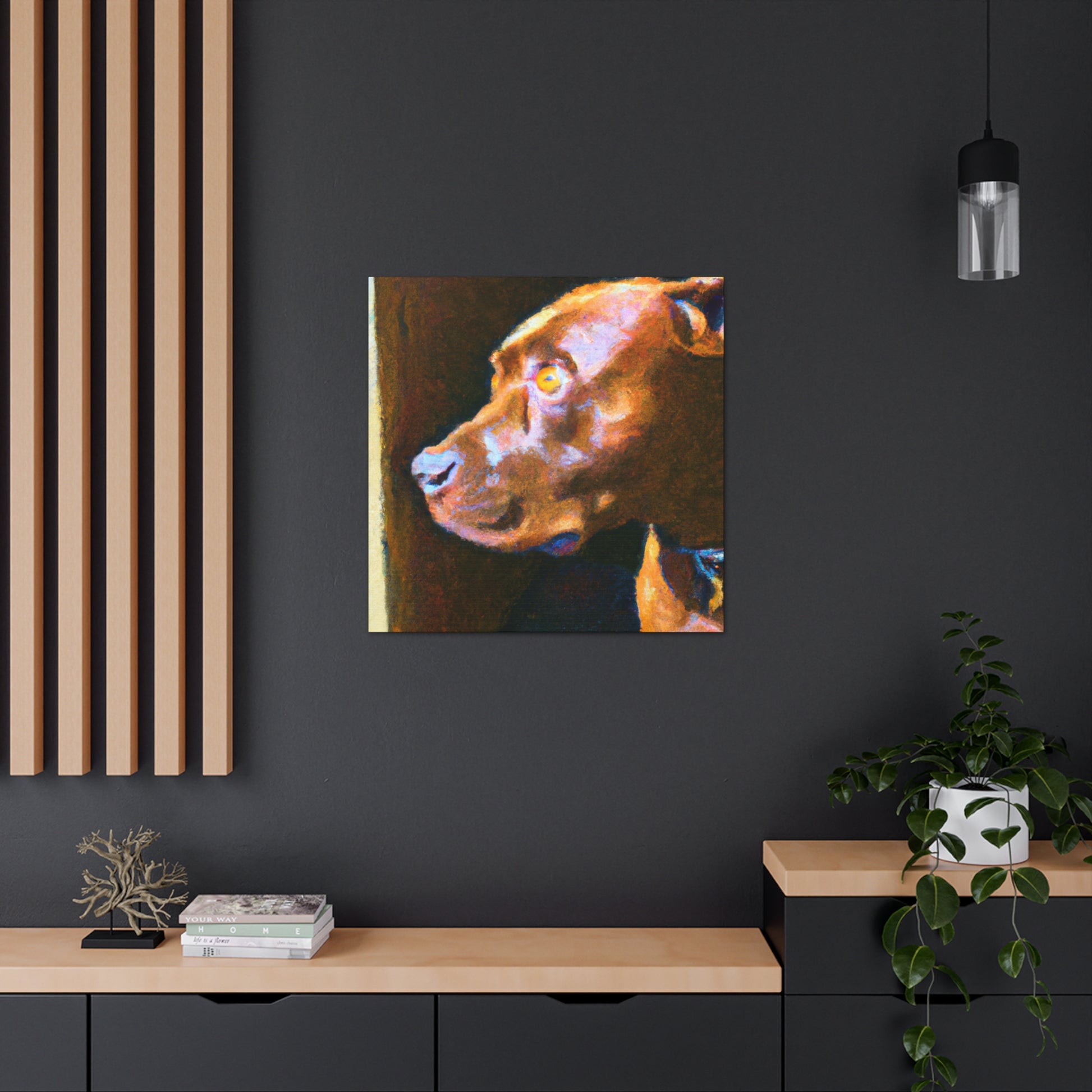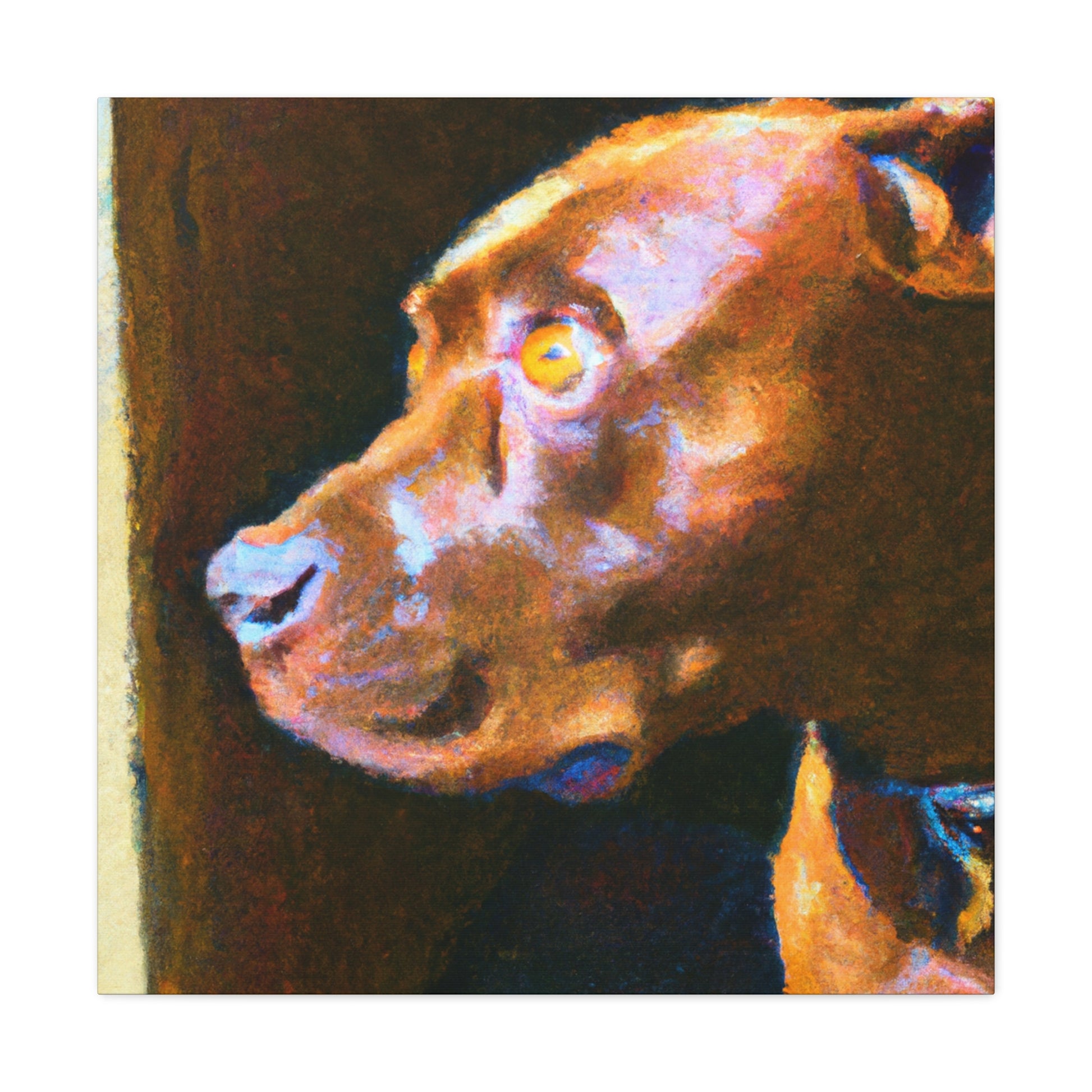 This abstract painting shows a young, brown pit bull looking longingly out the window. His expression is vivid and full of life, while the rest of the canvas is a dazzling array of bright colors and swirls. It's the perfect piece to bring a touch of elegance and energy to a room. #abstractart #artwork #pits #puppy #trippyart #psychedelic #canvas #dogart #pitbull #wallart #acrylicpainting