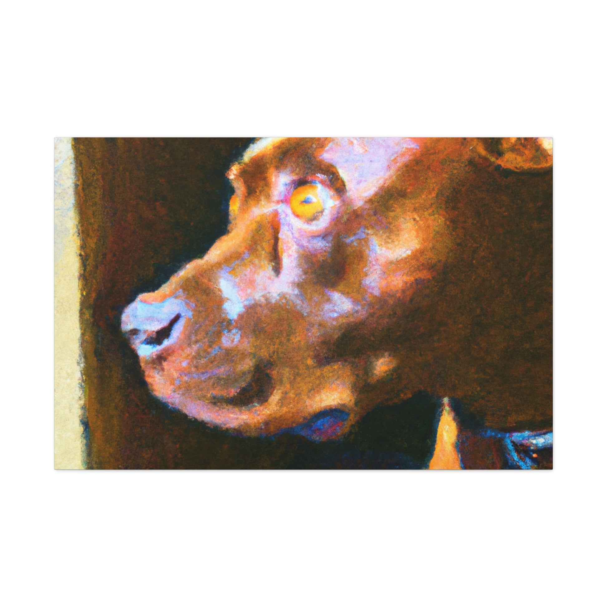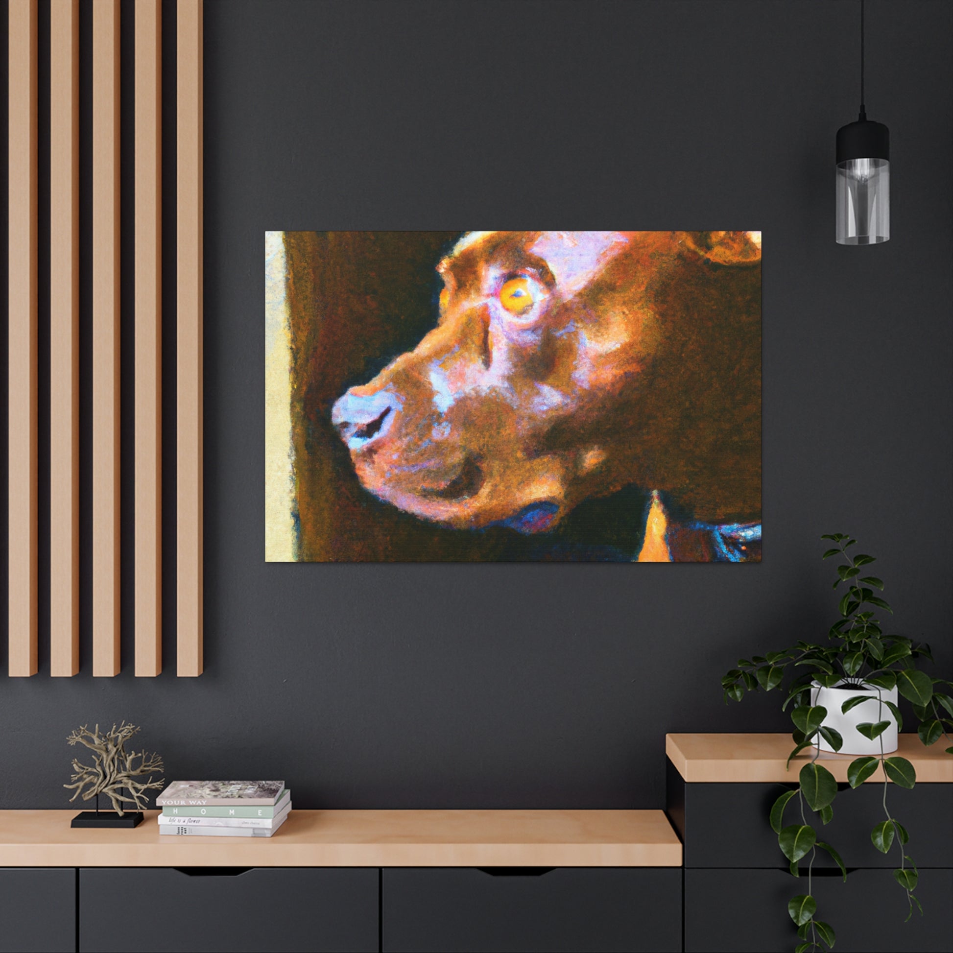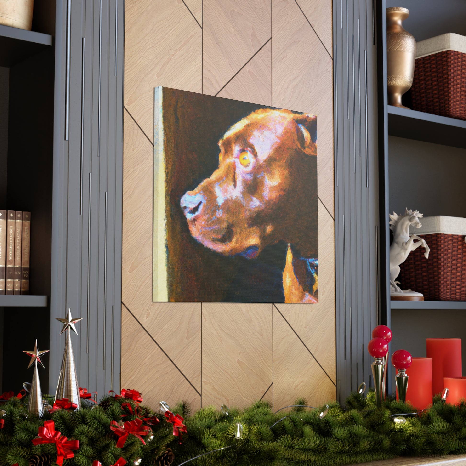 This abstract painting shows a young, brown pit bull looking longingly out the window. His expression is vivid and full of life, while the rest of the canvas is a dazzling array of bright colors and swirls. It's the perfect piece to bring a touch of elegance and energy to a room. #abstractart #artwork #pits #puppy #trippyart #psychedelic #canvas #dogart #pitbull #wallart #acrylicpainting