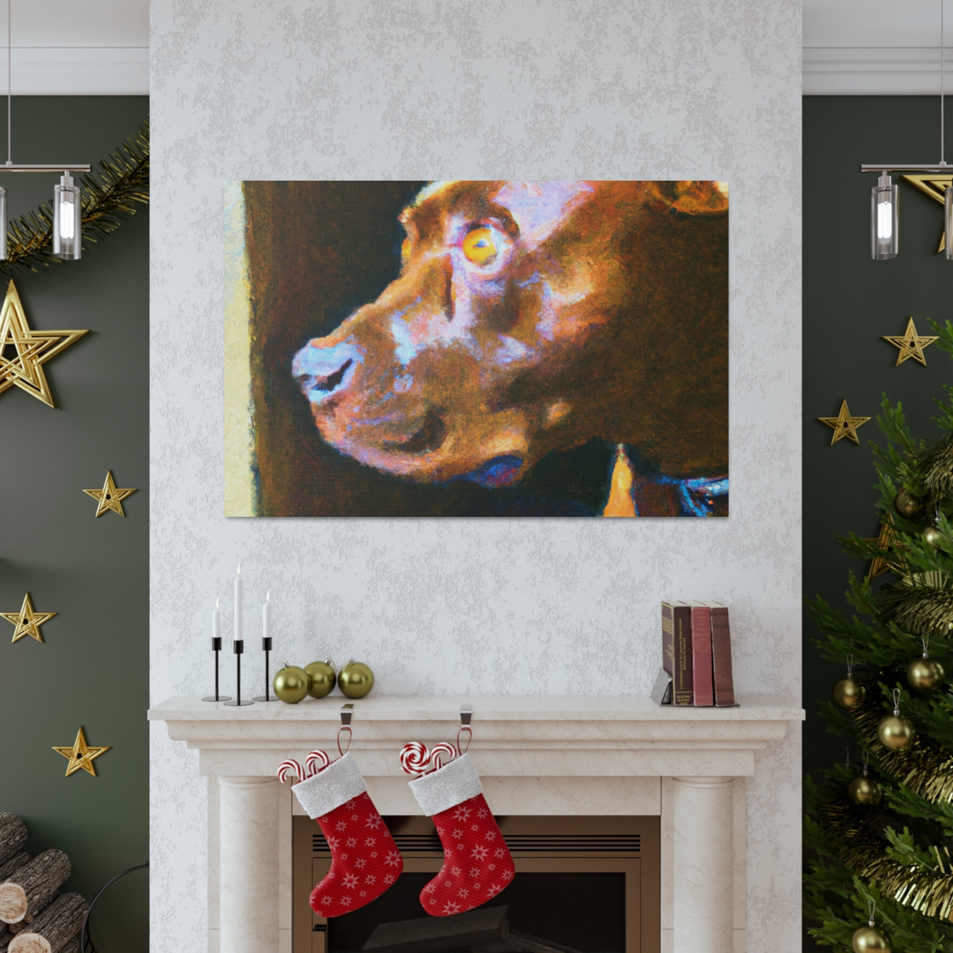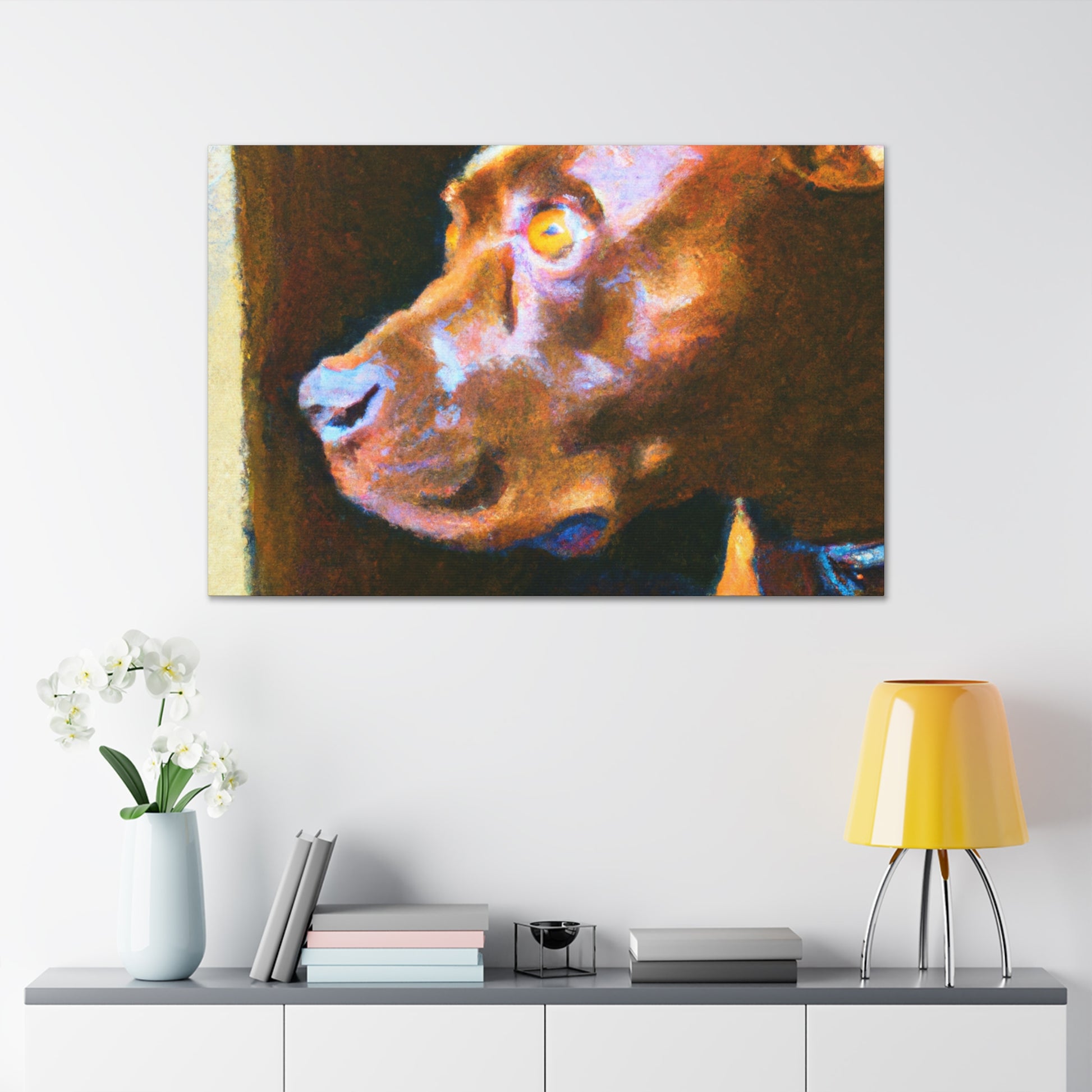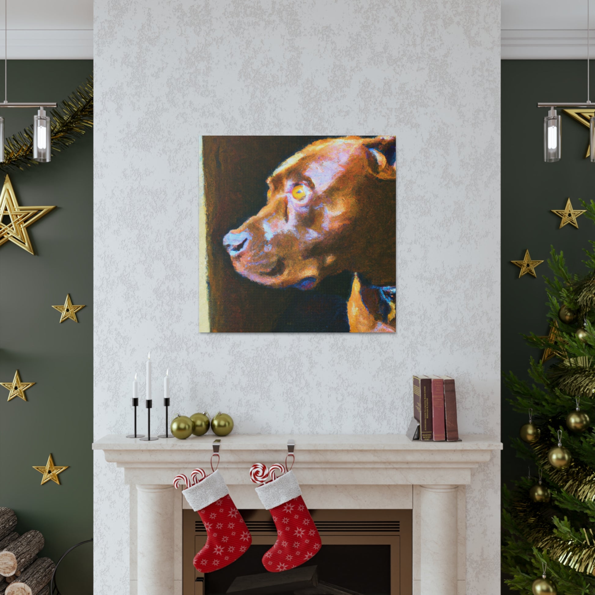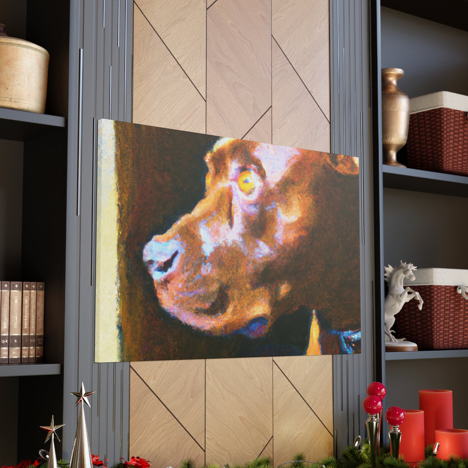 This abstract painting shows a young, brown pit bull looking longingly out the window. His expression is vivid and full of life, while the rest of the canvas is a dazzling array of bright colors and swirls. It's the perfect piece to bring a touch of elegance and energy to a room. #abstractart #artwork #pits #puppy #trippyart #psychedelic #canvas #dogart #pitbull #wallart #acrylicpainting