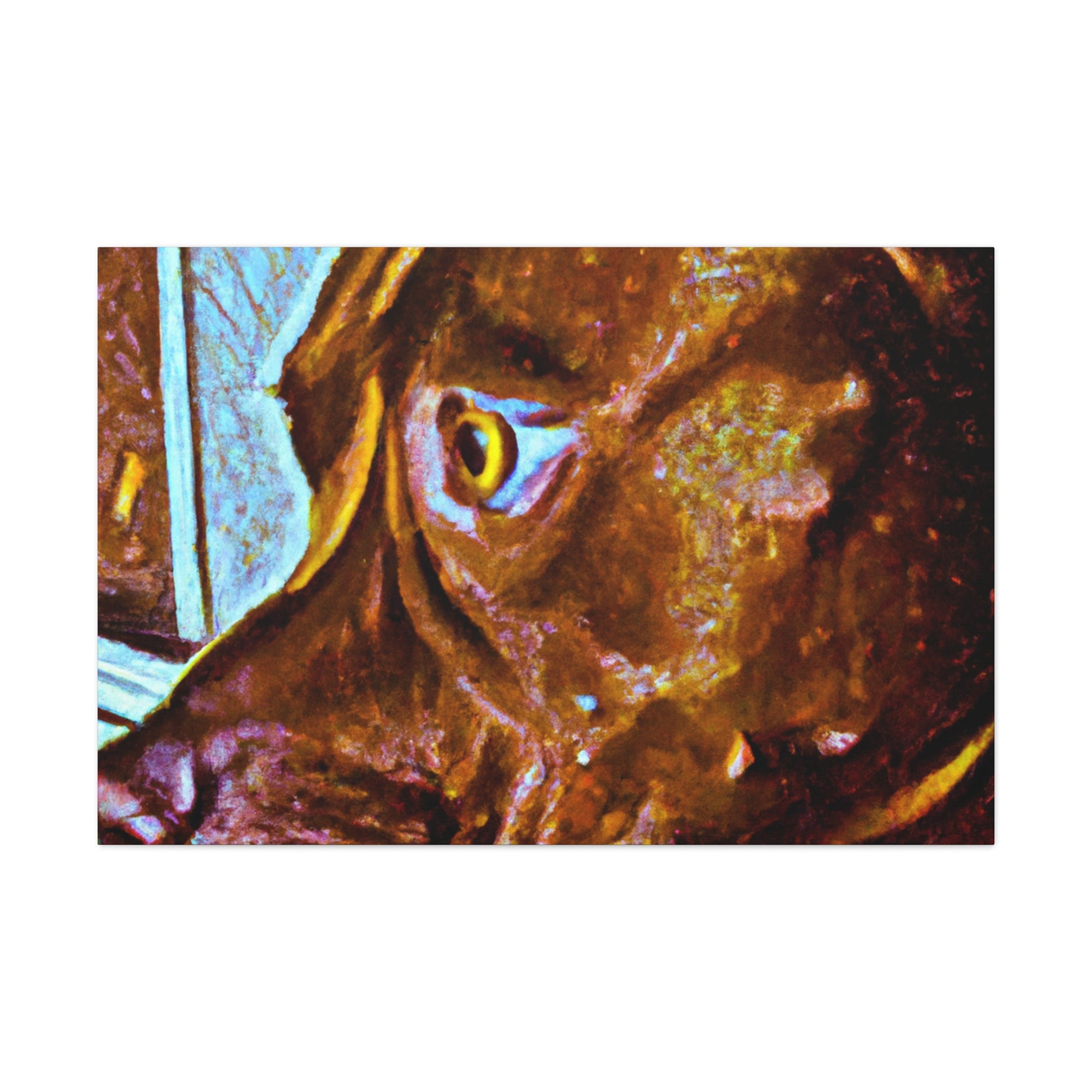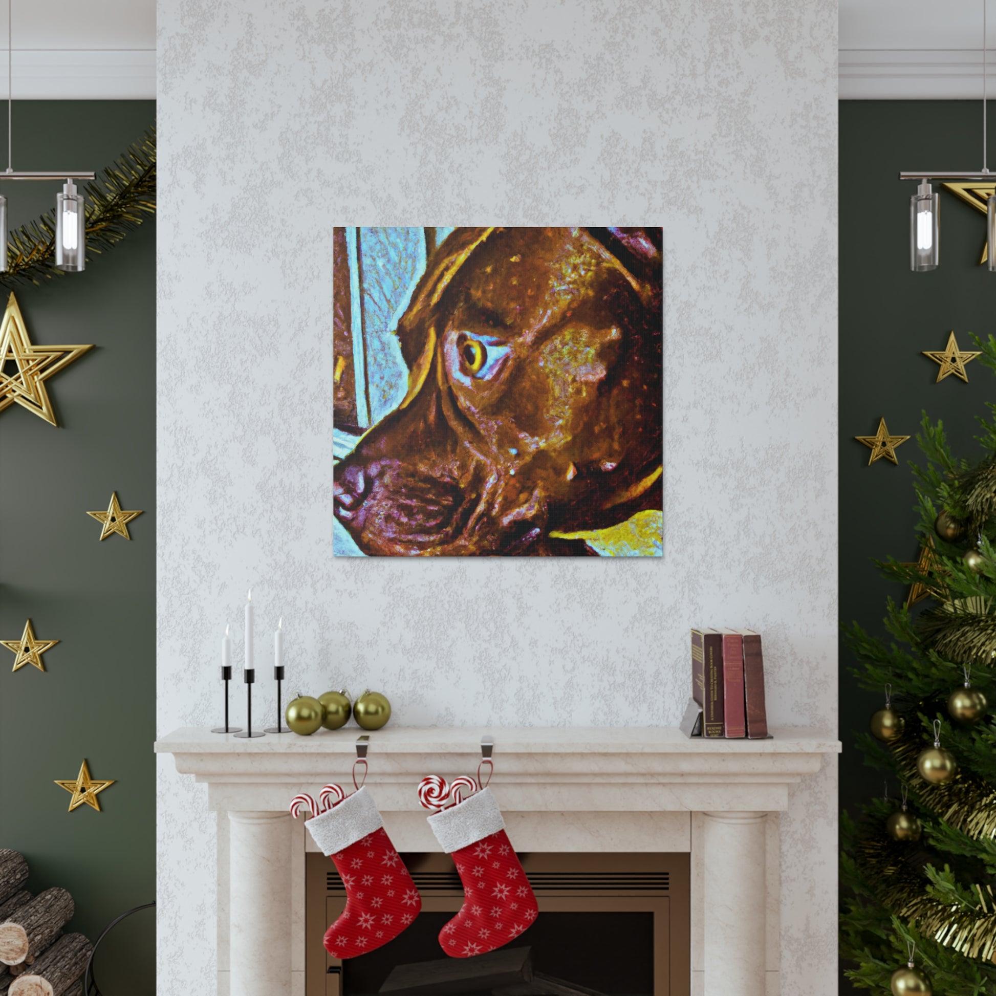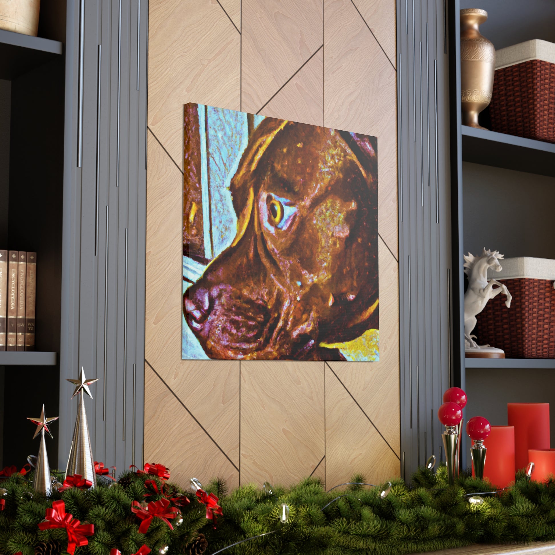 A stunning abstract canvas featuring a brown pitbull looking out the window with big, soulful eyes. Out of an energetic yet dizzying array of shapes and colors, his lively face stands out in vivid sharpness. Make a statement with this one of a kind painting and add an elegant yet unique touch to any room. #puppypainting #canvasart #doglovers #abstractart #youngpitbull #brownpitbull #dizzyingcolors #roomdecor #statementpiece #walldecor #uniquestyling