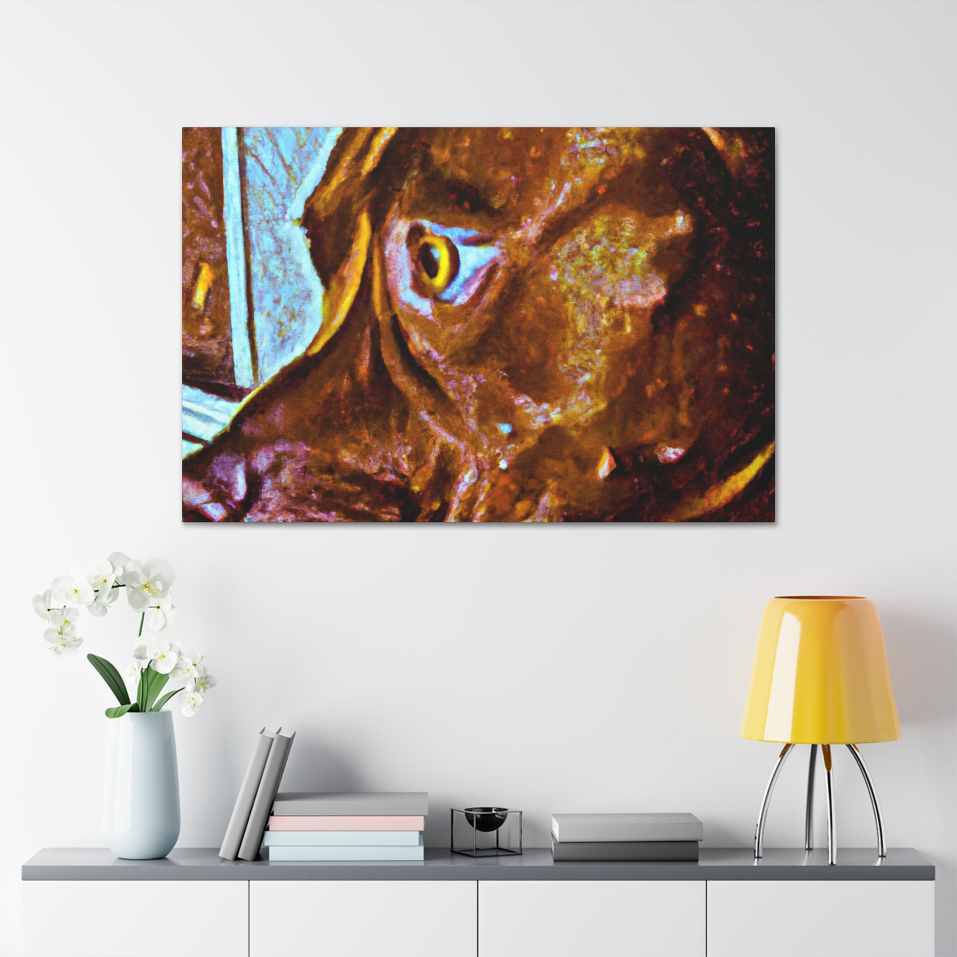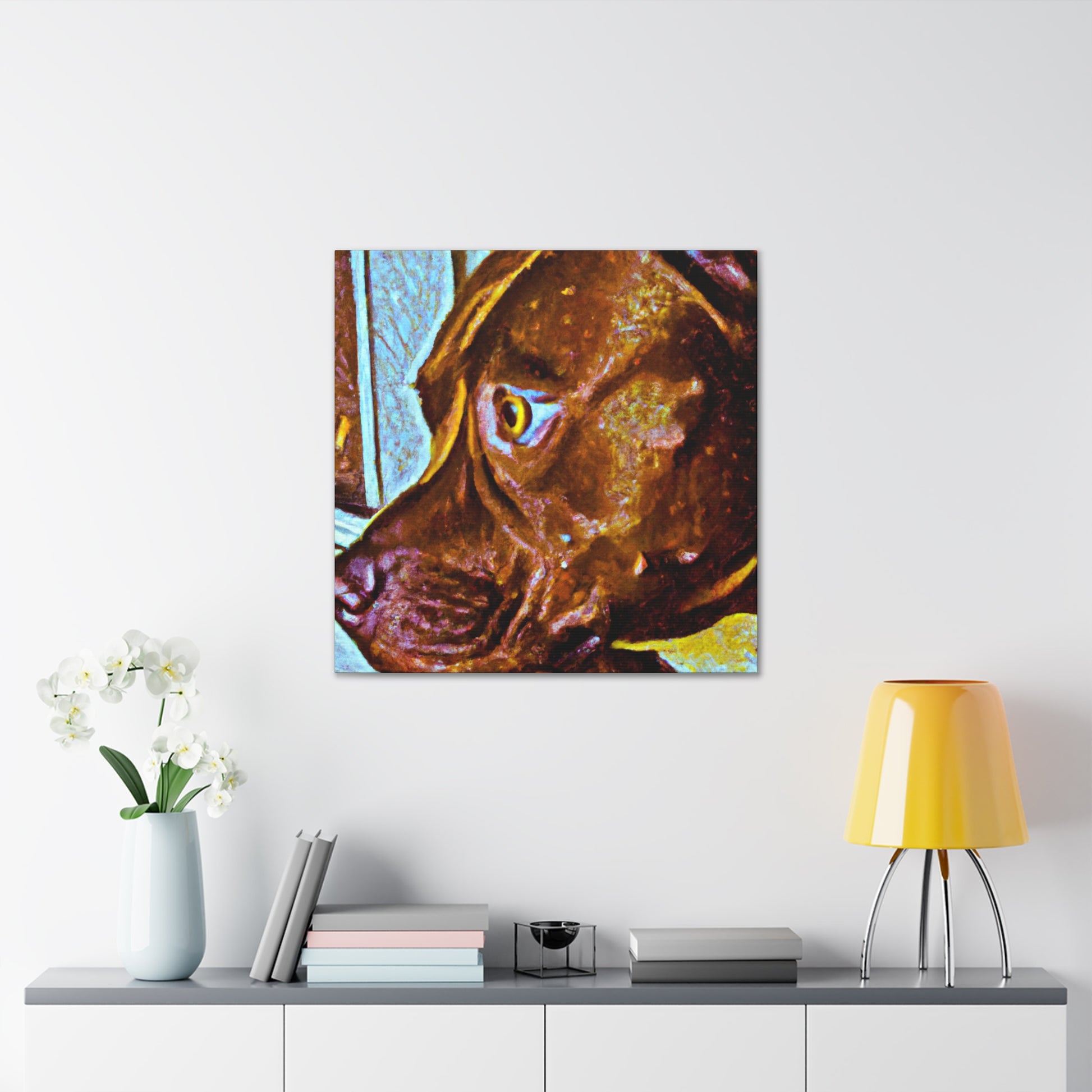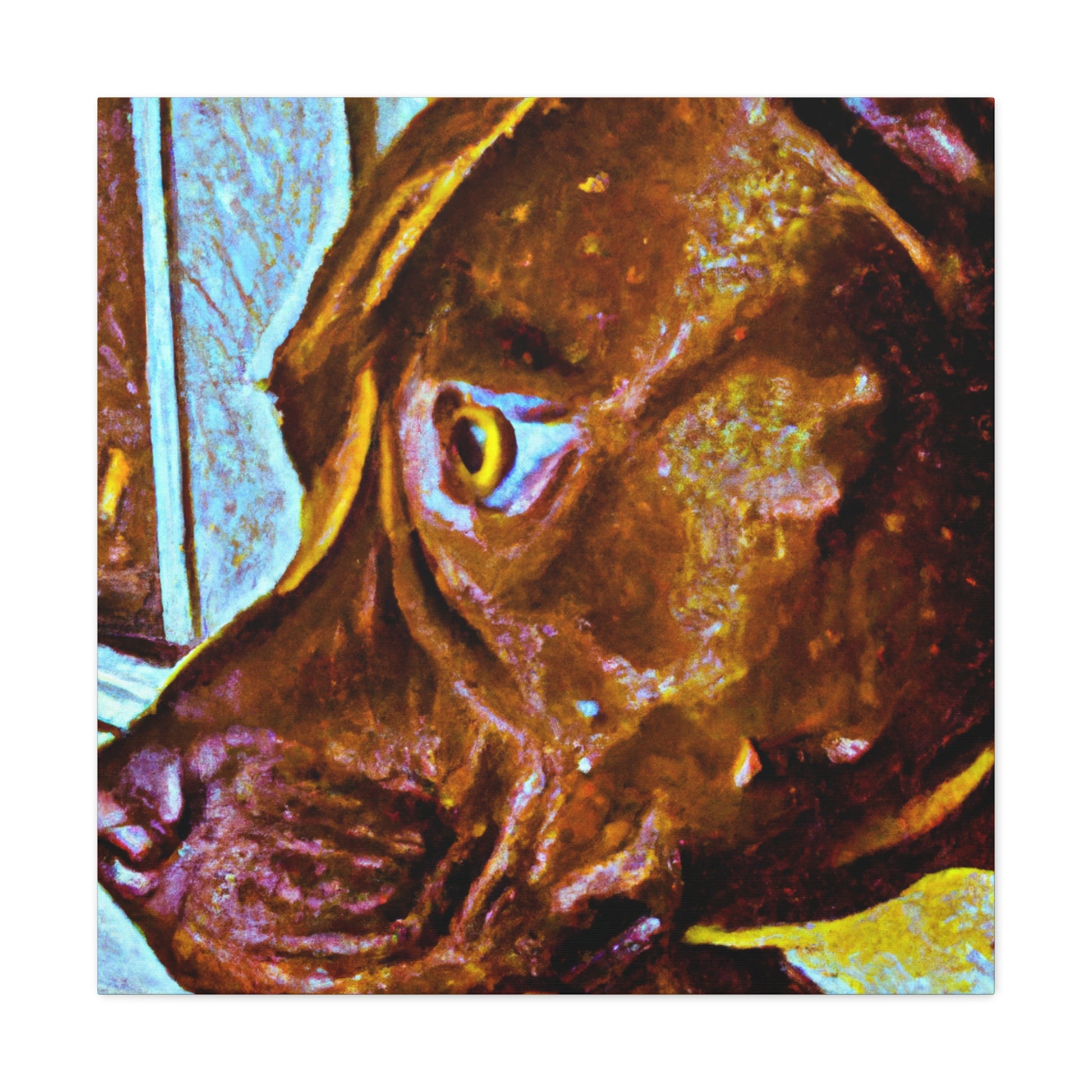 A stunning abstract canvas featuring a brown pitbull looking out the window with big, soulful eyes. Out of an energetic yet dizzying array of shapes and colors, his lively face stands out in vivid sharpness. Make a statement with this one of a kind painting and add an elegant yet unique touch to any room. #puppypainting #canvasart #doglovers #abstractart #youngpitbull #brownpitbull #dizzyingcolors #roomdecor #statementpiece #walldecor #uniquestyling