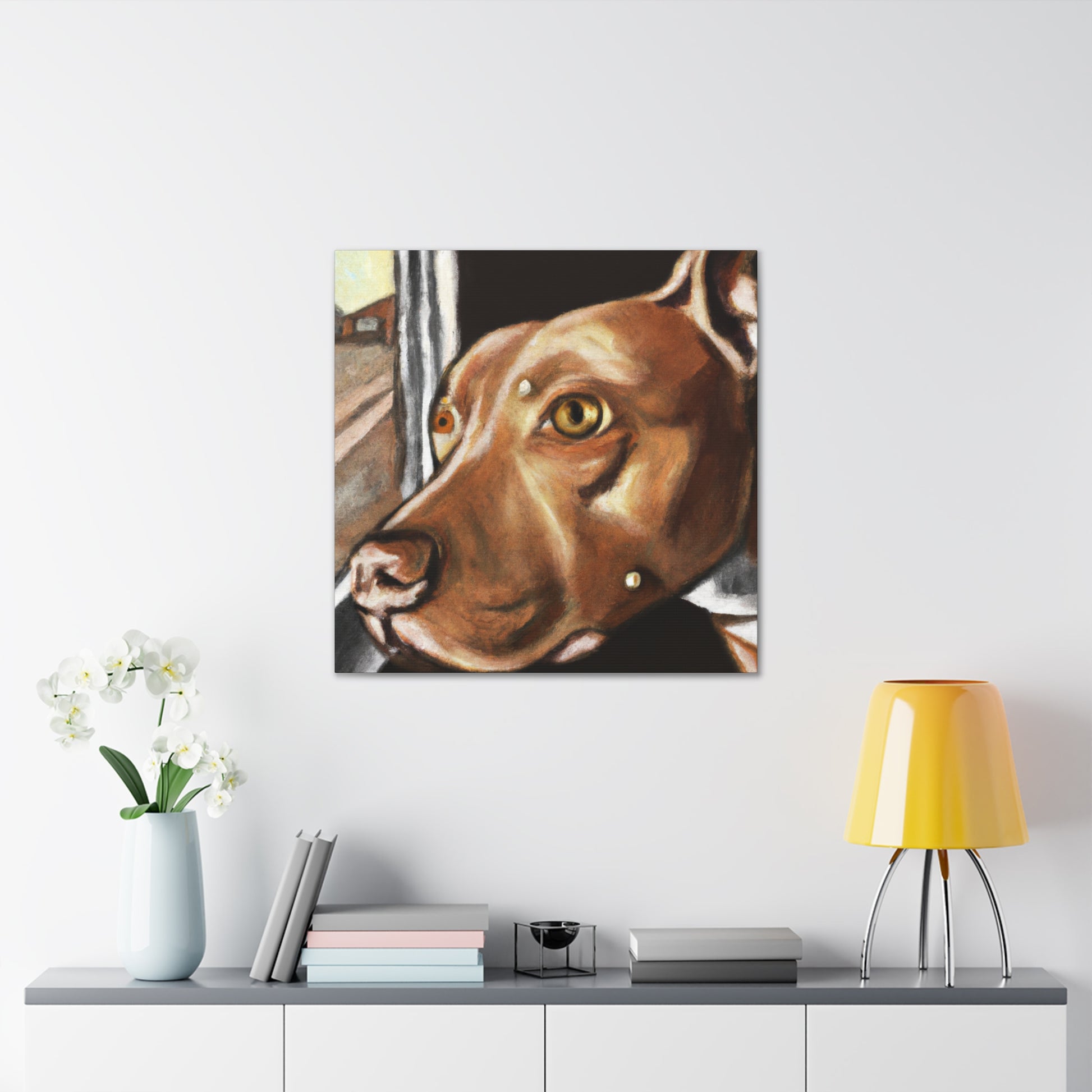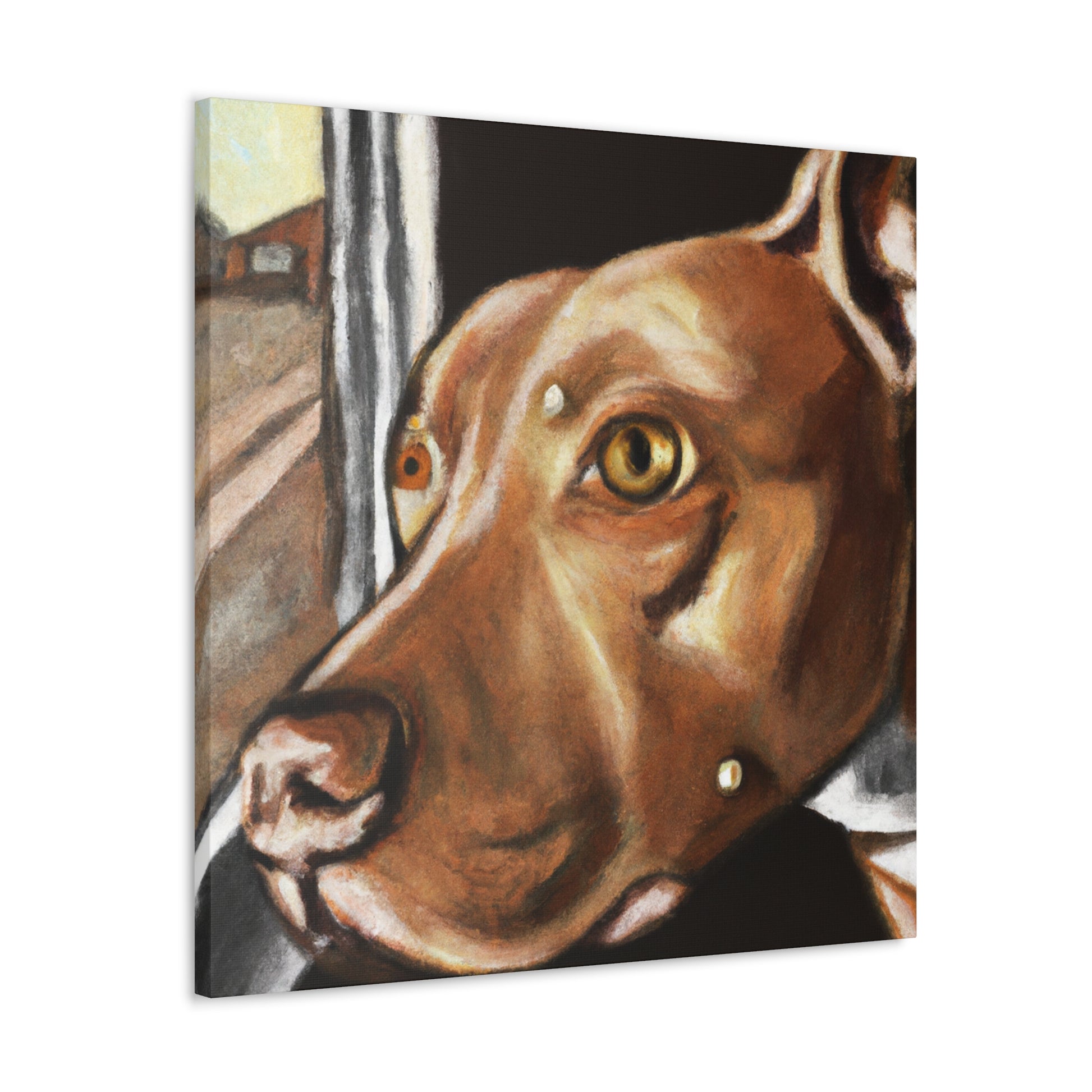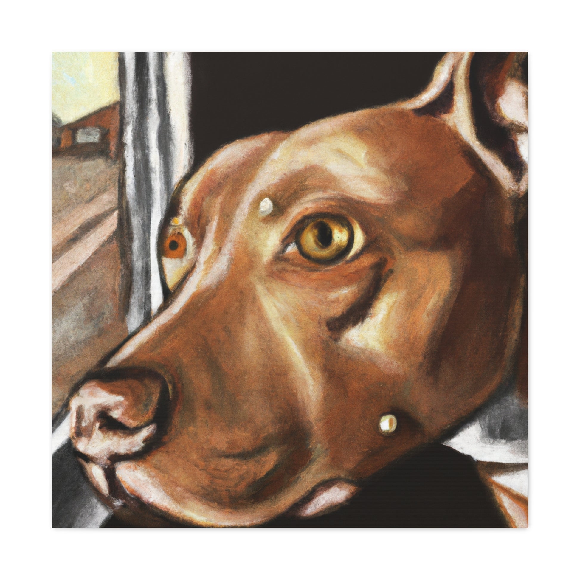 This abstract painting on canvas features a young brown pit bull with lots of life in his eyes, looking longingly out the window. The painting features a clear depiction of the dog, while the other elements of the painting are presented in a vibrant, dreamy manner. Explore your own interpretation of the painting as it allows for countless stories. Bring a touch of class to your home decor. #AbstractPainting #PitBull #Canvas #HomeDecor #YoungPitBull #WindowFrame #DreamyPainting #ModernArt #ModernDecor #Interpretation #VibrantPainting