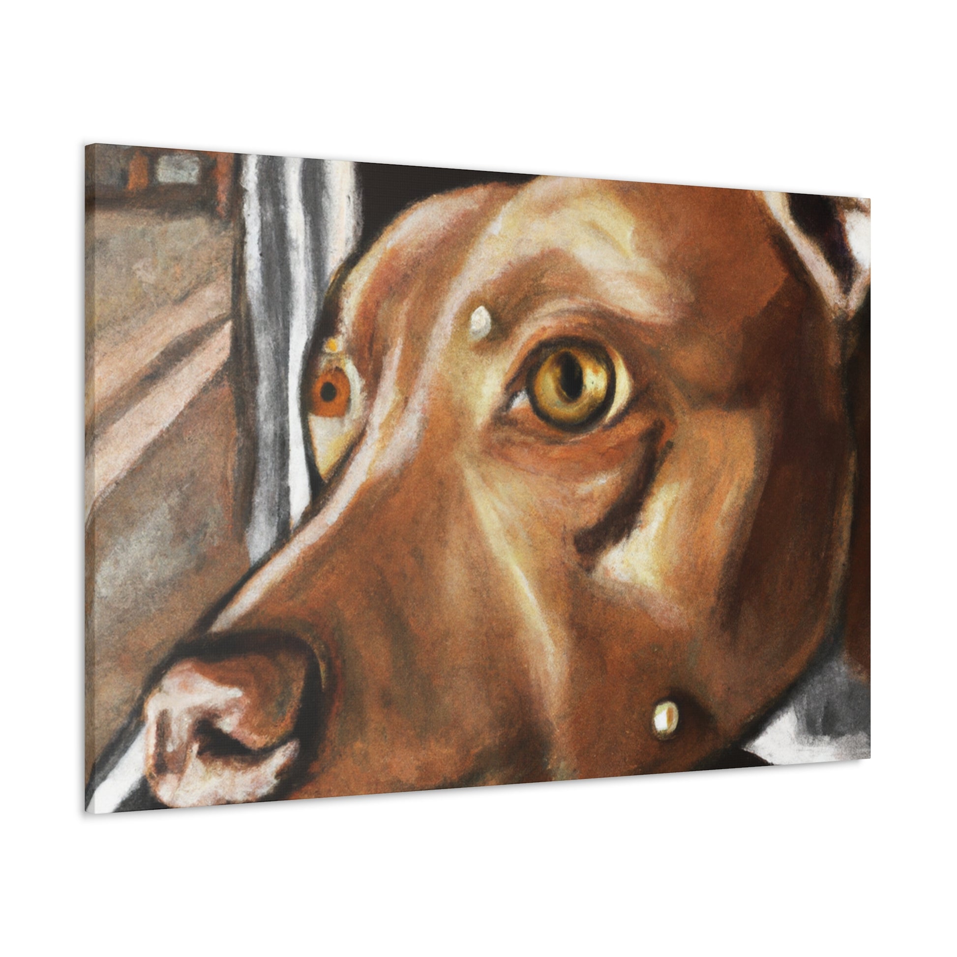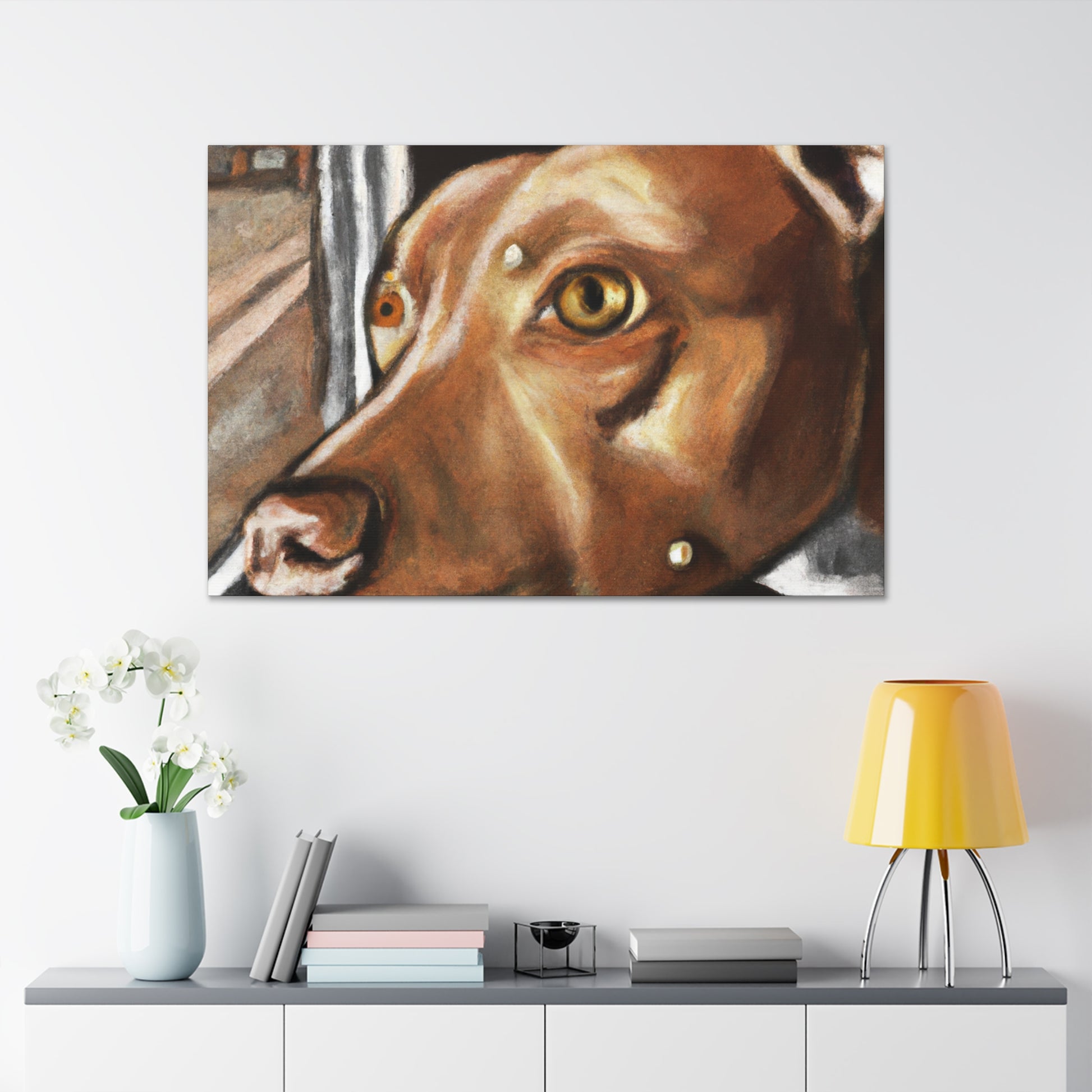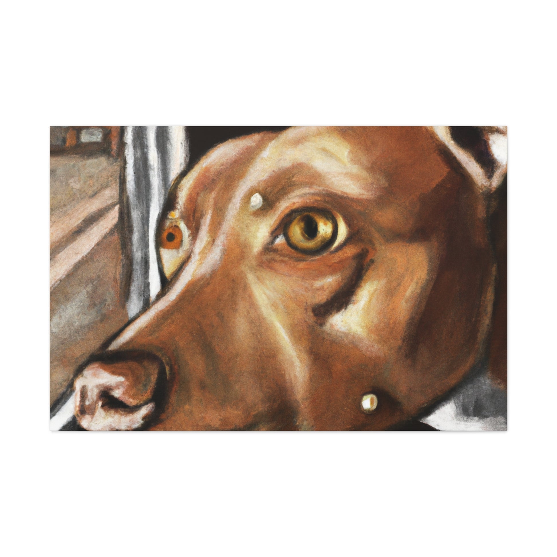 This abstract painting on canvas features a young brown pit bull with lots of life in his eyes, looking longingly out the window. The painting features a clear depiction of the dog, while the other elements of the painting are presented in a vibrant, dreamy manner. Explore your own interpretation of the painting as it allows for countless stories. Bring a touch of class to your home decor. #AbstractPainting #PitBull #Canvas #HomeDecor #YoungPitBull #WindowFrame #DreamyPainting #ModernArt #ModernDecor #Interpretation #VibrantPainting
