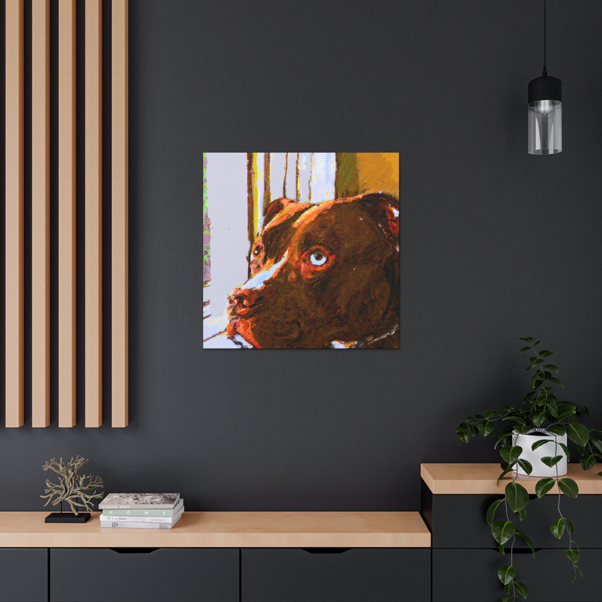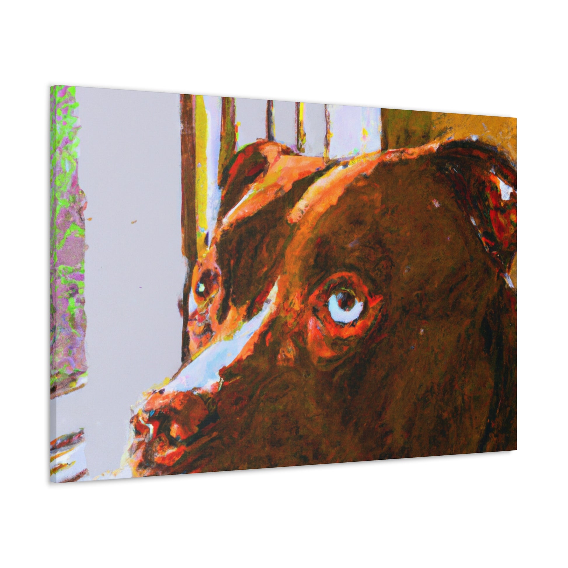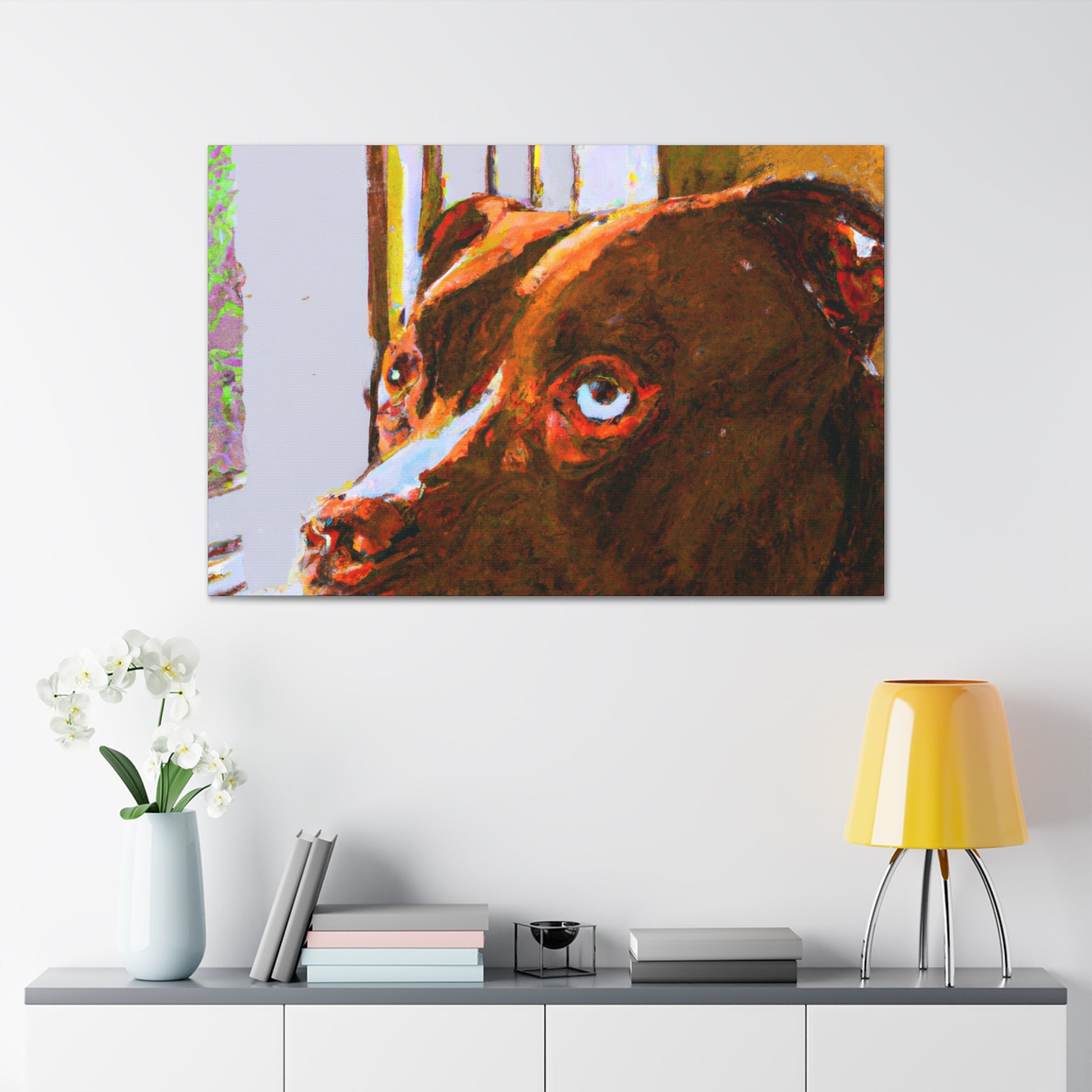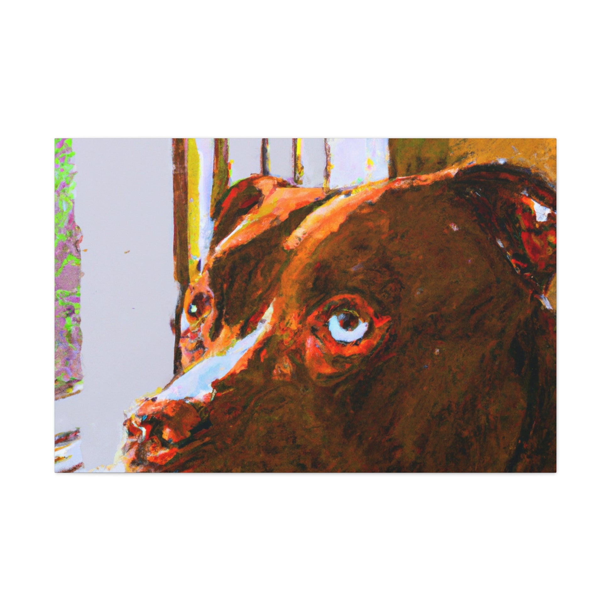 This stunning portrait of a soulful young brown pitbull features a unique interpretation and modern twist of classic abstraction. Bold, trippy colors brings to life the dreamy look in the dog's eyes as he stares out the window. Captivating and inspiring, this canvas is guaranteed to become the centerpiece of any wall. #Art #AbstractPainting #Canvas #Pitbull #YoungDog #DogArt #SoulfulPet #Modern #Trippy #Colors #Inspiring