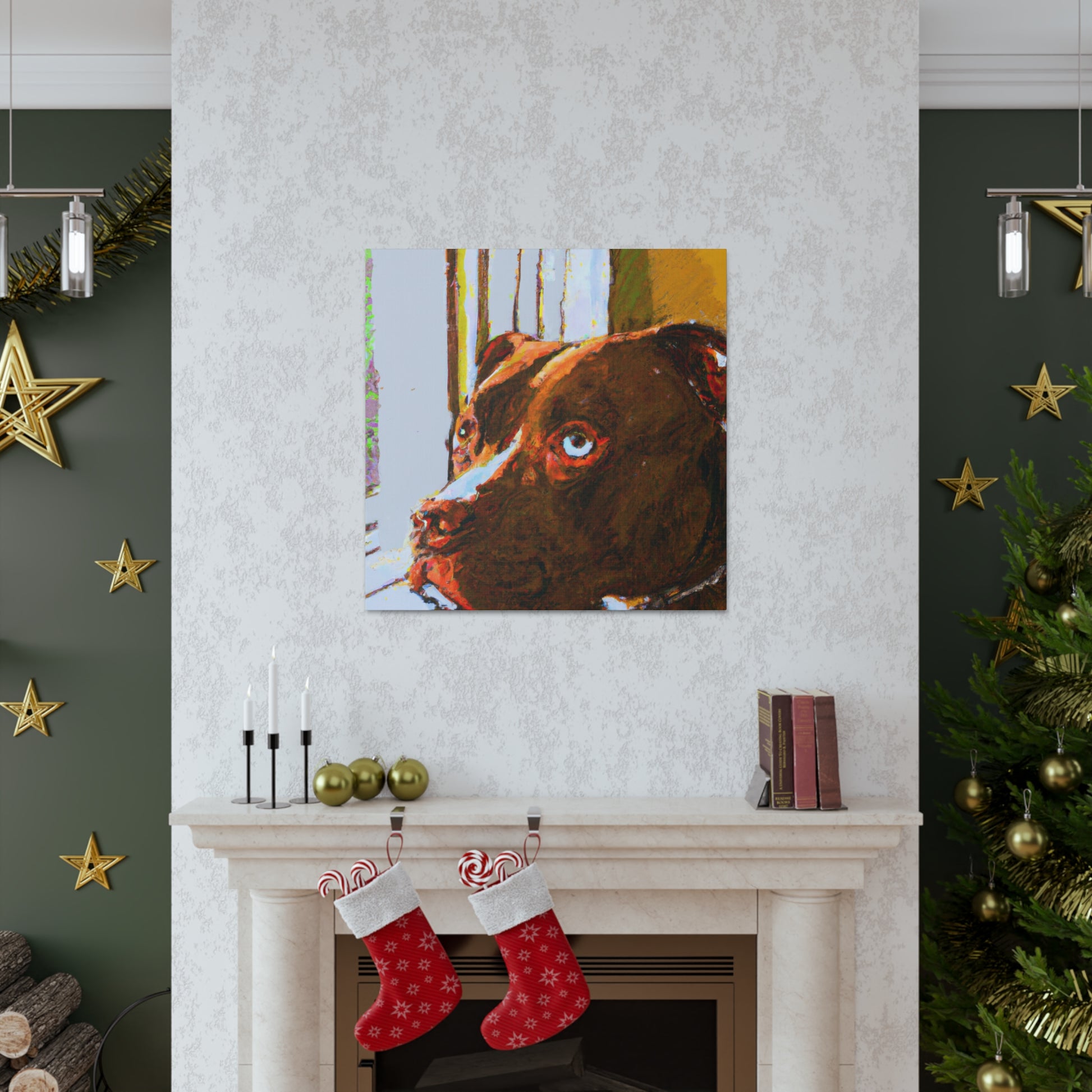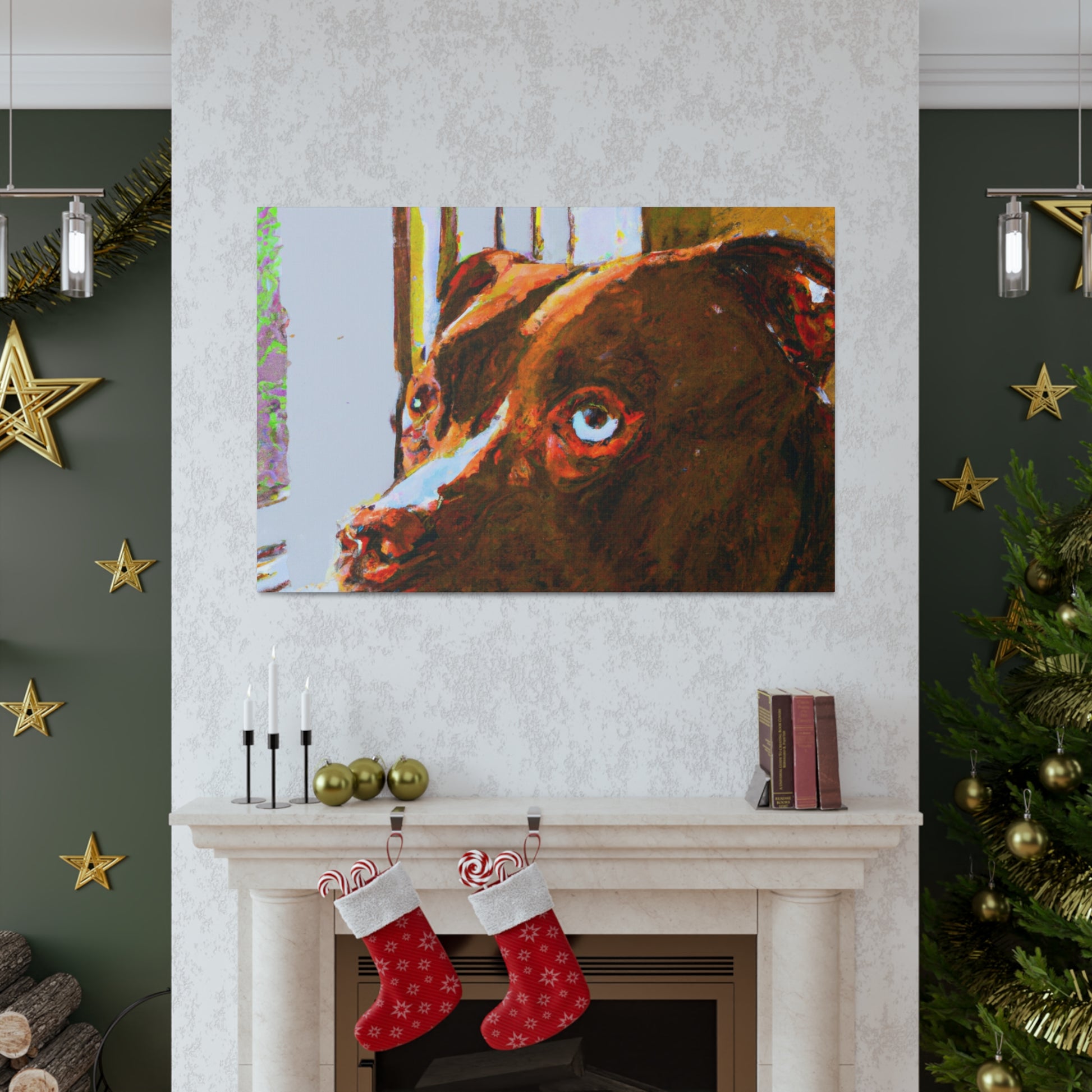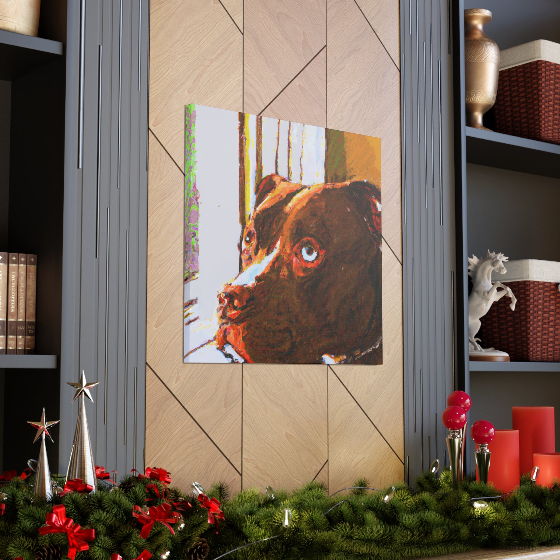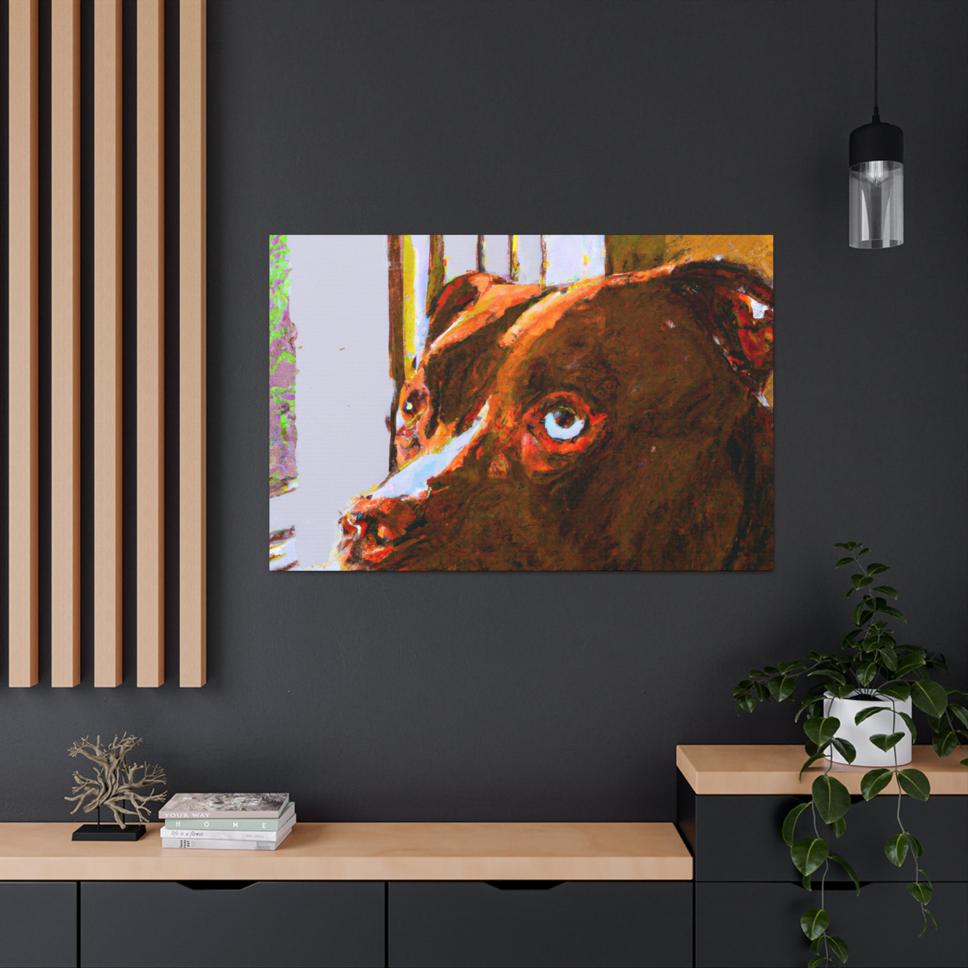This stunning portrait of a soulful young brown pitbull features a unique interpretation and modern twist of classic abstraction. Bold, trippy colors brings to life the dreamy look in the dog's eyes as he stares out the window. Captivating and inspiring, this canvas is guaranteed to become the centerpiece of any wall. #Art #AbstractPainting #Canvas #Pitbull #YoungDog #DogArt #SoulfulPet #Modern #Trippy #Colors #Inspiring