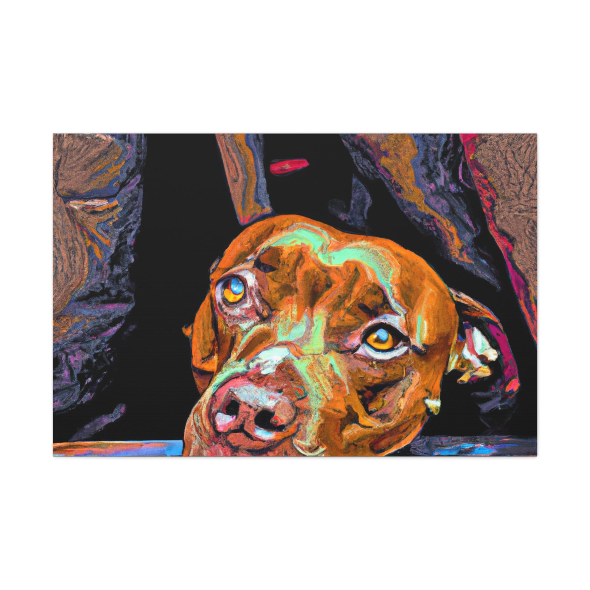 This abstract canvas painting will take your breath away! Our master artisan brilliantly crafted this art to bring emotion and life to each viewer. It features a young brown pit bull, whose clear and intense gaze out of the window will captivate and warm the heart of everyone in the room. The mix of vibrant and intense colors in the background make this piece an eye-catching and sophisticated wall décor. #abstract #art #canvas #canvaspainting #painting #dog #youngdog #dogwindow #brownpittbull #vibrantshades #emotionalart #sophisticateddecor #poeticbeauty