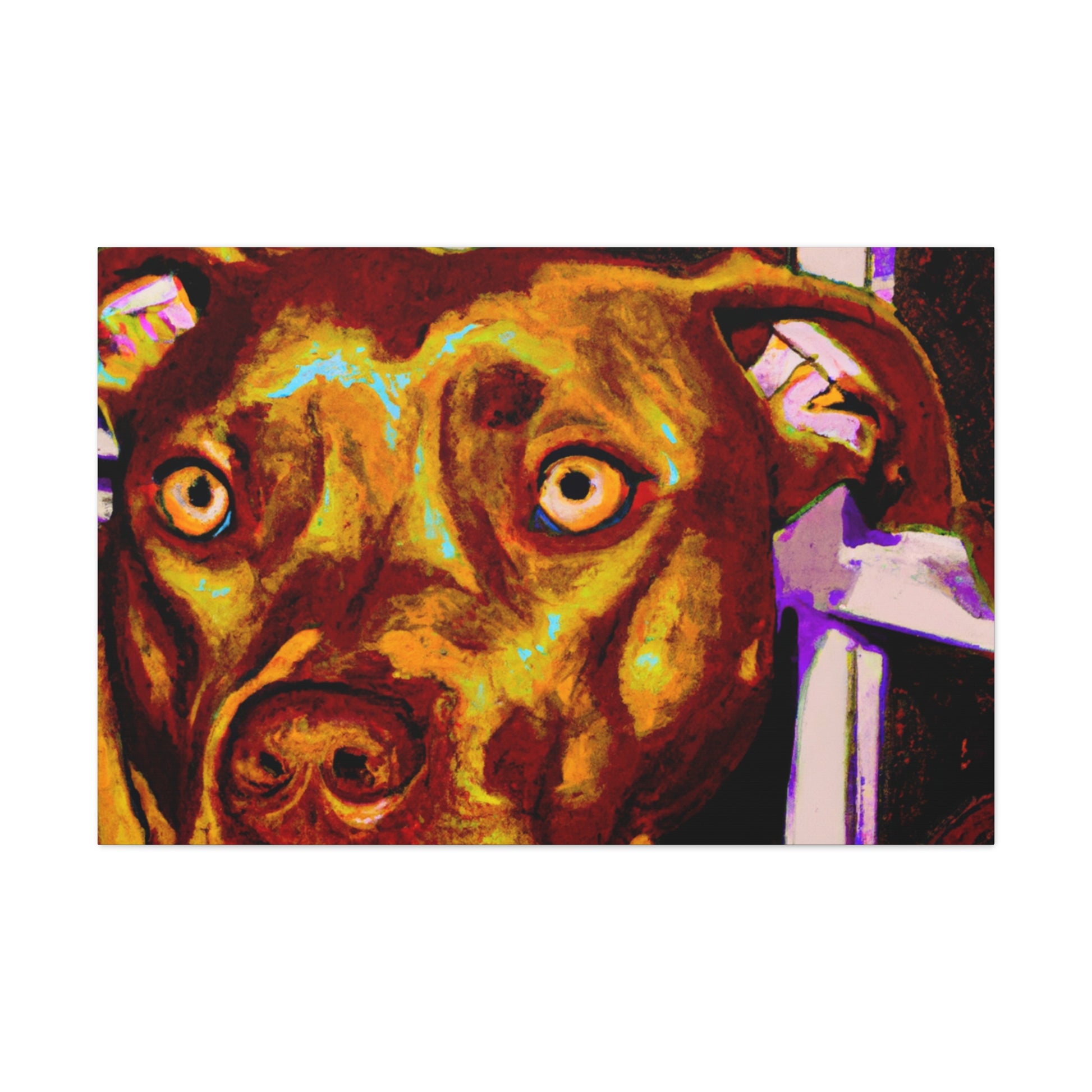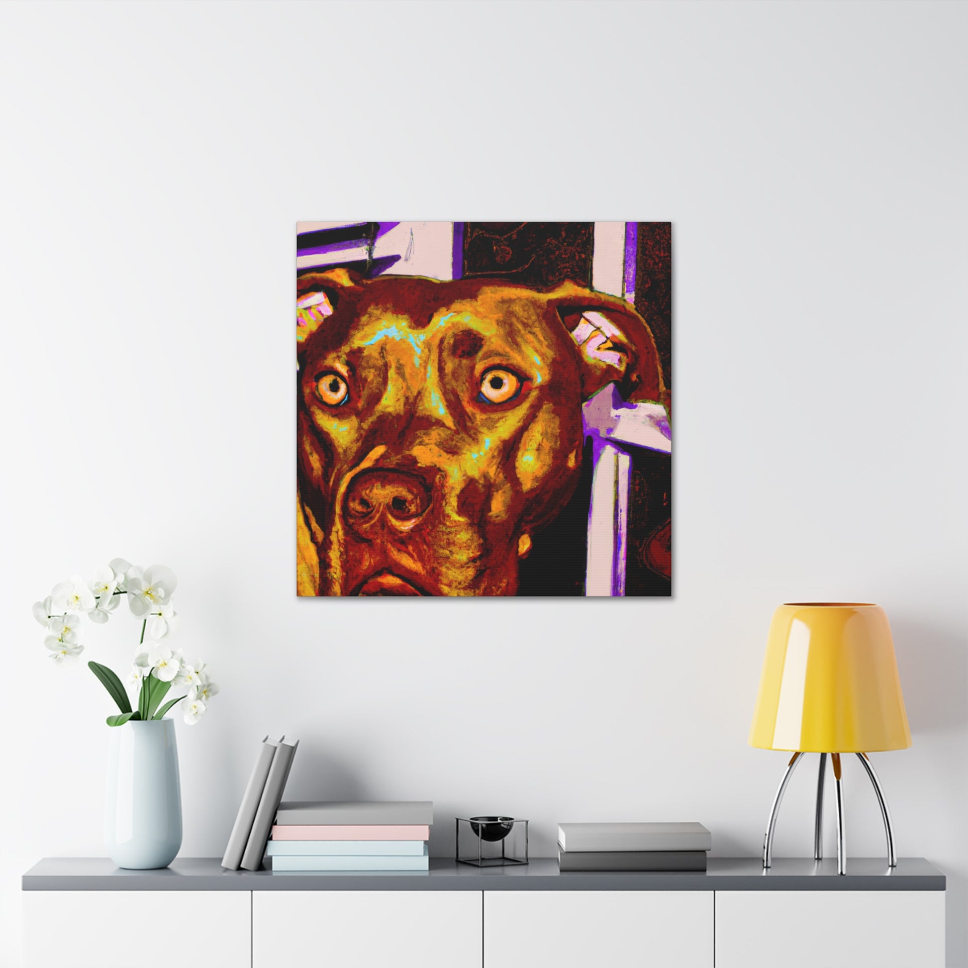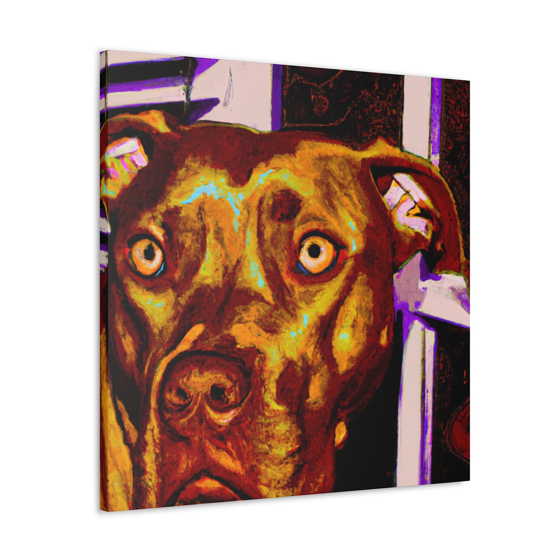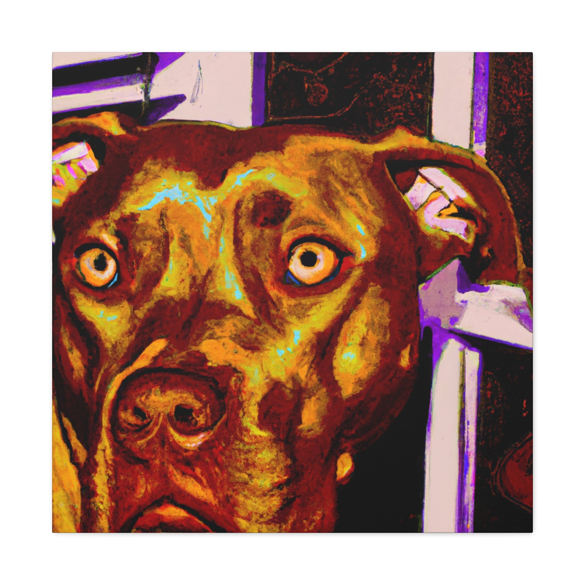 Introducing 'Longing', a unique abstract painting featuring a young brown pit bull looking longingly out the window. With a clear sight of life in his eyes, the canvas is made even more exciting with its trippy design and colors. Hang this modern artwork in your home and be inspired by the dog's longing. #abstract #trippy #pitbull #canvas #modern #brown #dog #unique #young #longing #painting