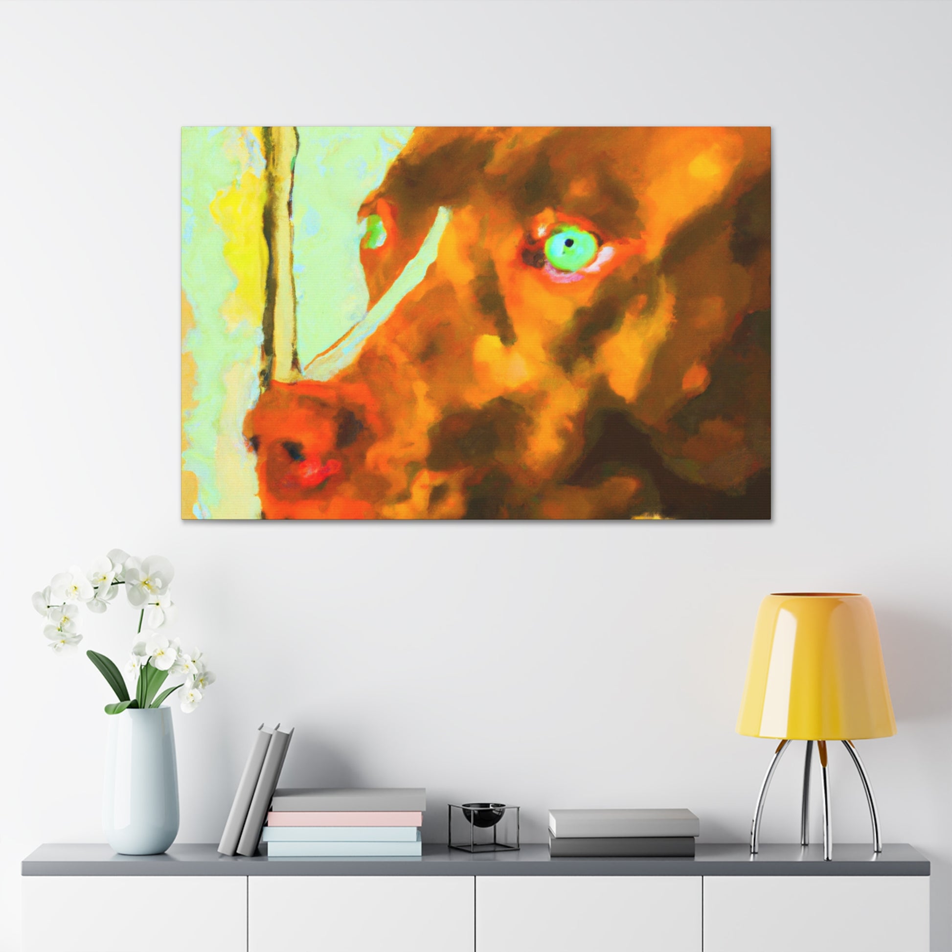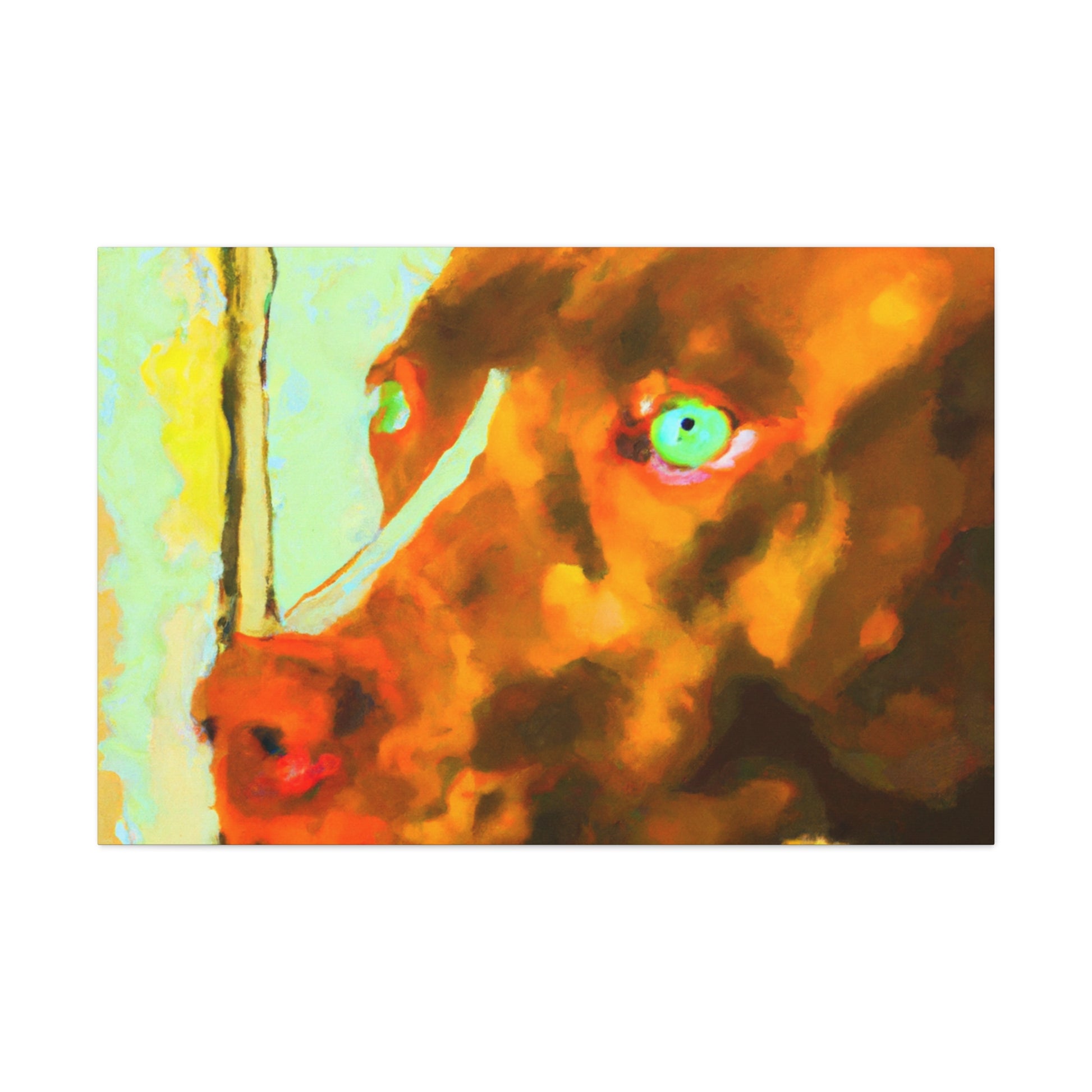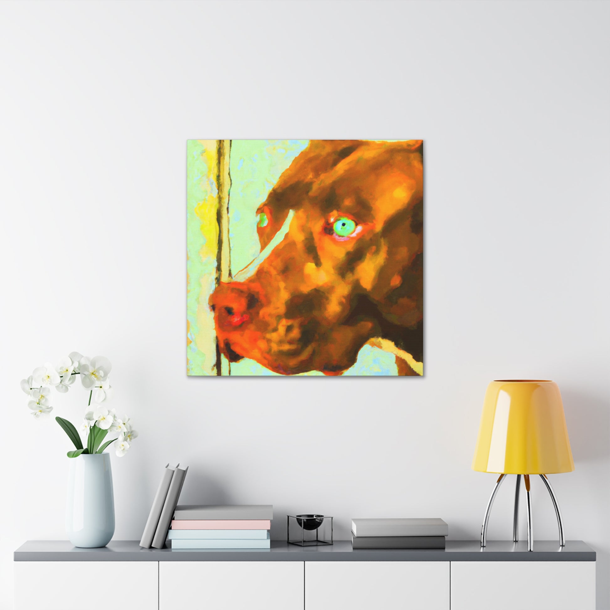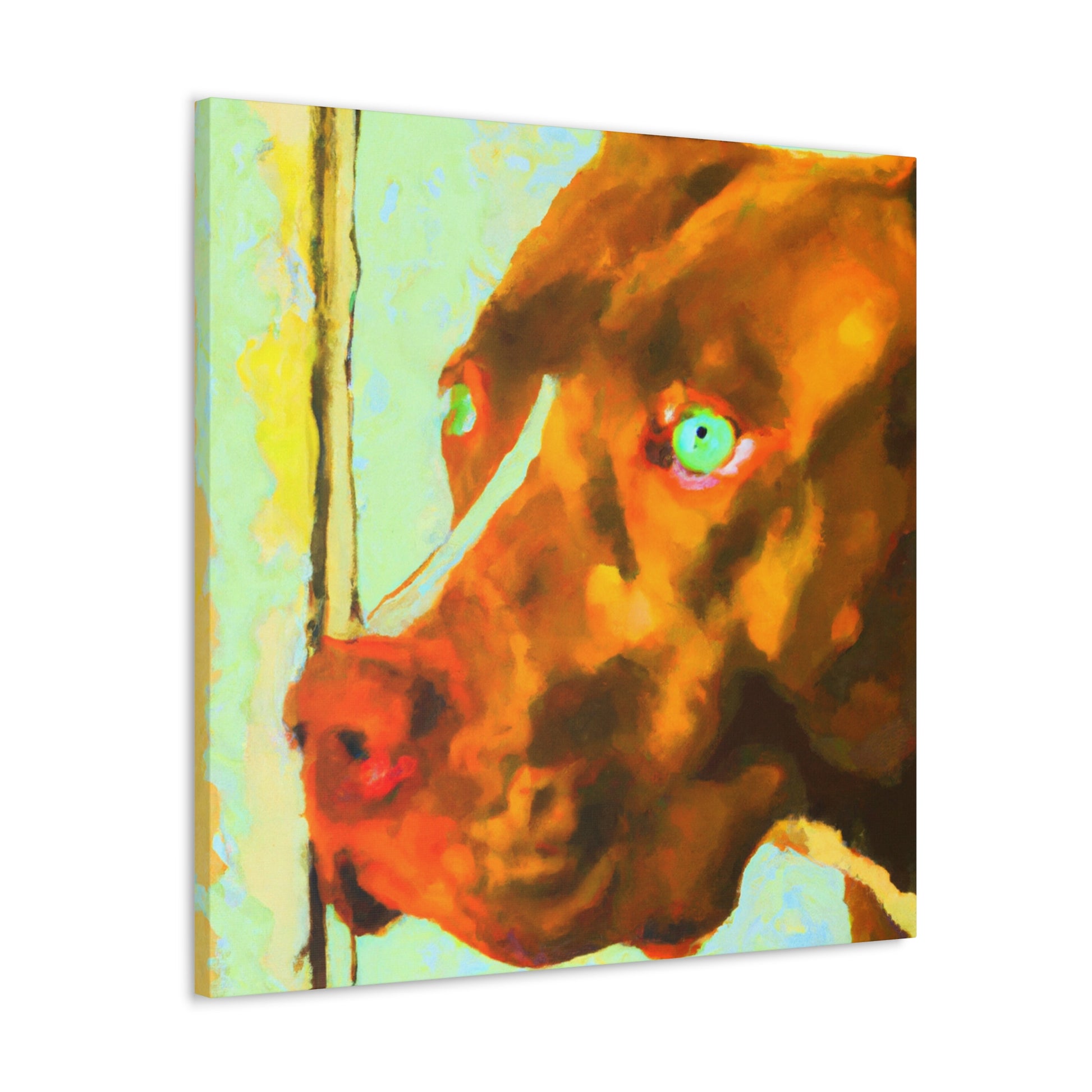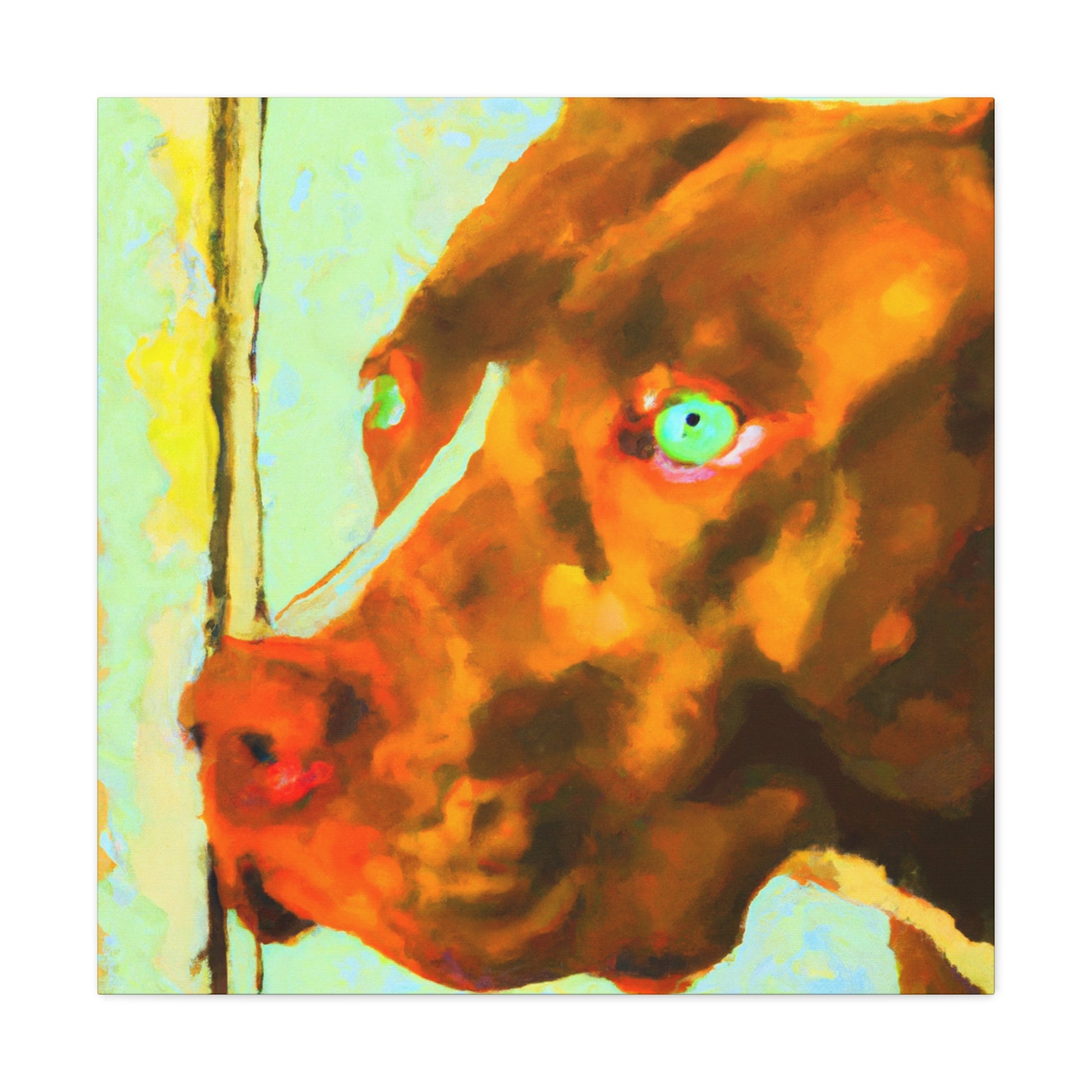 This captivatingly beautiful, contemporary abstract painting of a young brown pit bull looking out of the window poignantly captures all the life in his eyes. The colors swirl around the sweet pup, creating a uniquely psychedelic yet classy look. Own a piece of history and bring an unforgettable energy to any room. #dogart #canvasart #abstractpainting #painting #modernart #doglovers #pittie #brownpup #mixedmedia #nostalgia #contemporaryart