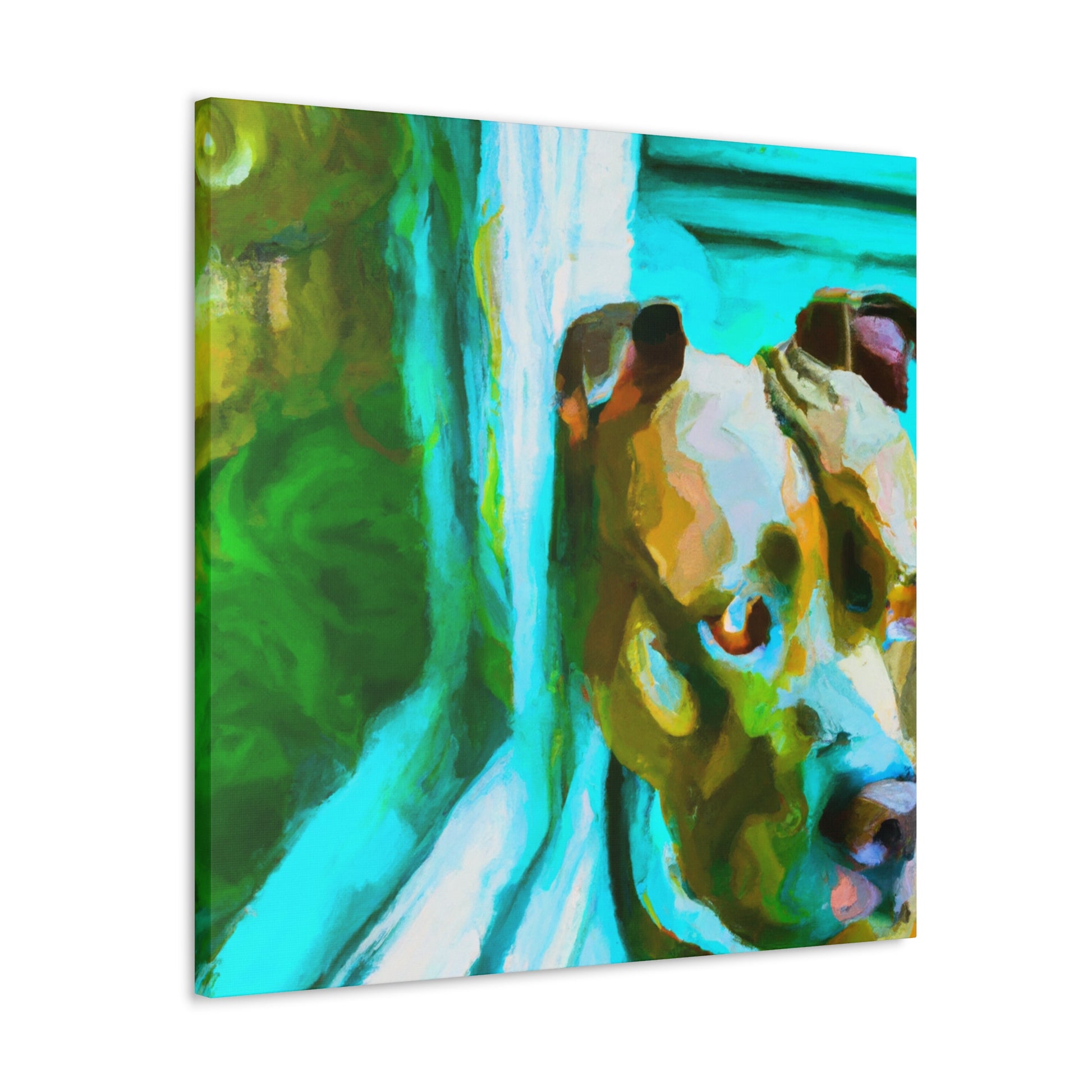 This abstract painting features a young brown pitbull looking wistfully out of a window, with his characteristic life in his eyes. The canvas is artistically designed to have all but the young pup distorted, adding a trippy twist to its modern look. This sophisticated piece adds a unique, special touch to any decor, and is sure to bring out the life in any room! #abstractpainting #canvas #visualart #pitbull #modernart #homedecor #puppy #scenery #eye #affection #window #longing