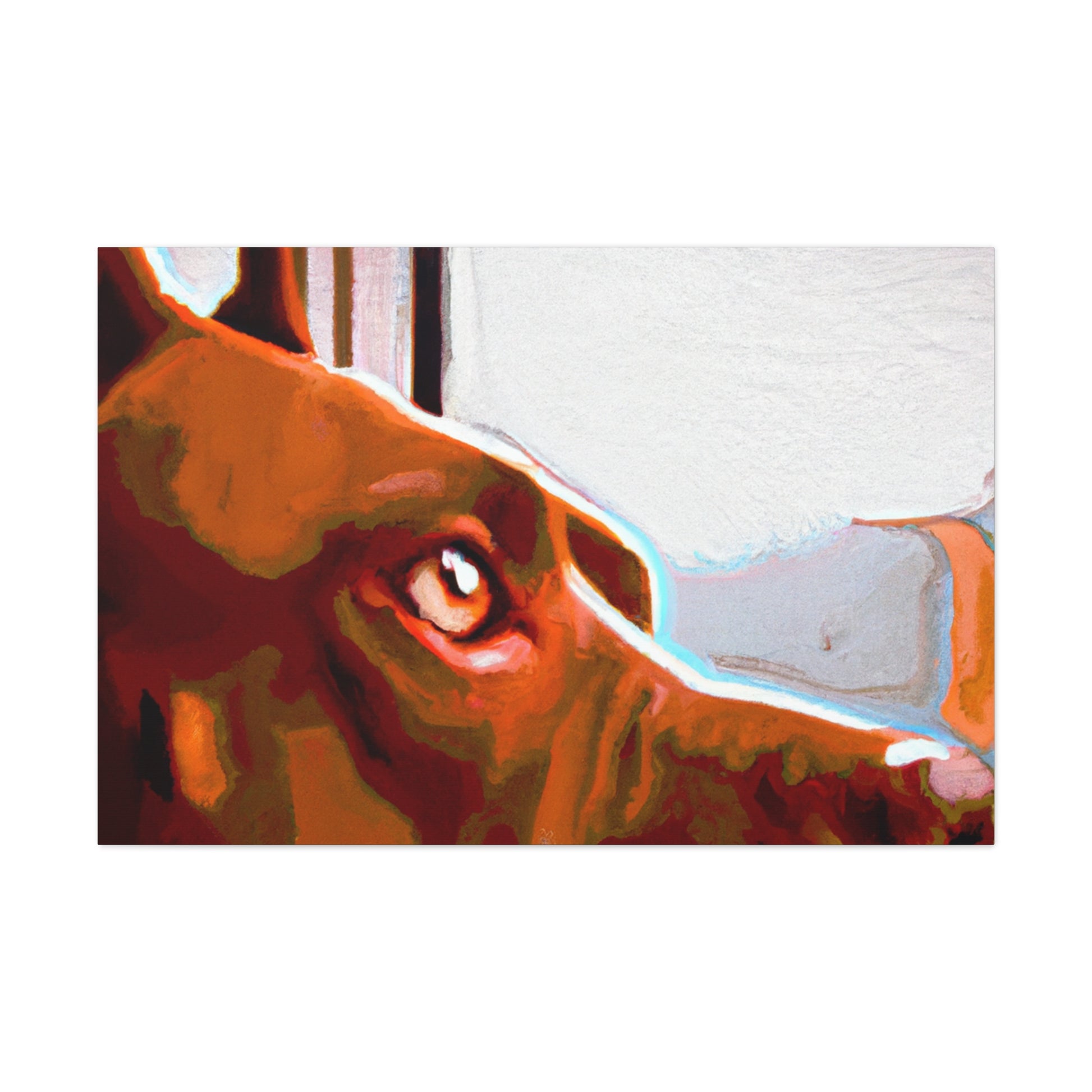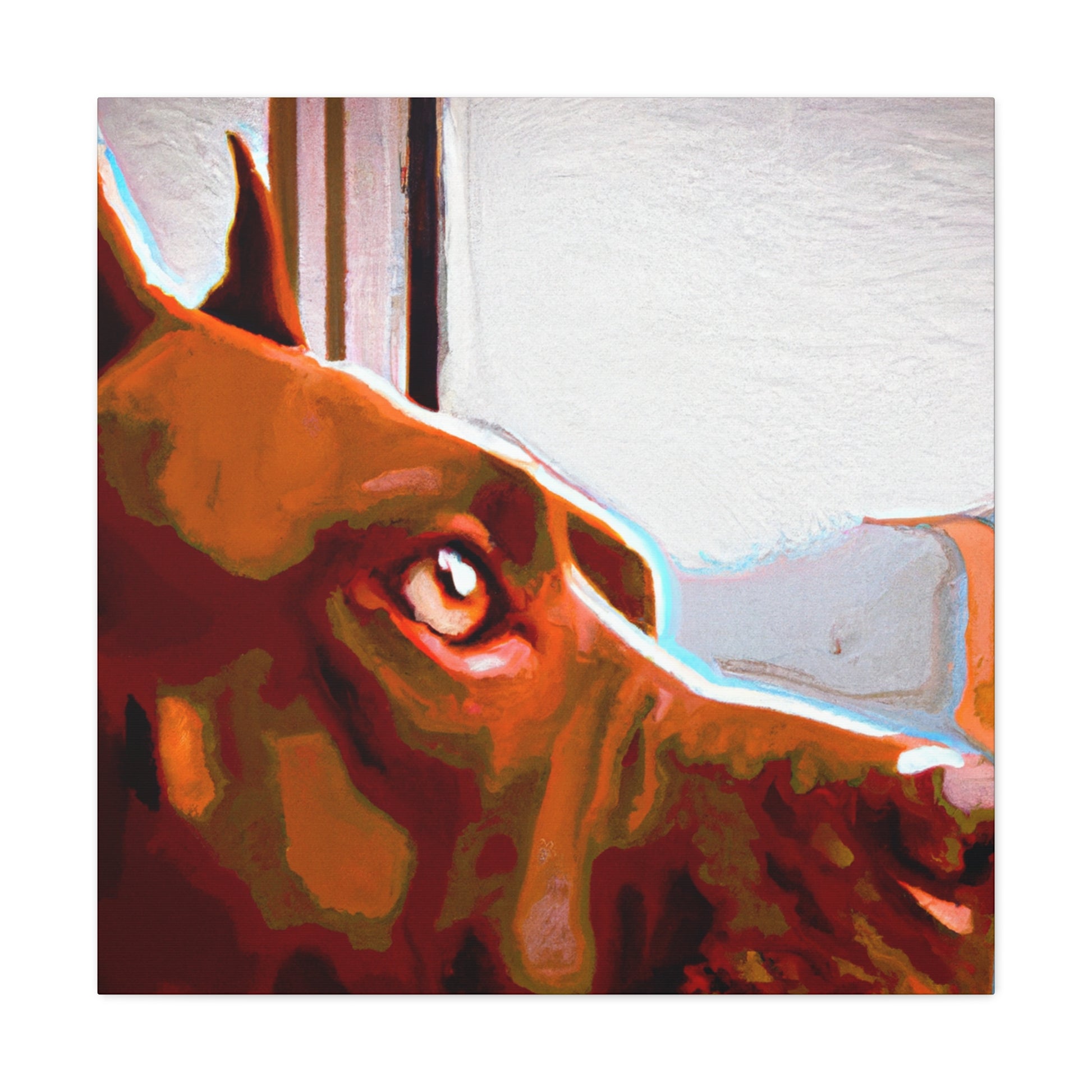 This one-of-a-kind abstract painting features a young brown pit bull gazing out of a rainbow, geometric dreamscape. With life in his eyes, the canine is the only part of the painting that is not trippy. Vibrant colors and an incredible level of detail make this piece stylish and truly unique. #abstractart #animalpainting #canvas #dogart #youngdog #trippyart #vibrantcolors #styleandclass #geometricscape #dreamscape #rainbow