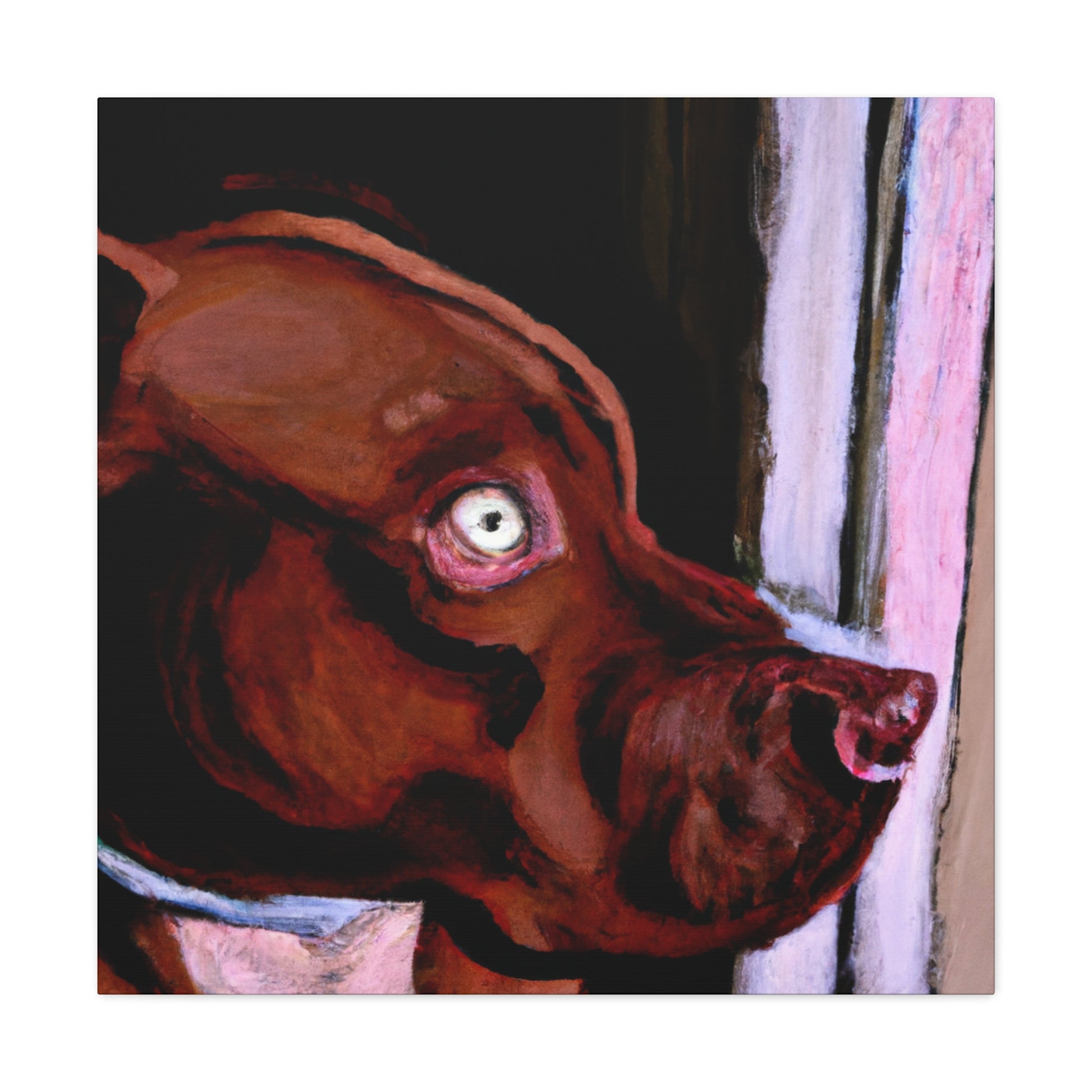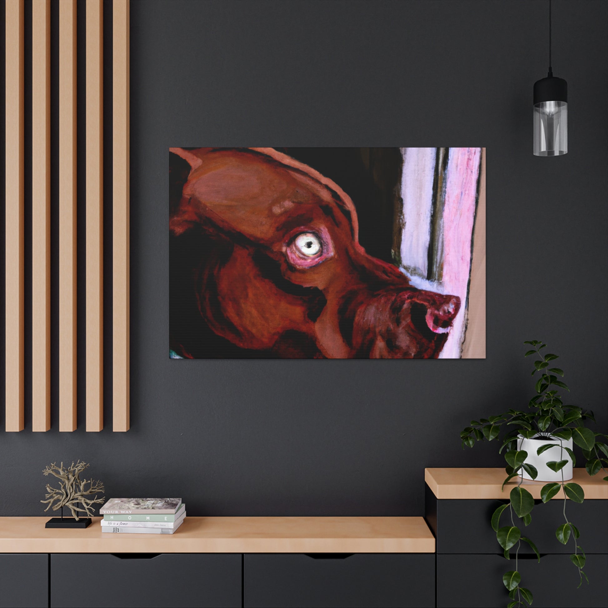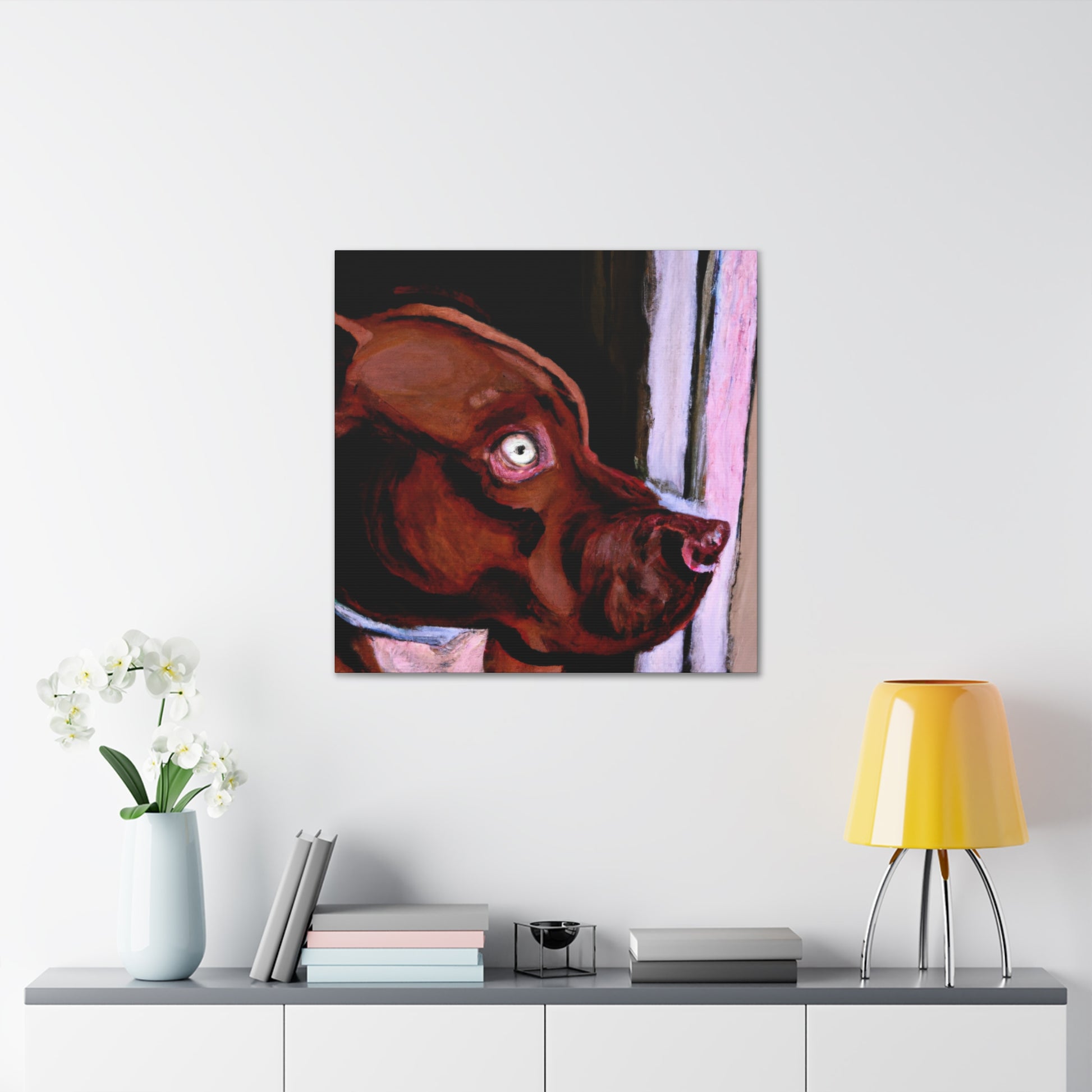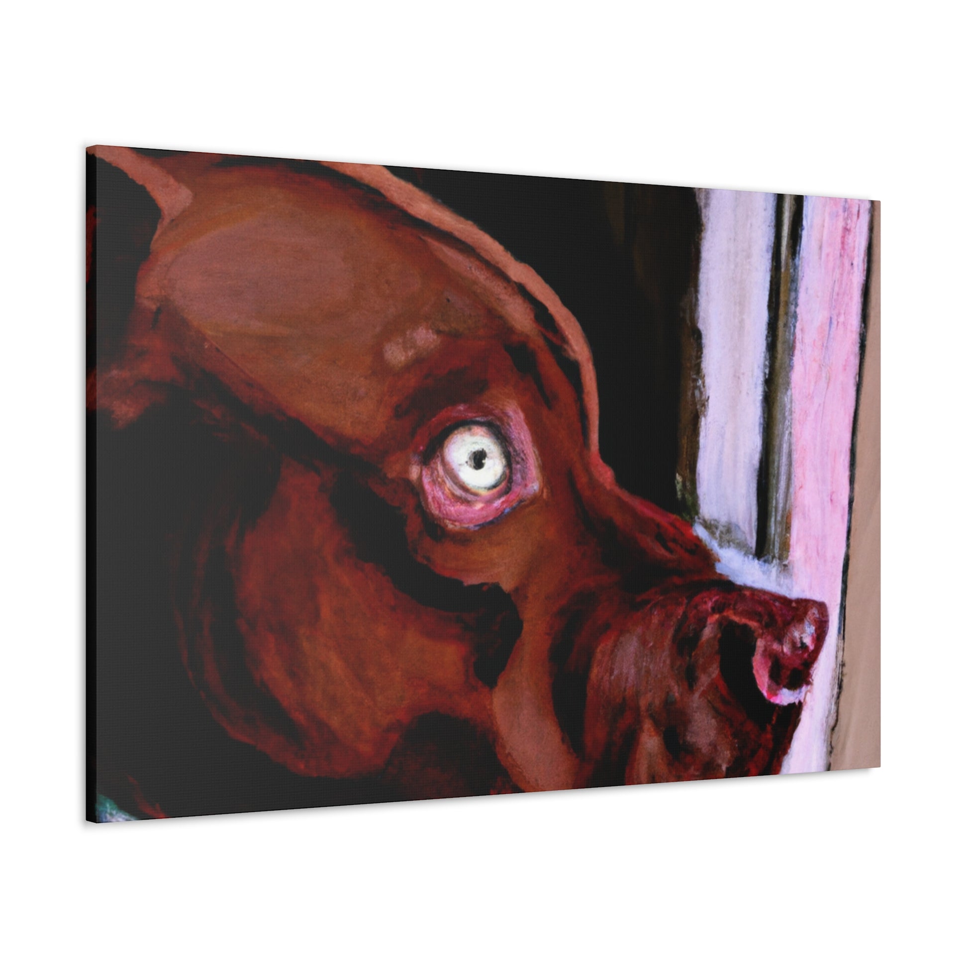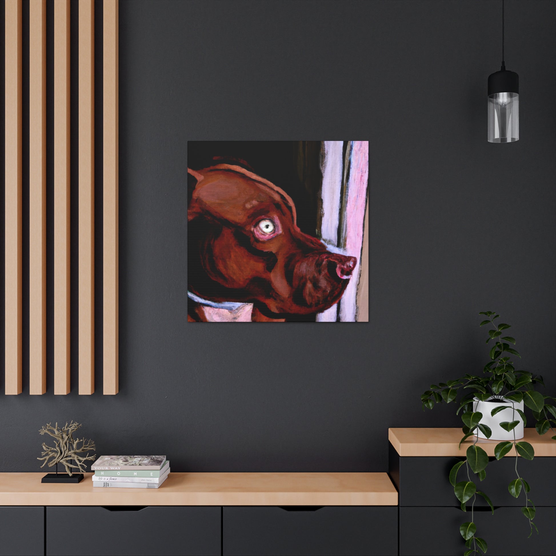 This lively abstract painting of a young brown pit bull looking longingly out the window is an exciting choice for any wall. Drawing the eye with vibrant colors and bold strokes, the canine subject is the highlight. The backdrop of the piece comes alive with a unique blend of colors and shapes, while the dog stands out in clarity. Capturing energy and emotion in a contemporary canvas, this stunning piece is perfect for an artful wall display. #canvas #canvasart #painting #interior #art #decor #abstract #dog #doglife #wallart #wallhanging