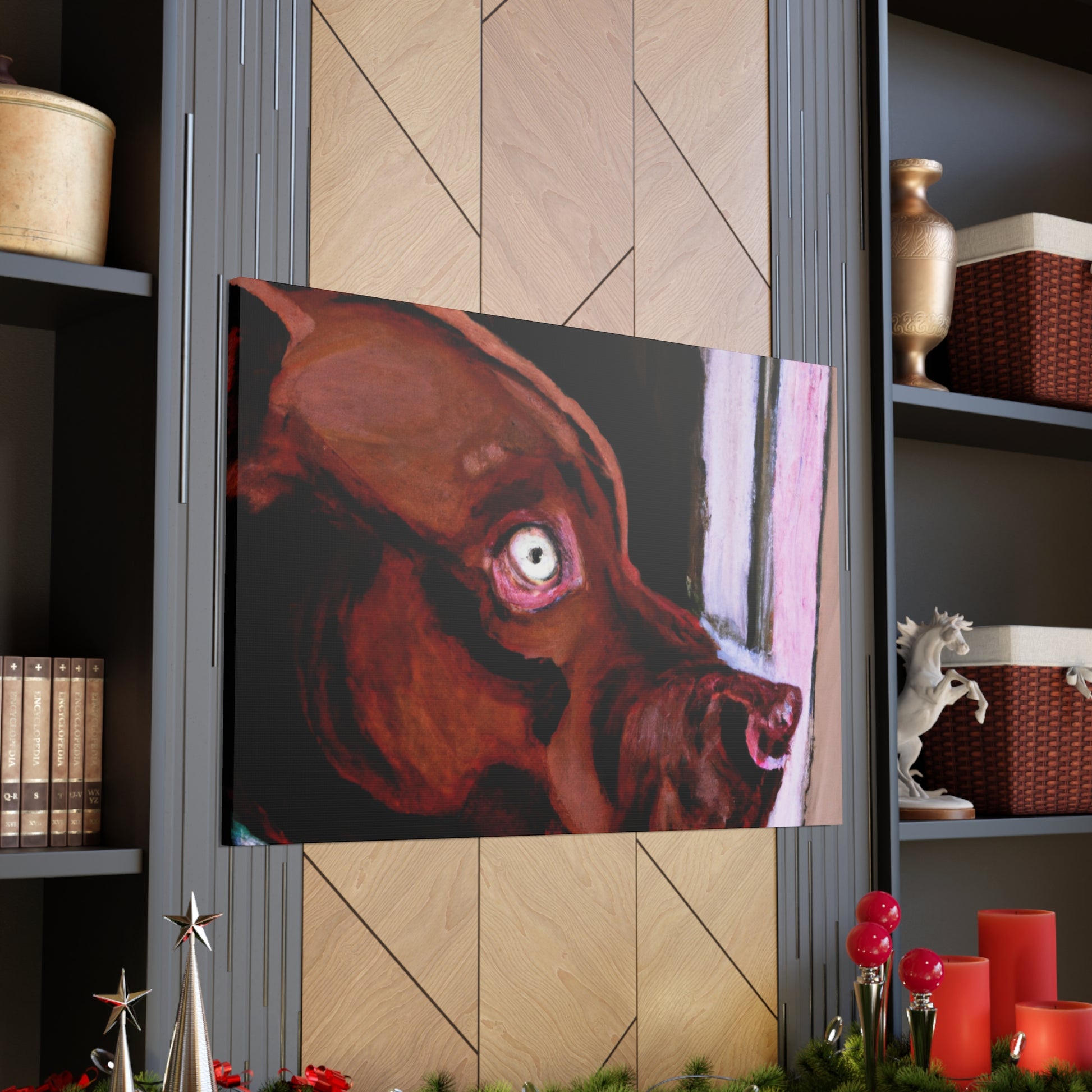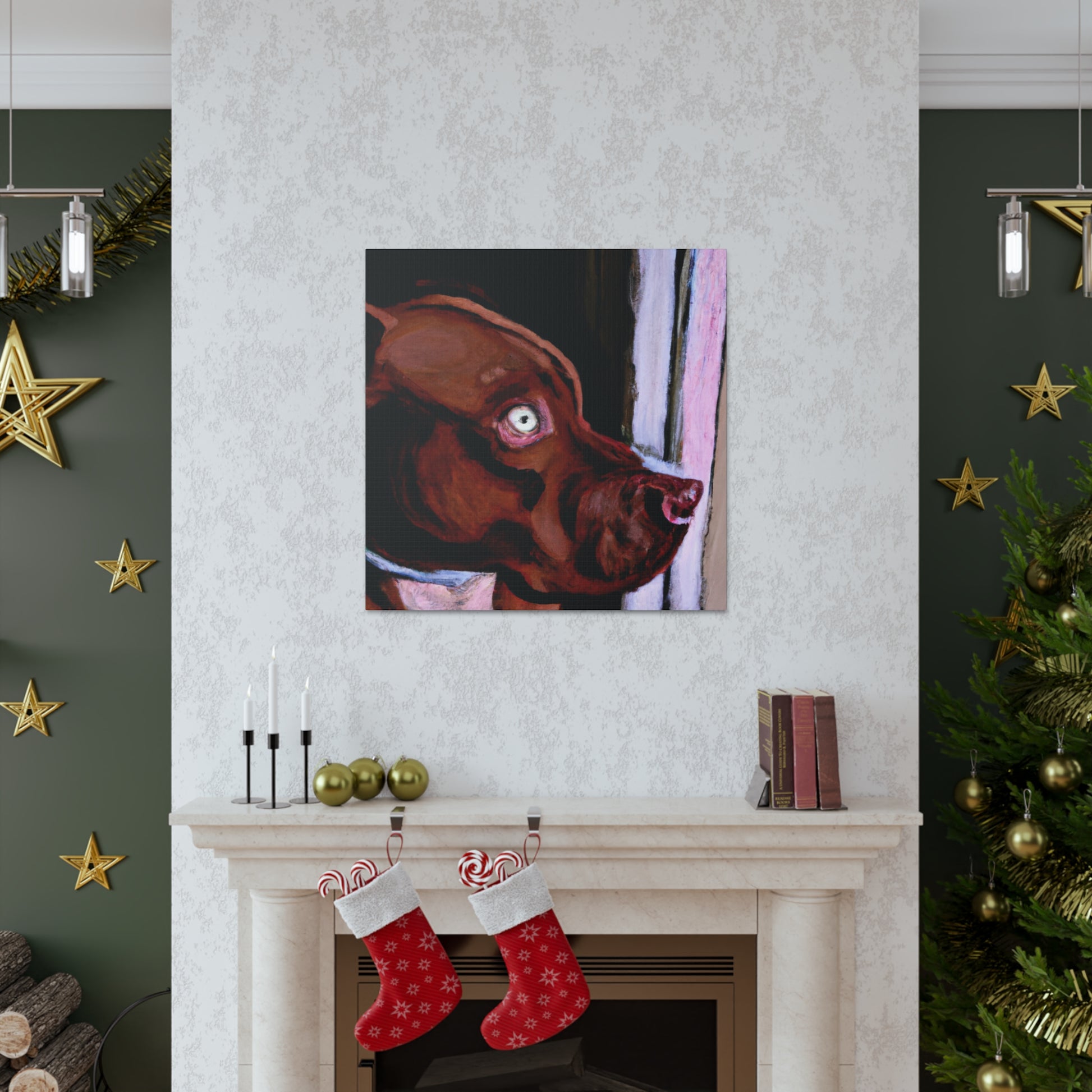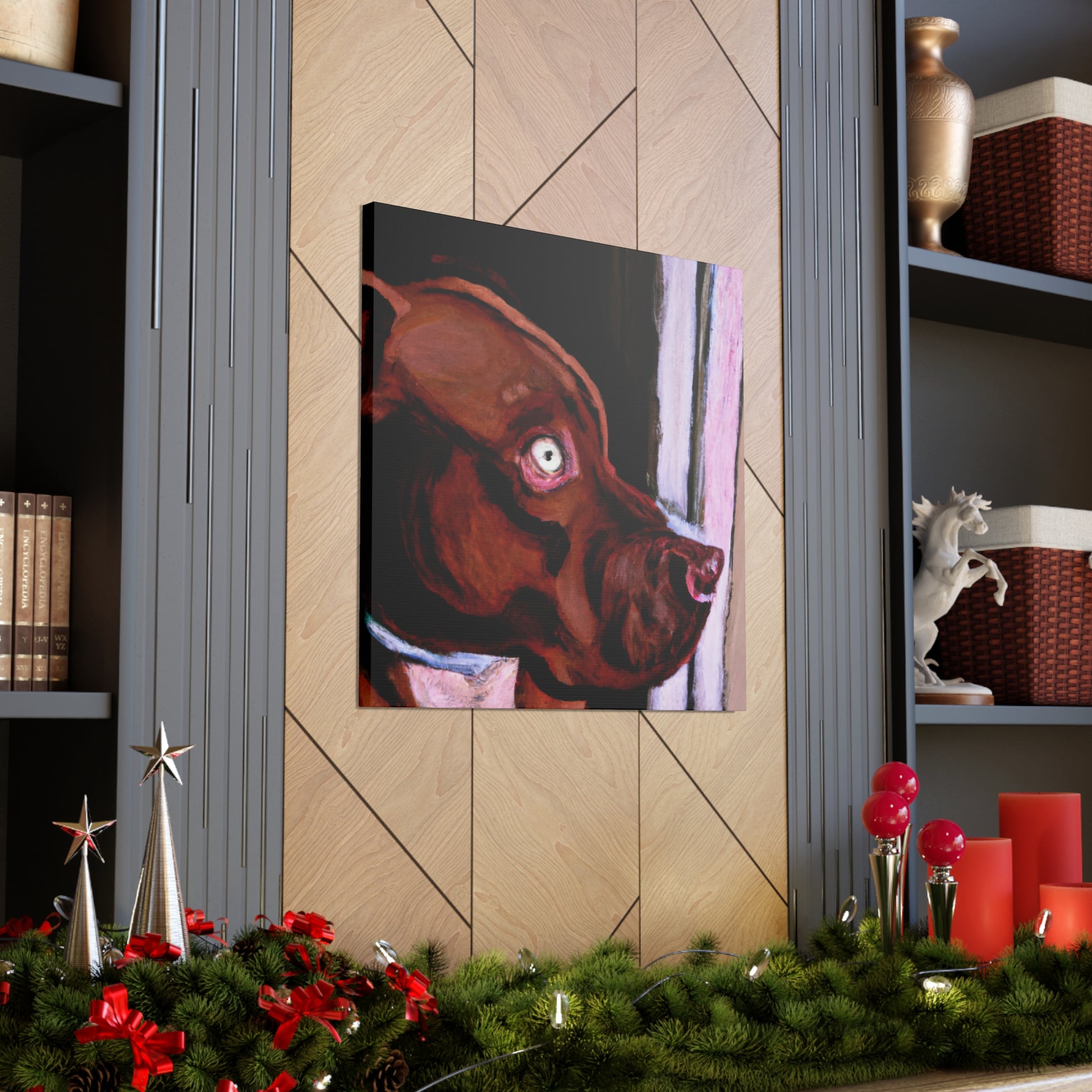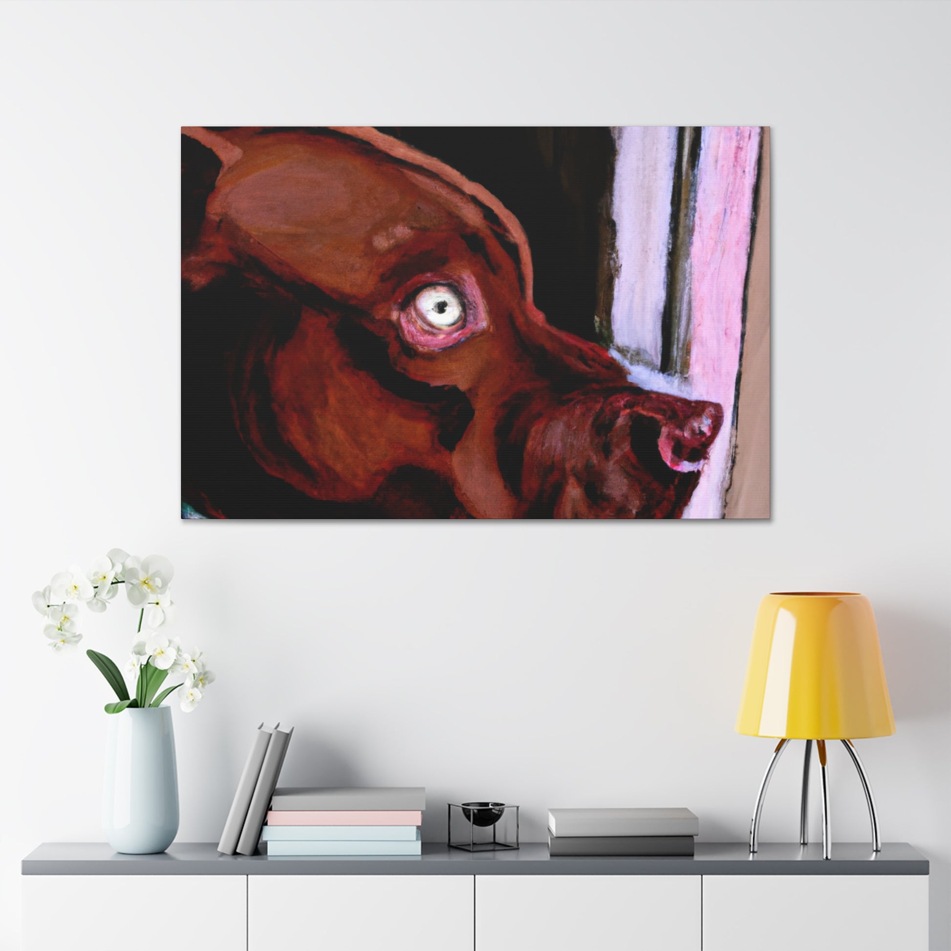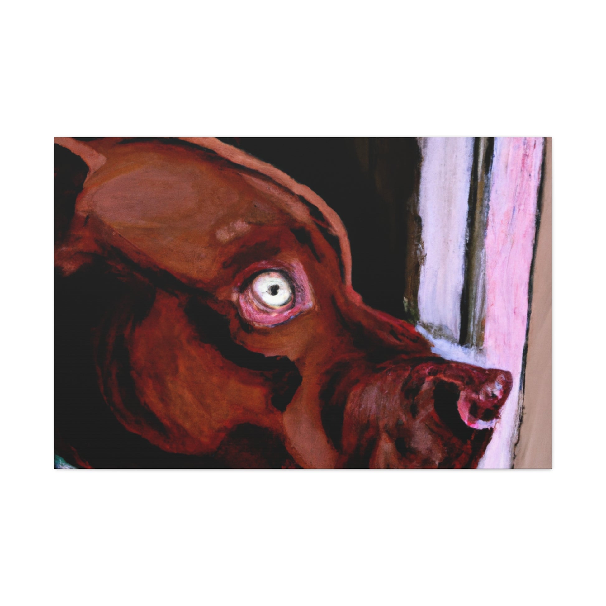 This lively abstract painting of a young brown pit bull looking longingly out the window is an exciting choice for any wall. Drawing the eye with vibrant colors and bold strokes, the canine subject is the highlight. The backdrop of the piece comes alive with a unique blend of colors and shapes, while the dog stands out in clarity. Capturing energy and emotion in a contemporary canvas, this stunning piece is perfect for an artful wall display. #canvas #canvasart #painting #interior #art #decor #abstract #dog #doglife #wallart #wallhanging