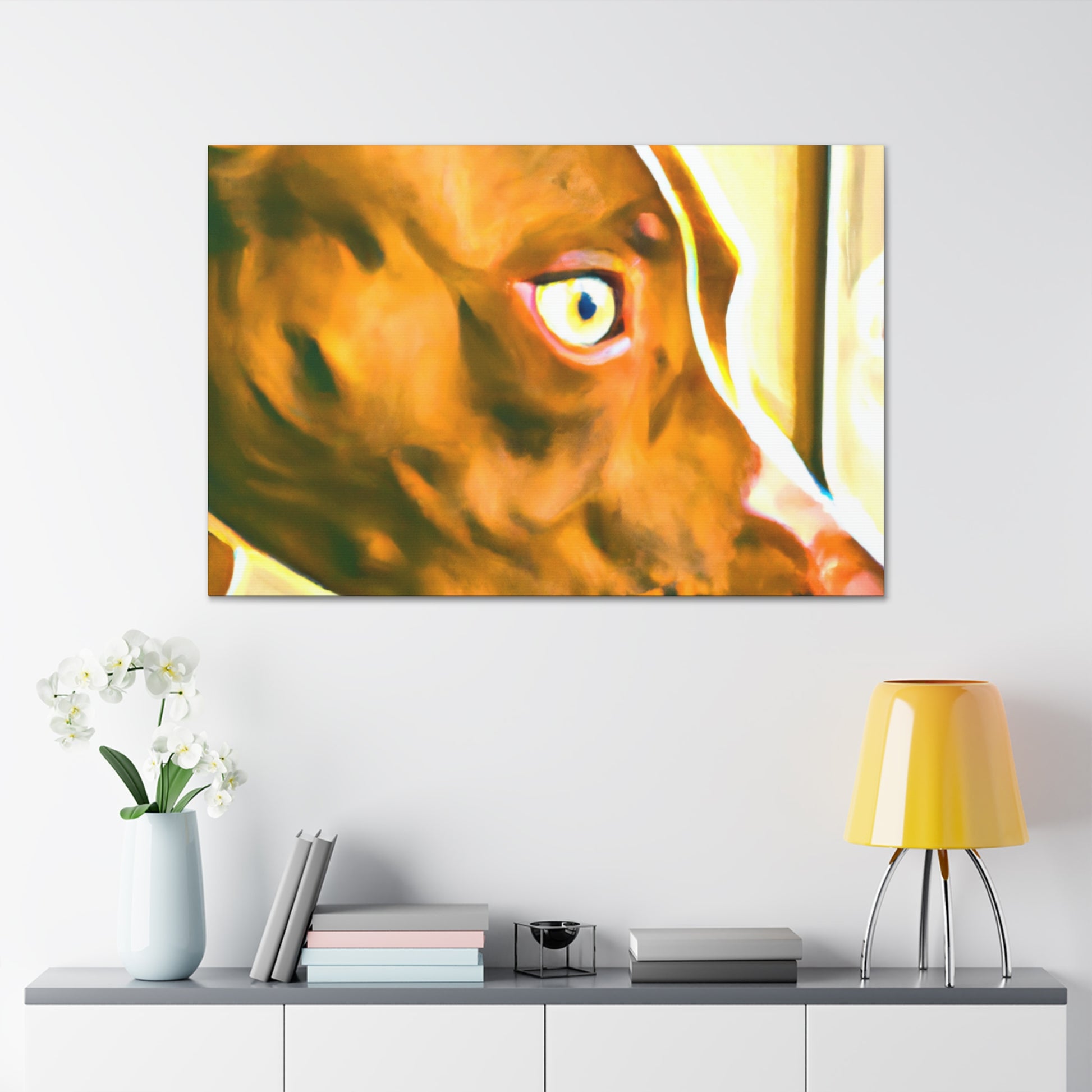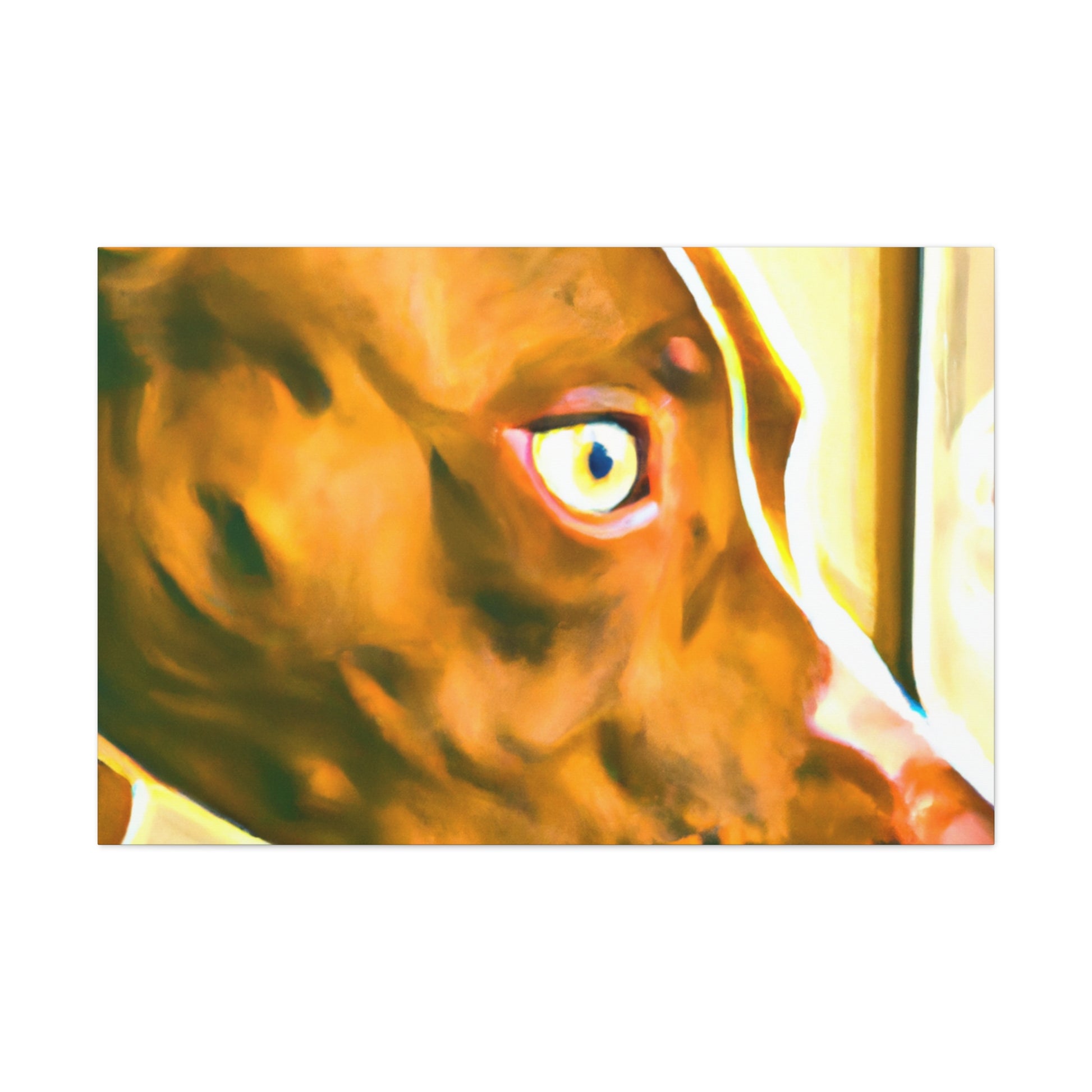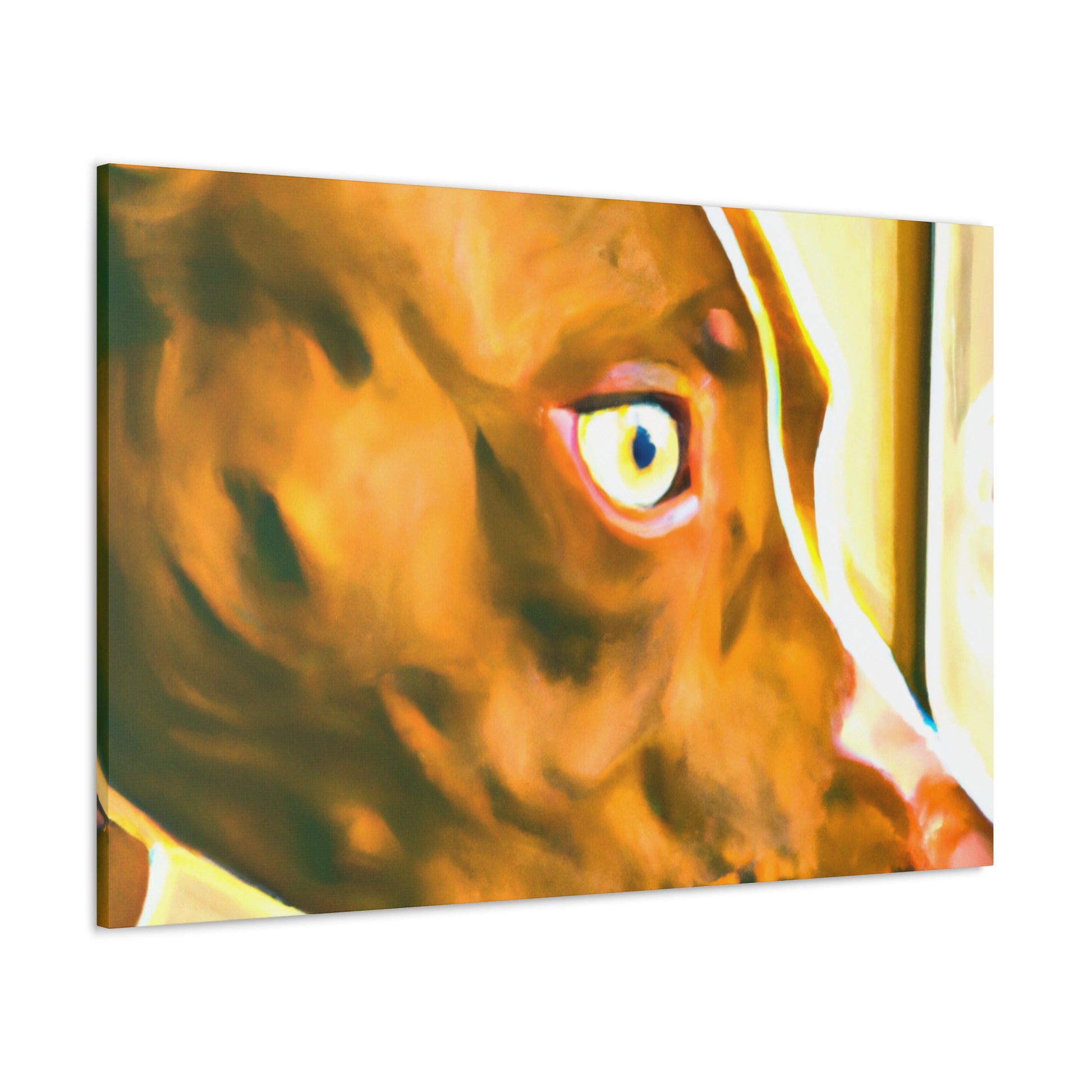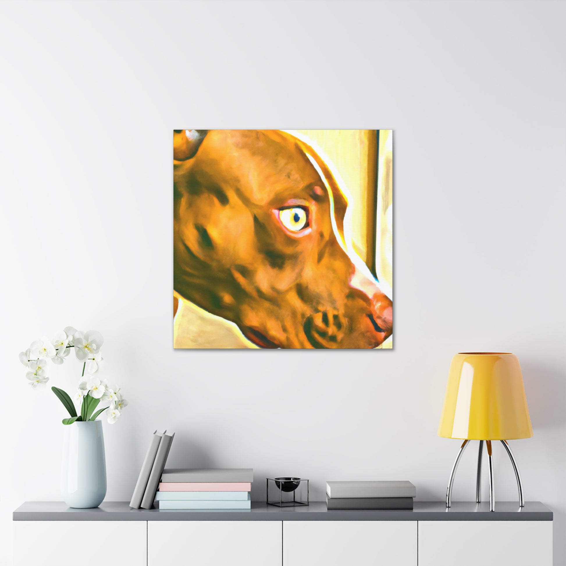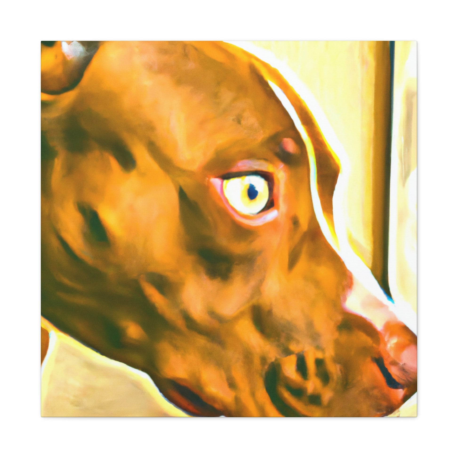 This eye-catching abstract canvas is sure to brighten any room! The painting is filled with waving shapes and colors, all coordinating to draw out the life in the eyes of the young brown pit bull looking out the window. Perfect for art connoisseurs or pet lovers, hang this painting to give your space the perfect mix of energy and serenity. #abstractart #canvasart #dogart #petart #homedecor #abstractpainting #paintings #brownpitbull #doglovers #contemporaryart #modernart