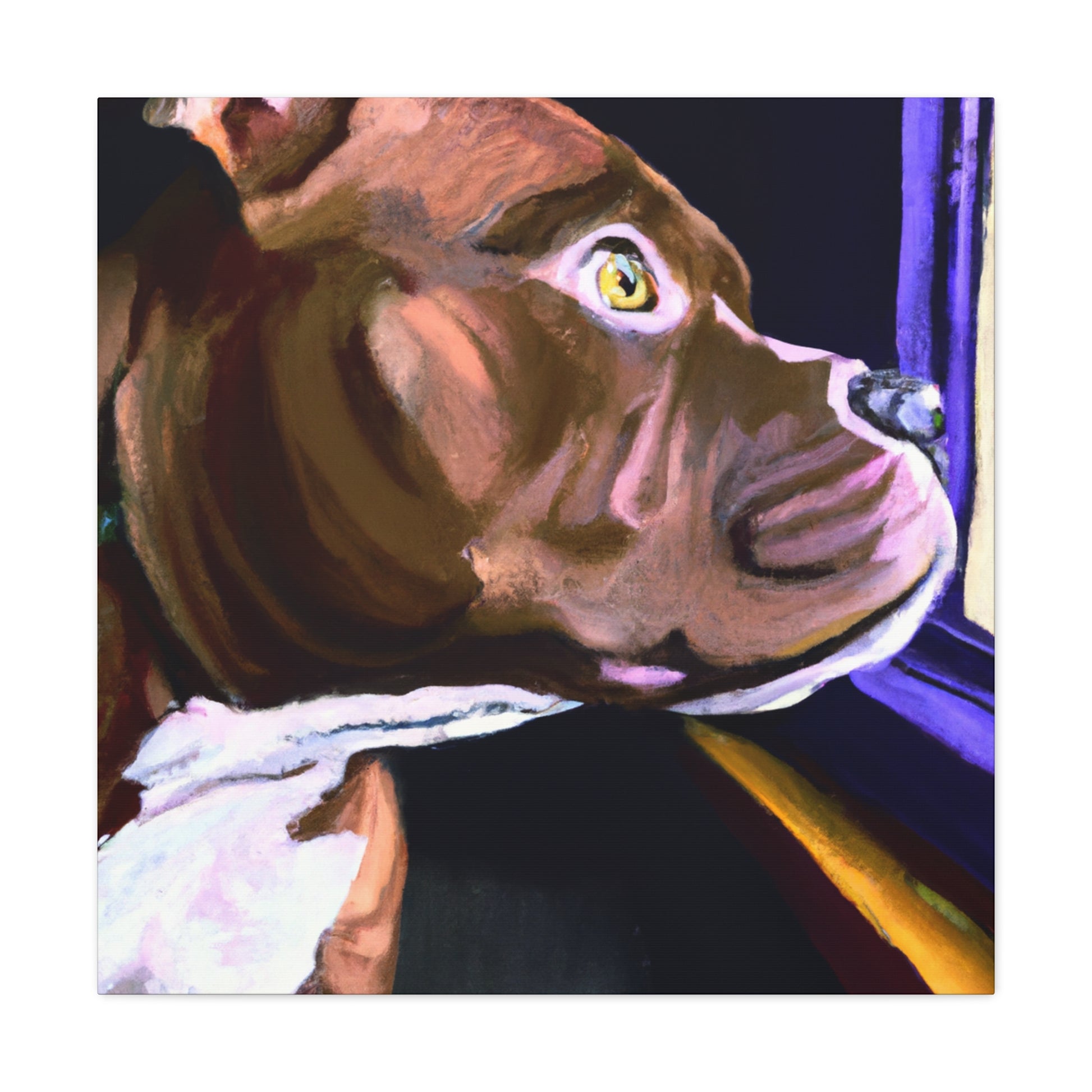 This abstract painting of a young brown pit bull looking longingly out the window is the perfect addition to any home! The endearing expression of life in the pup's eyes is contrasted against the trippy elements of this lively piece. This canvas will bring a sense of artistry and emotion to any room. #abstractart #canvasprint #dogart #brownpittbull #trippyart #windowpainting #youngdogart #emotiveart #pupart #homedecor #wallartanddecor