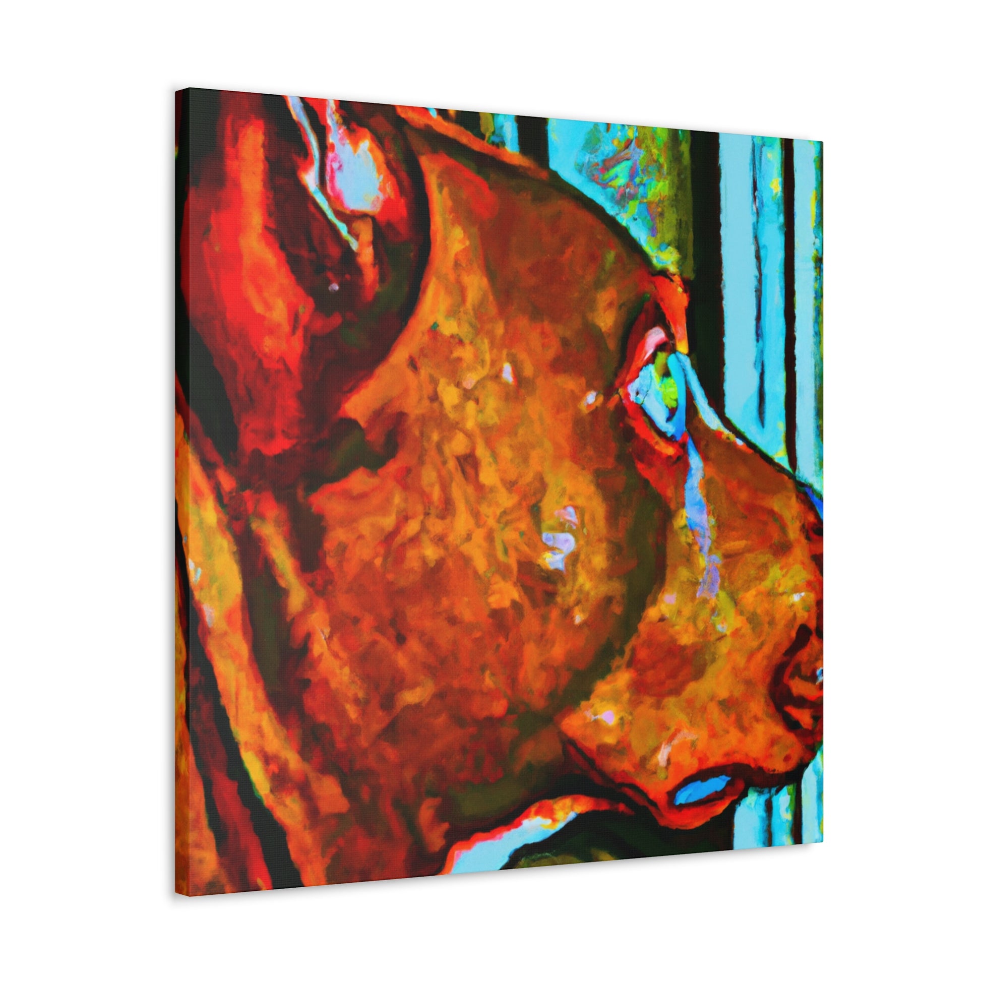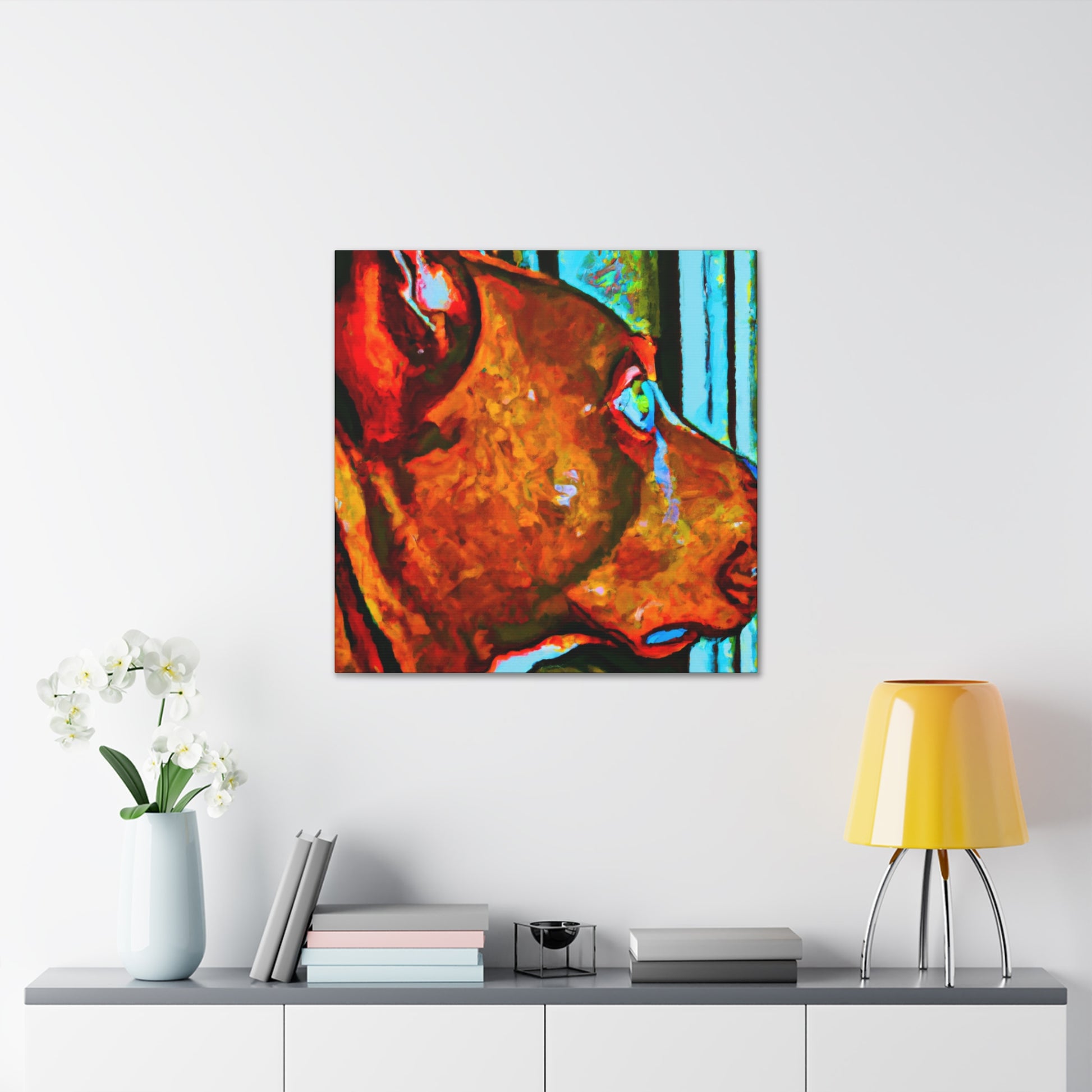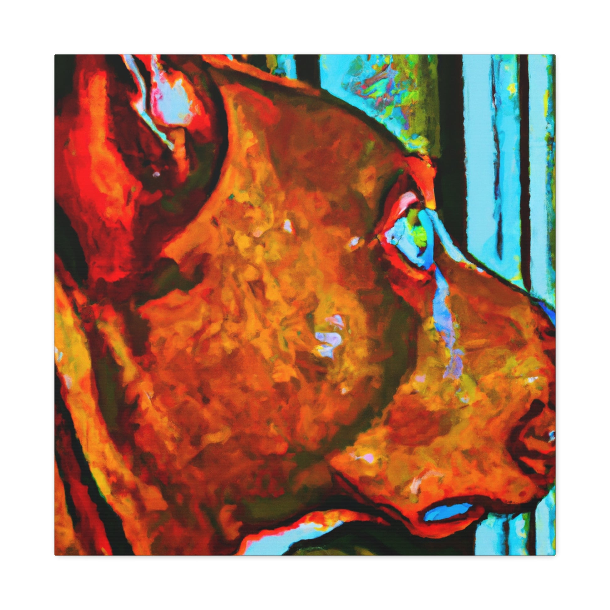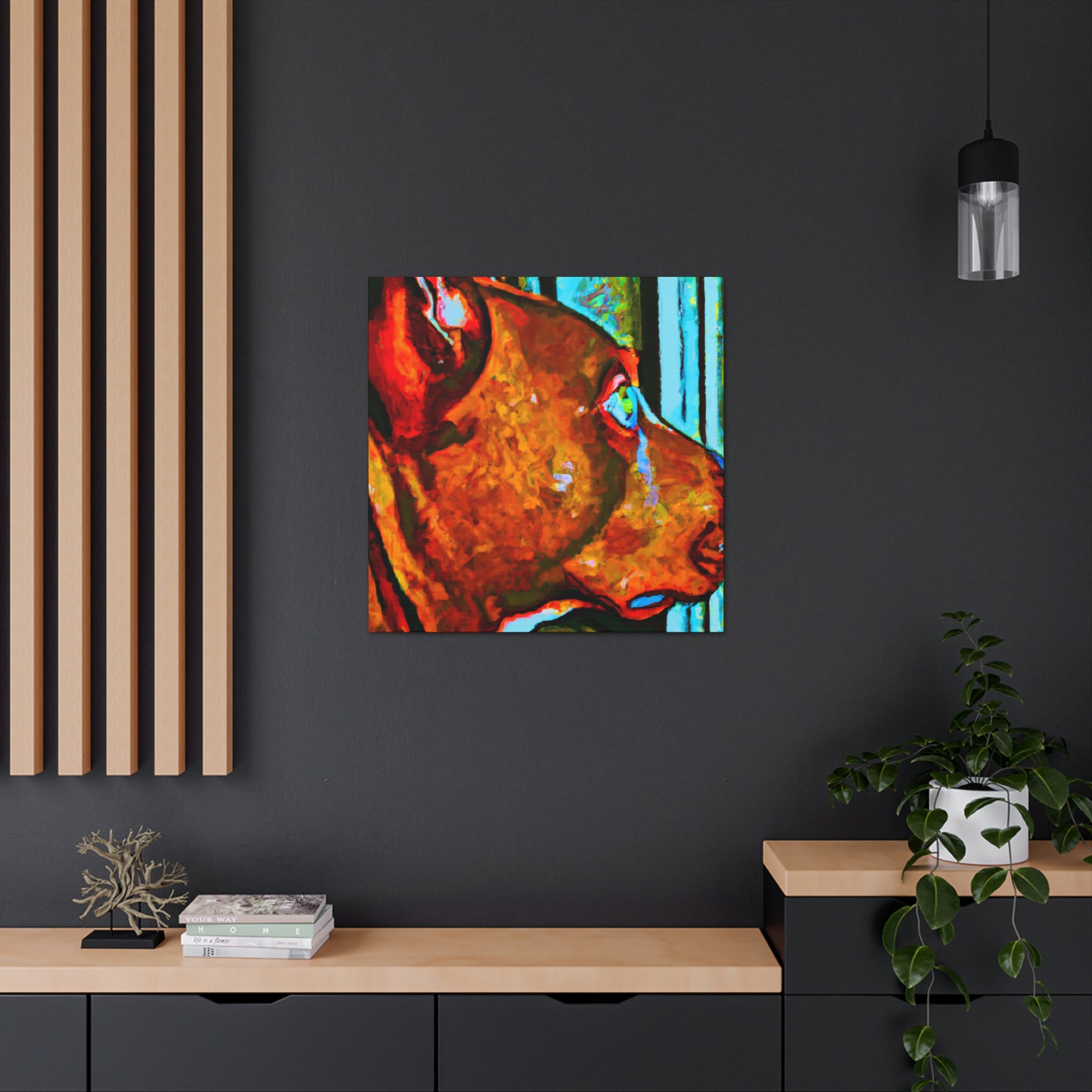 This canvas will surely bring some life to any room! This abstract painting depicts a young brown pit bull looking longingly out the window. The canvas features an array of psychedelic colors along with vibrant, playful details that will make the canine stand out. The look in his eyes paints a picture of optimism and energy that is sure to make anyone feel happy and inspired. #dogsofinstagram #pitbull #canvas #abstractart #artwork #interiorstyle #vibrant #psychedelic #optimism #youngdog #animalillustration #homedecor