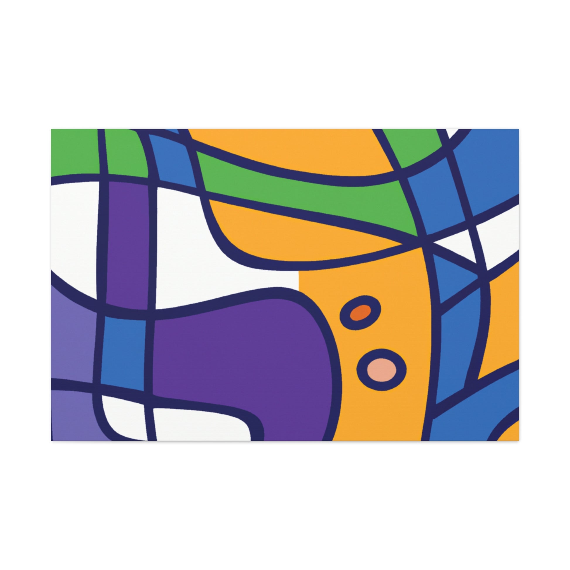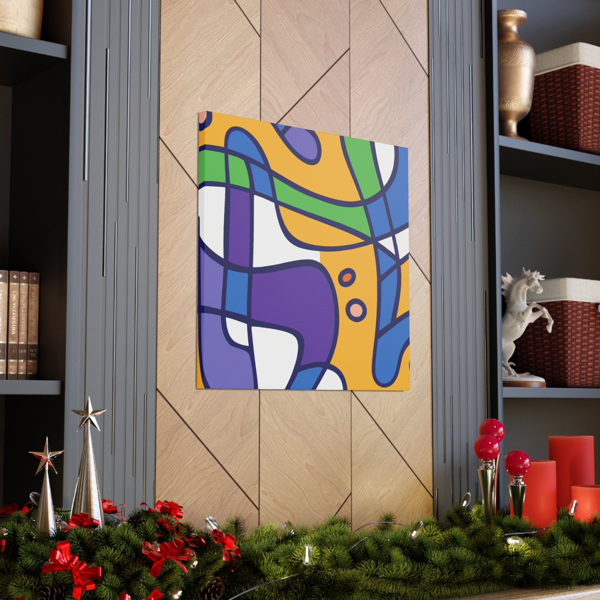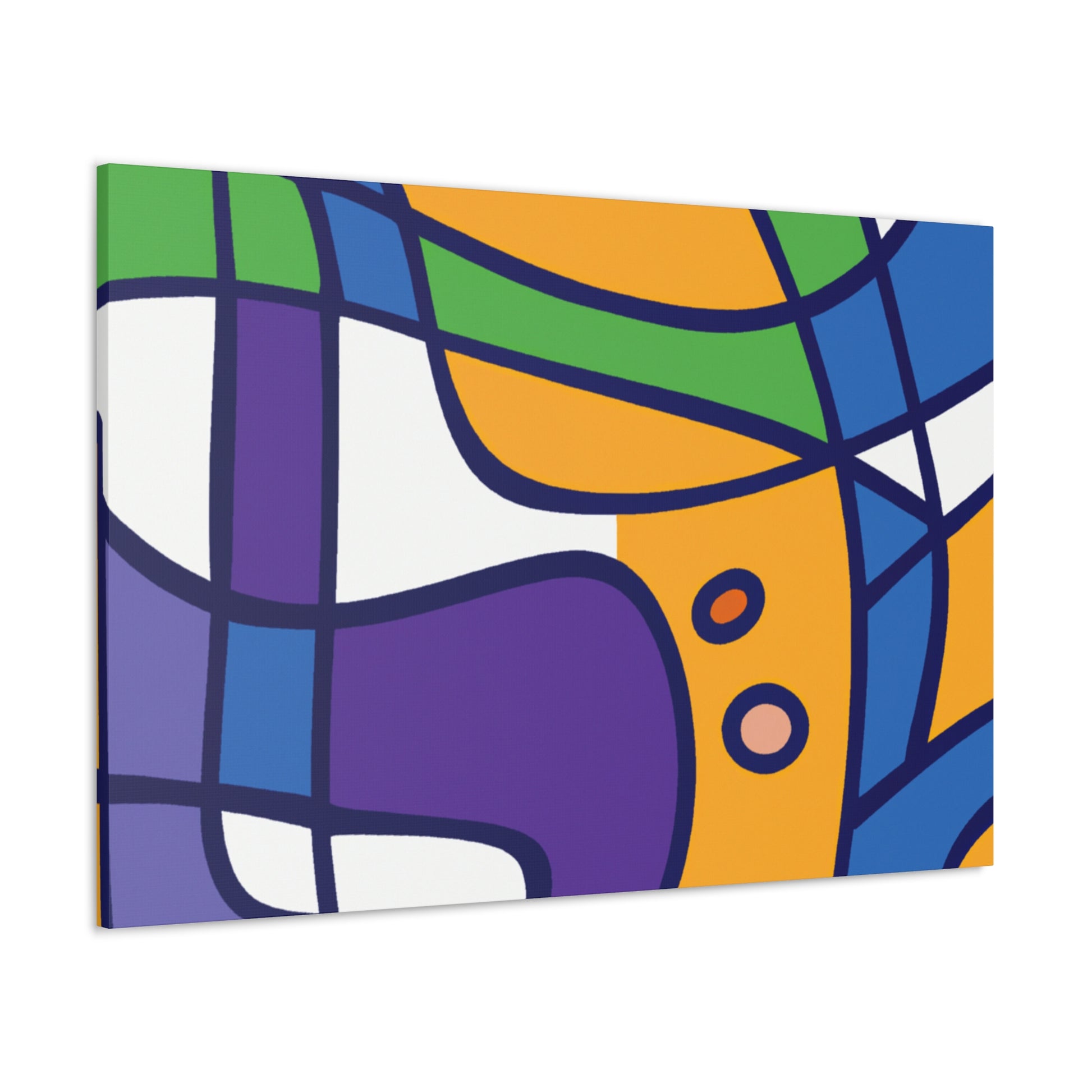 This stretched canvas art print features a bold abstract geometric pattern in cool colors- blues, greens, purples, and even a hint of grey. A modern design for your walls, it's sure to make a statement. The saturated colors pop against the canvas making for a vibrant piece of artwork. Hanging hardware is included so you can hang and enjoy it in your space as soon as it arrives. #abstractart #geometricart #modernart #coolcolors #interiorstyling #homeinteriors #wallart #canvasart #statement piece #modernhomedecor #accentpiece