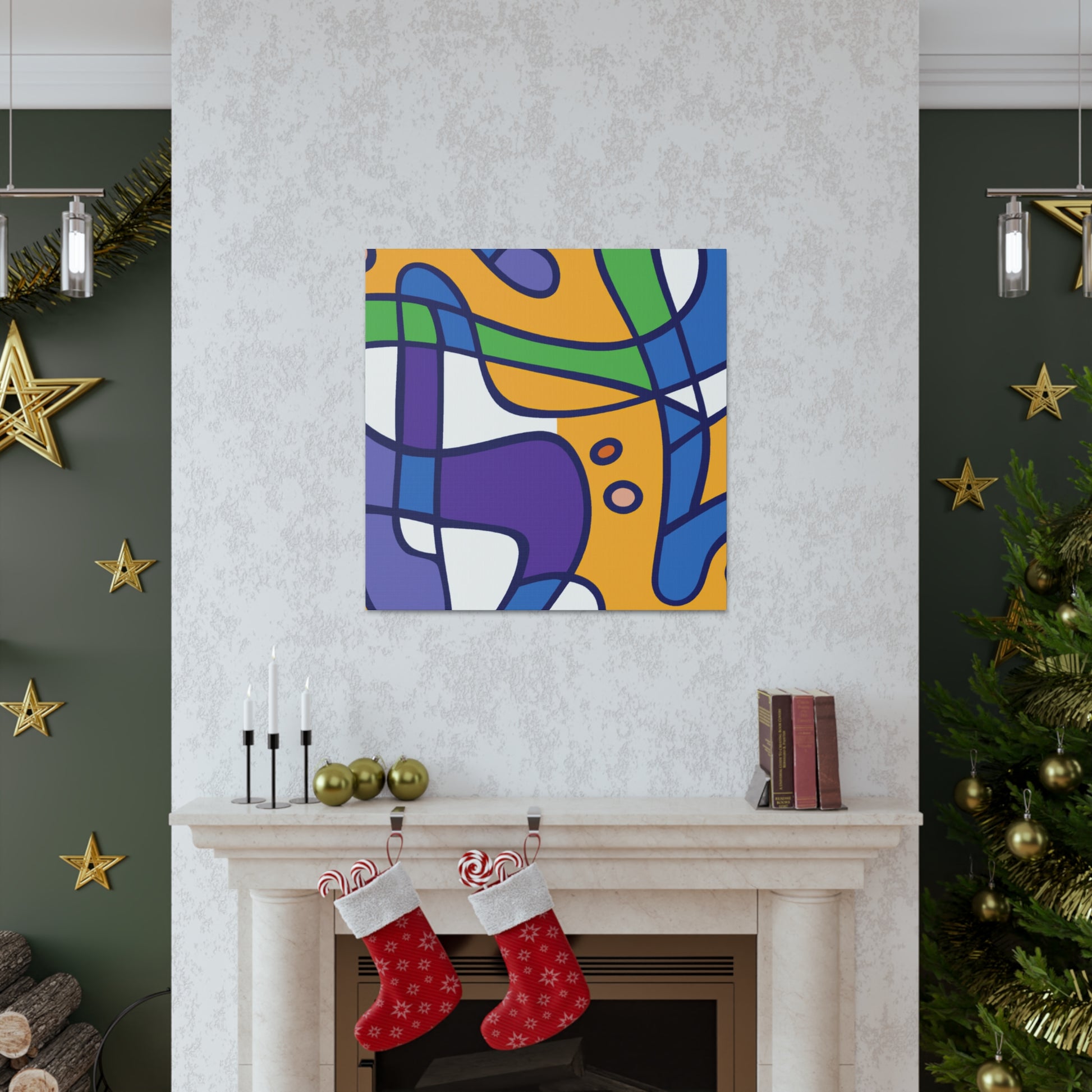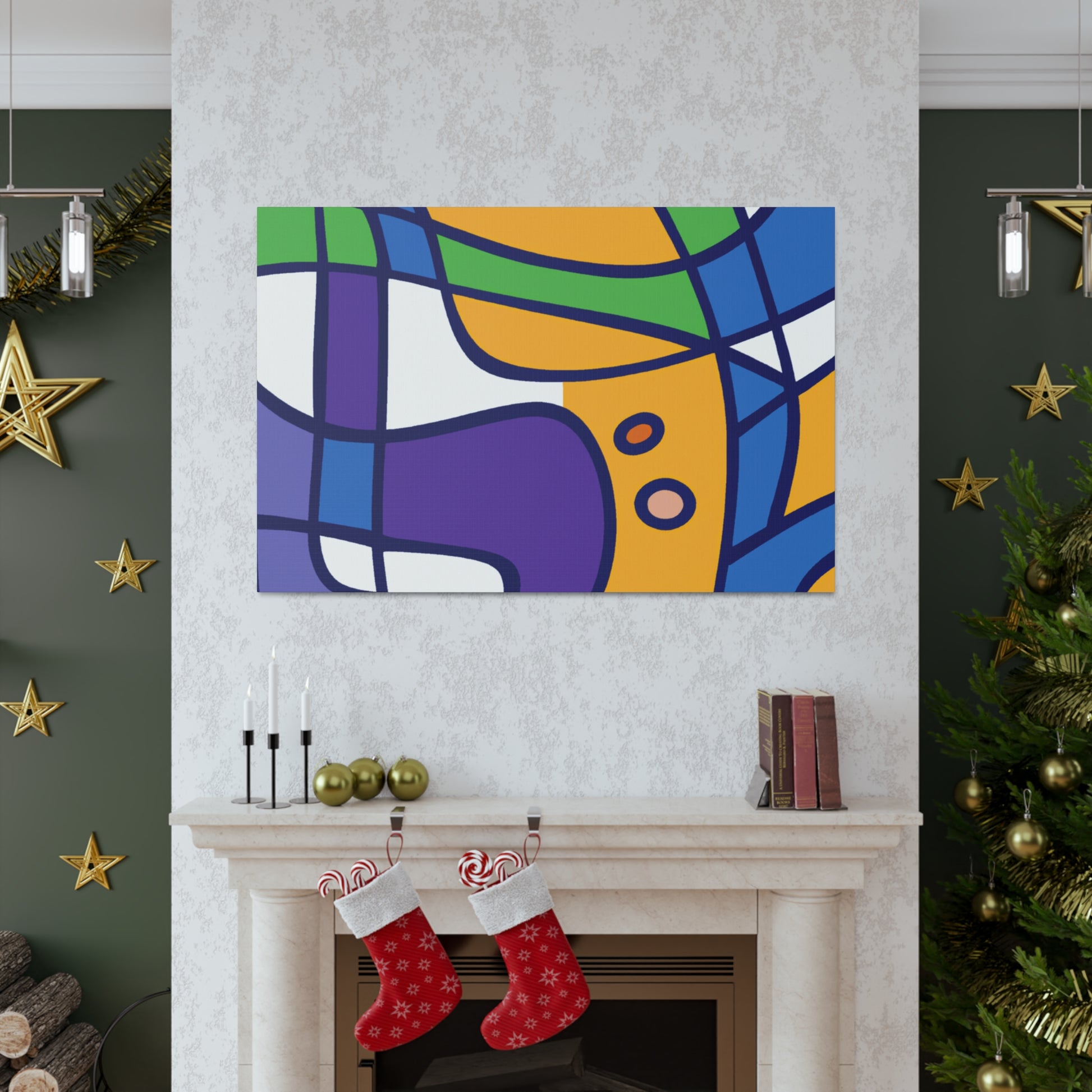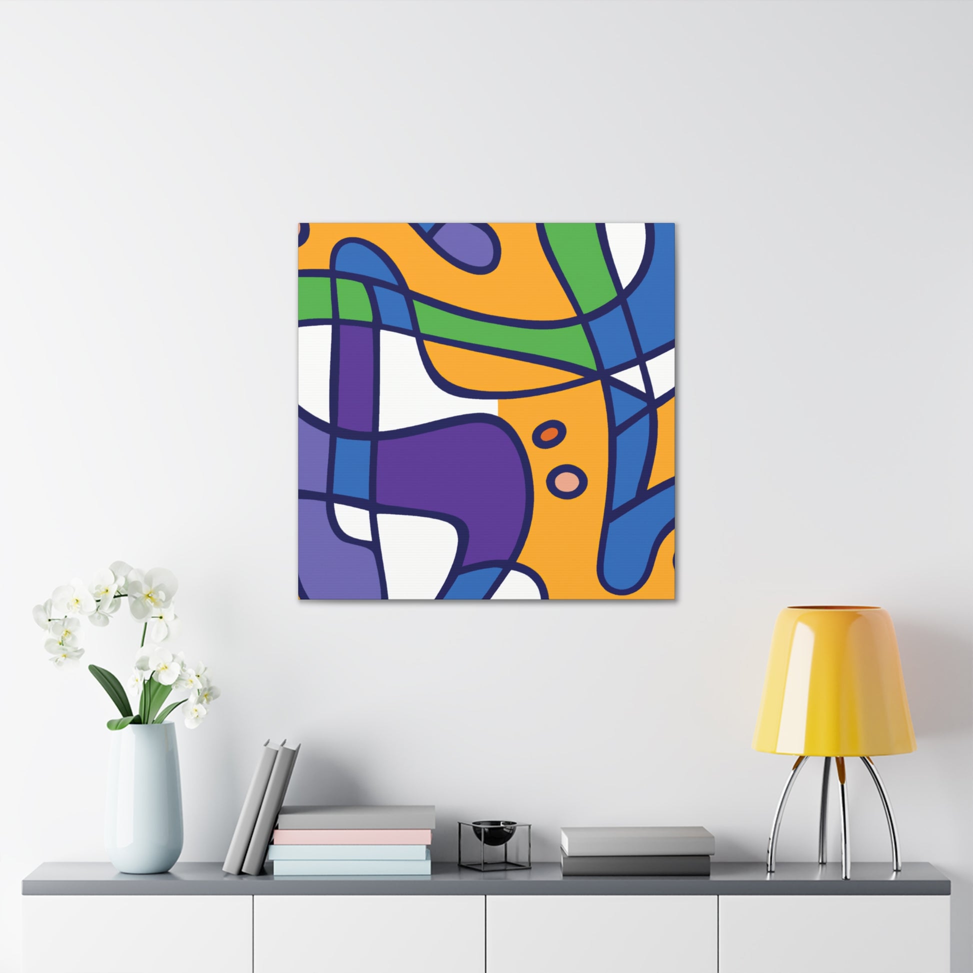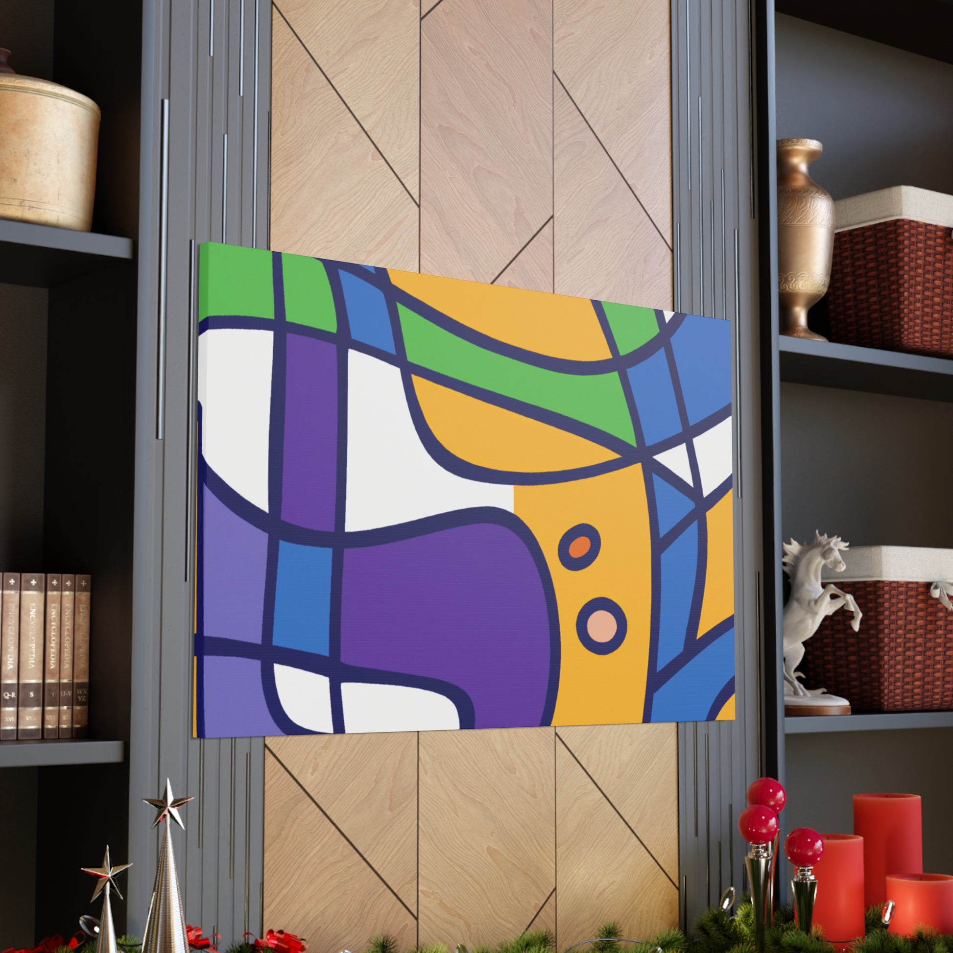 This stretched canvas art print features a bold abstract geometric pattern in cool colors- blues, greens, purples, and even a hint of grey. A modern design for your walls, it's sure to make a statement. The saturated colors pop against the canvas making for a vibrant piece of artwork. Hanging hardware is included so you can hang and enjoy it in your space as soon as it arrives. #abstractart #geometricart #modernart #coolcolors #interiorstyling #homeinteriors #wallart #canvasart #statement piece #modernhomedecor #accentpiece