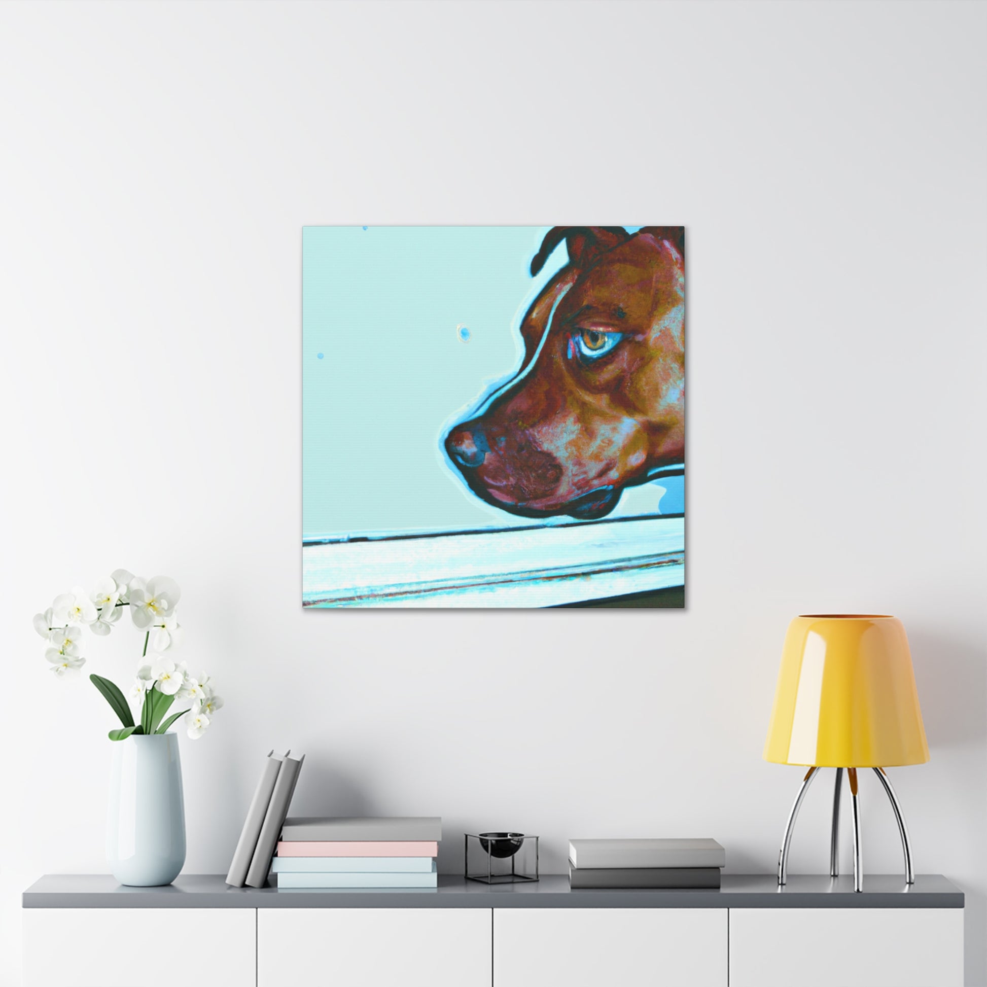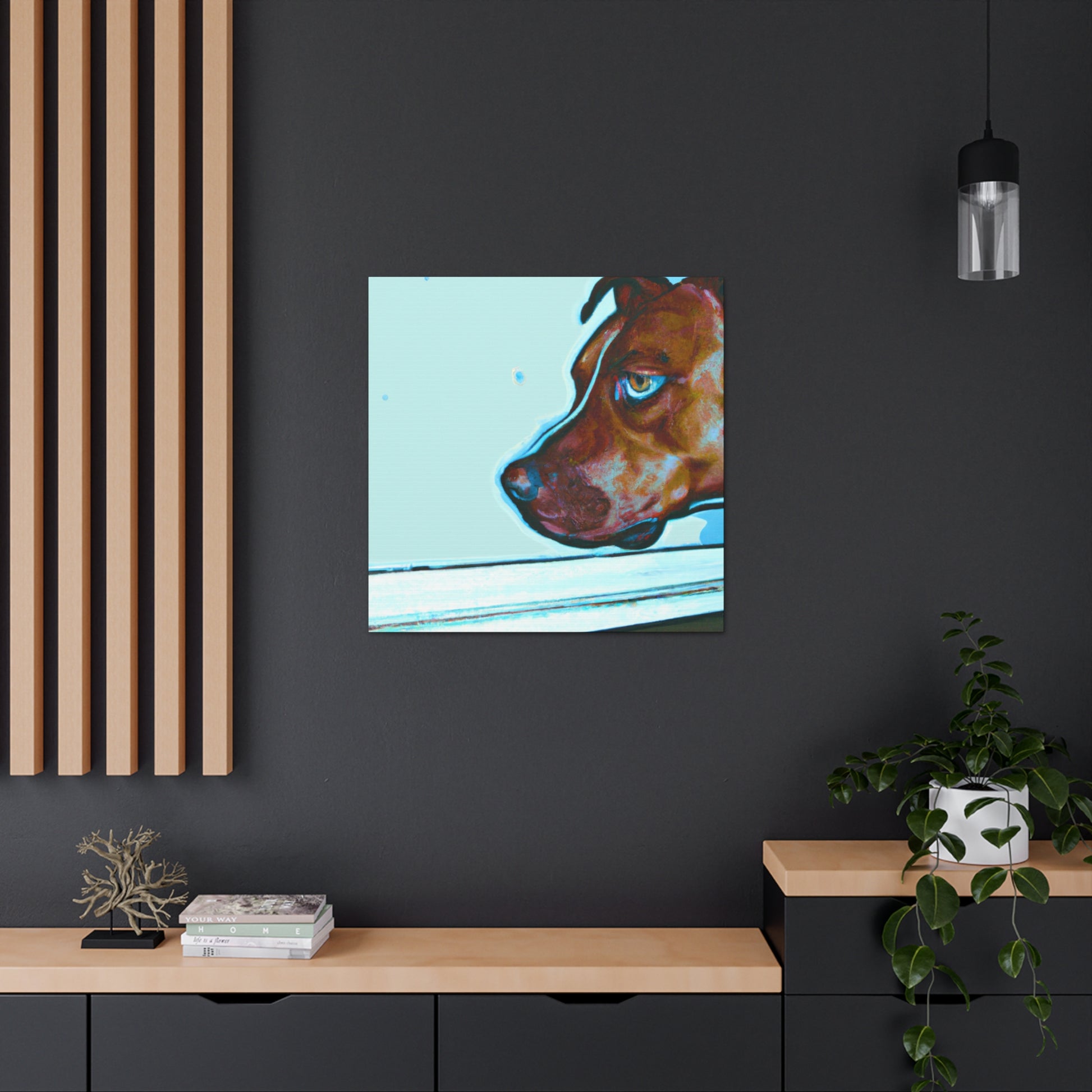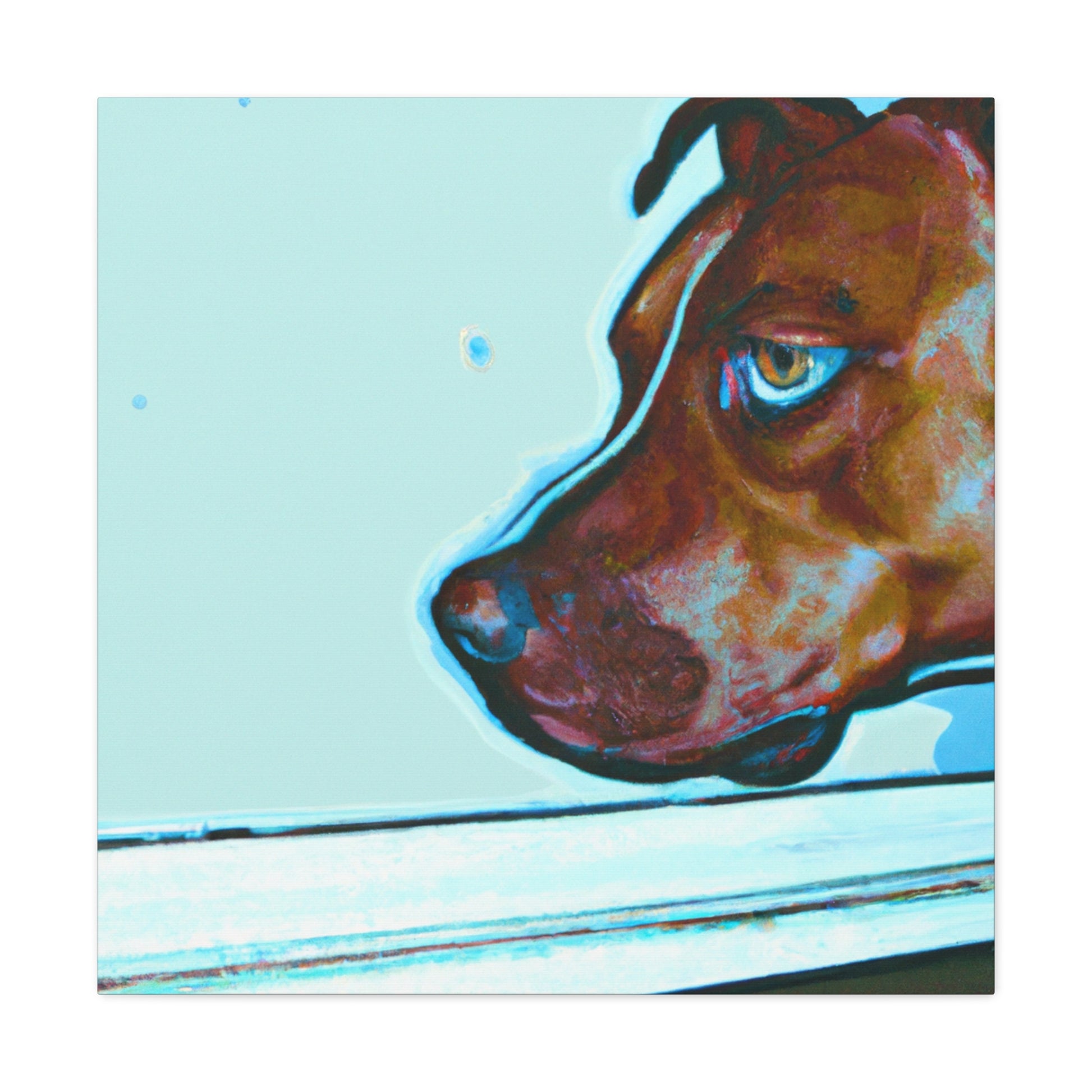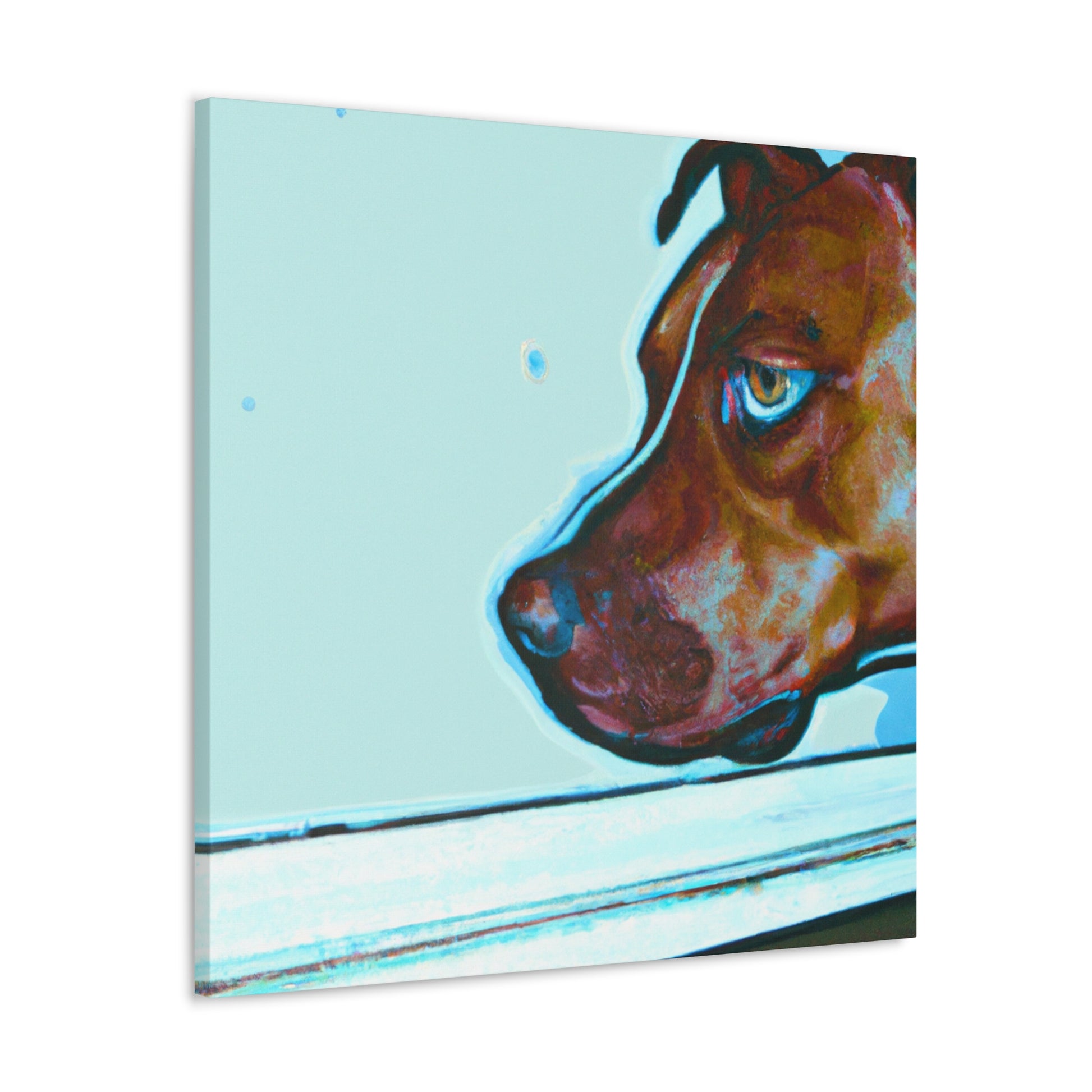 This canvas features an abstract representation of a young brown pit bull, looking out of the window with lots of life in his eyes. The colors are vibrant yet unique, creating a trippy yet classy look. The young pit bull stands out against the energy behind him, inviting the viewer to contemplate the mystery of life. #painting #abstract #art #canvas #dog #pitbull #young #vibrant #unique #trippy #classy