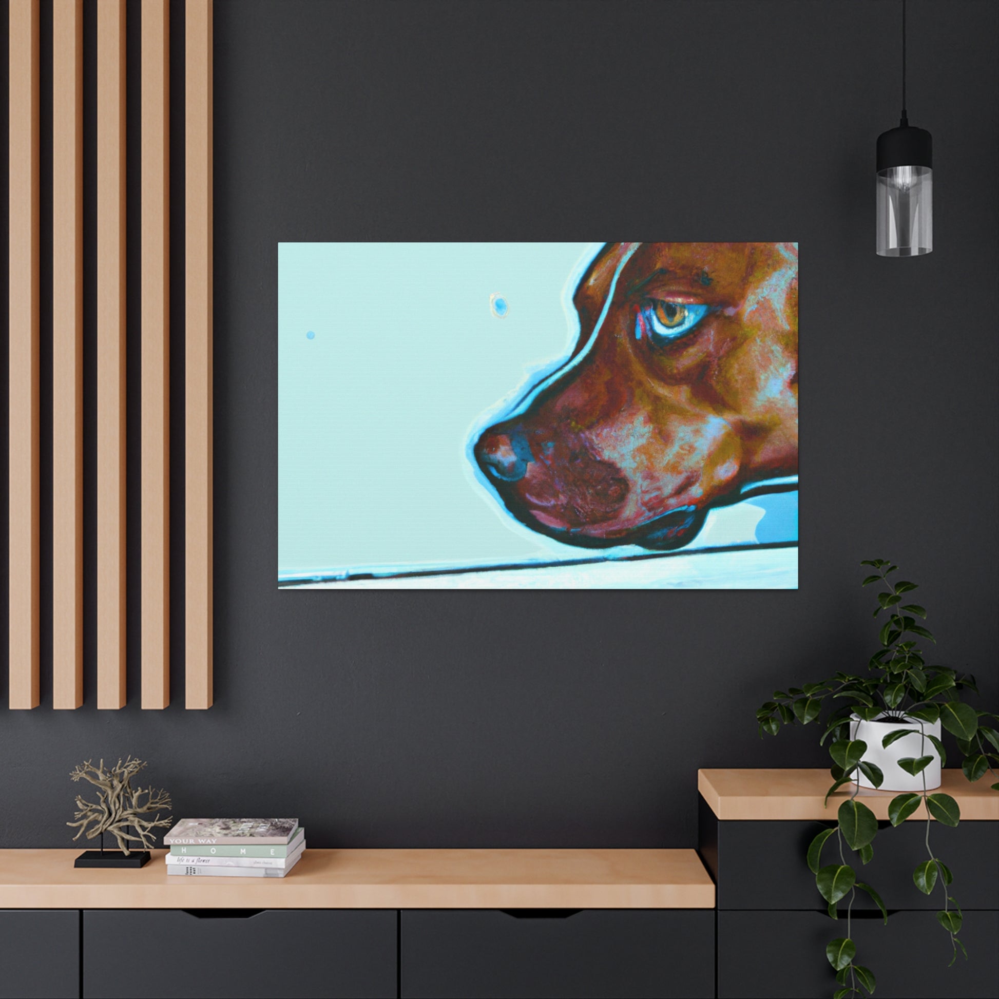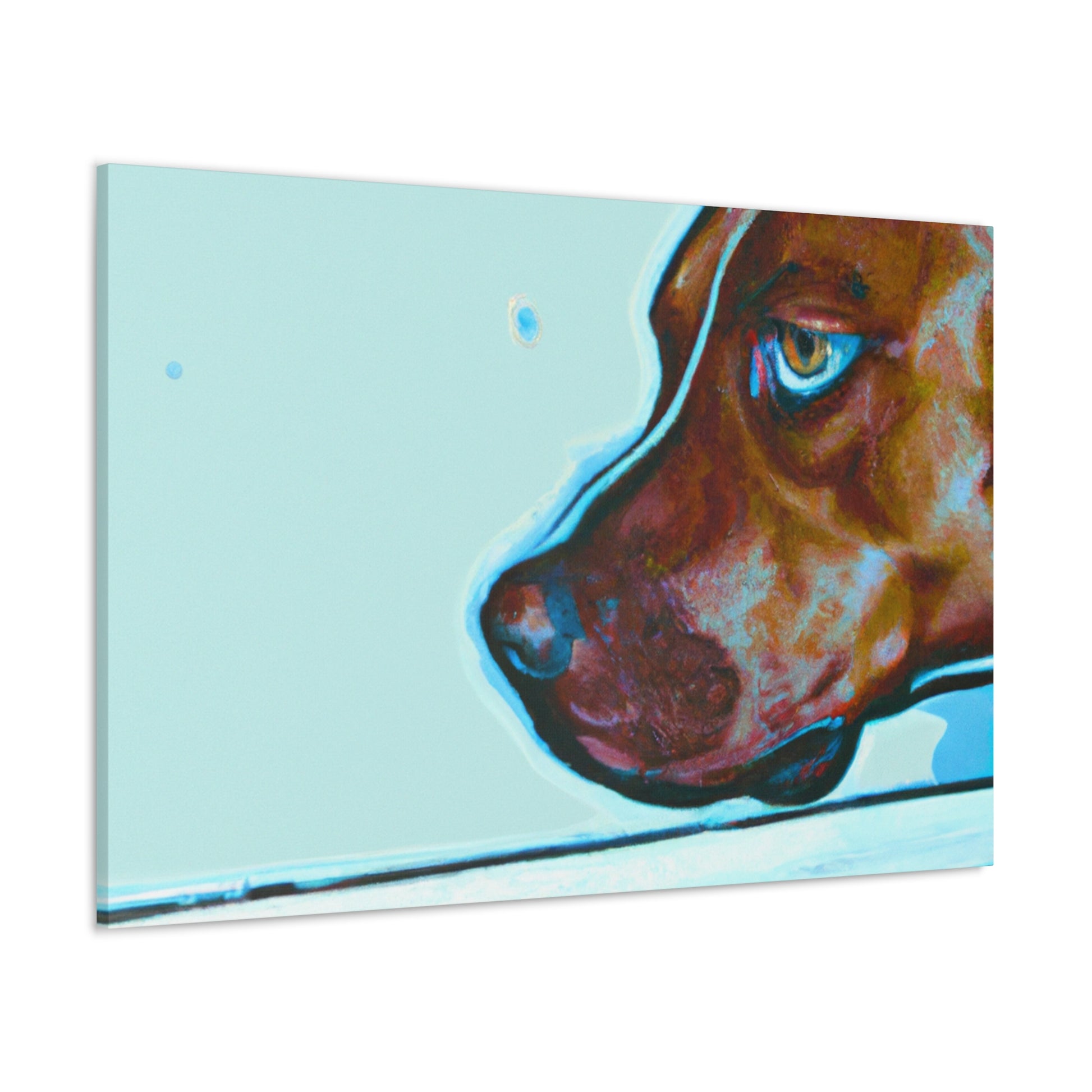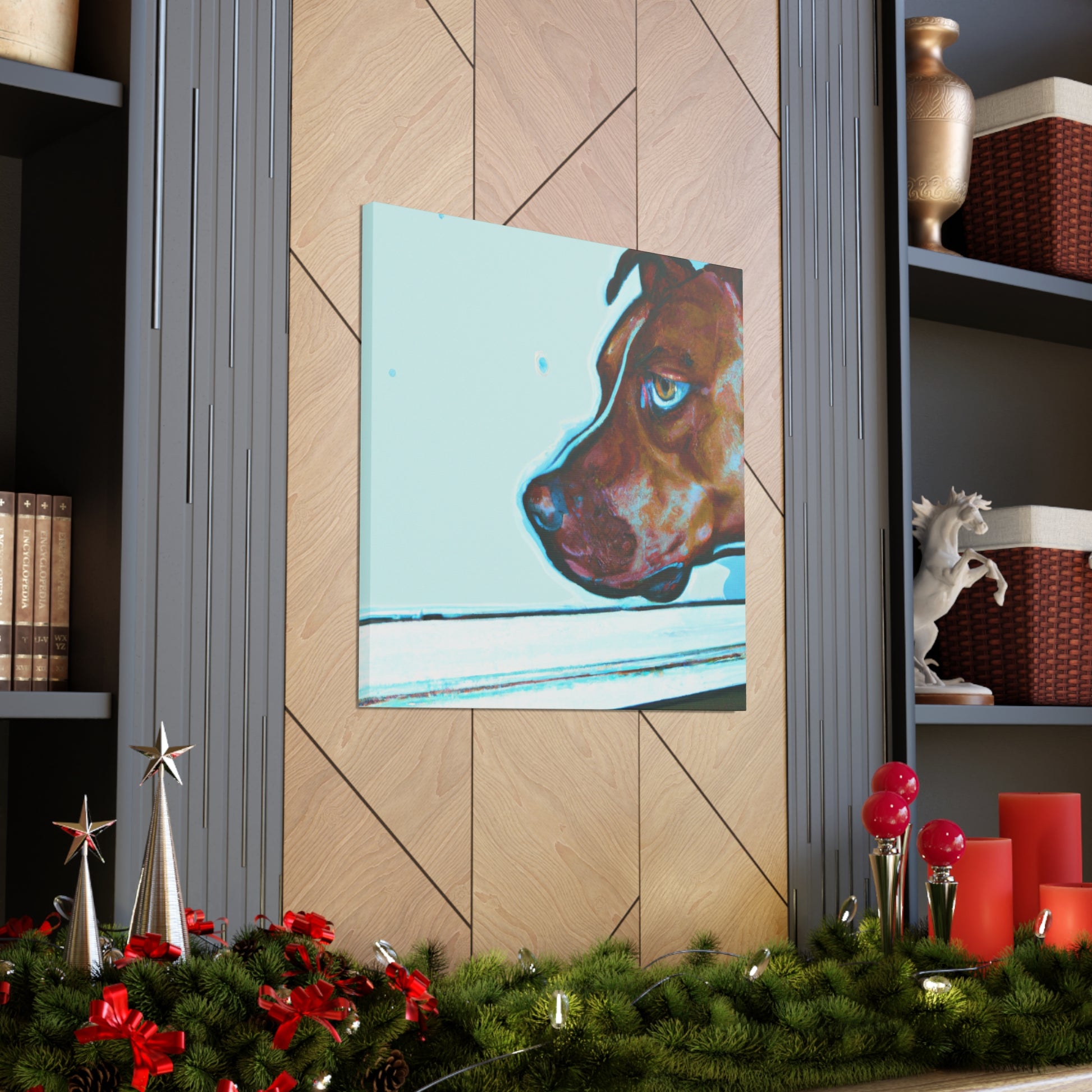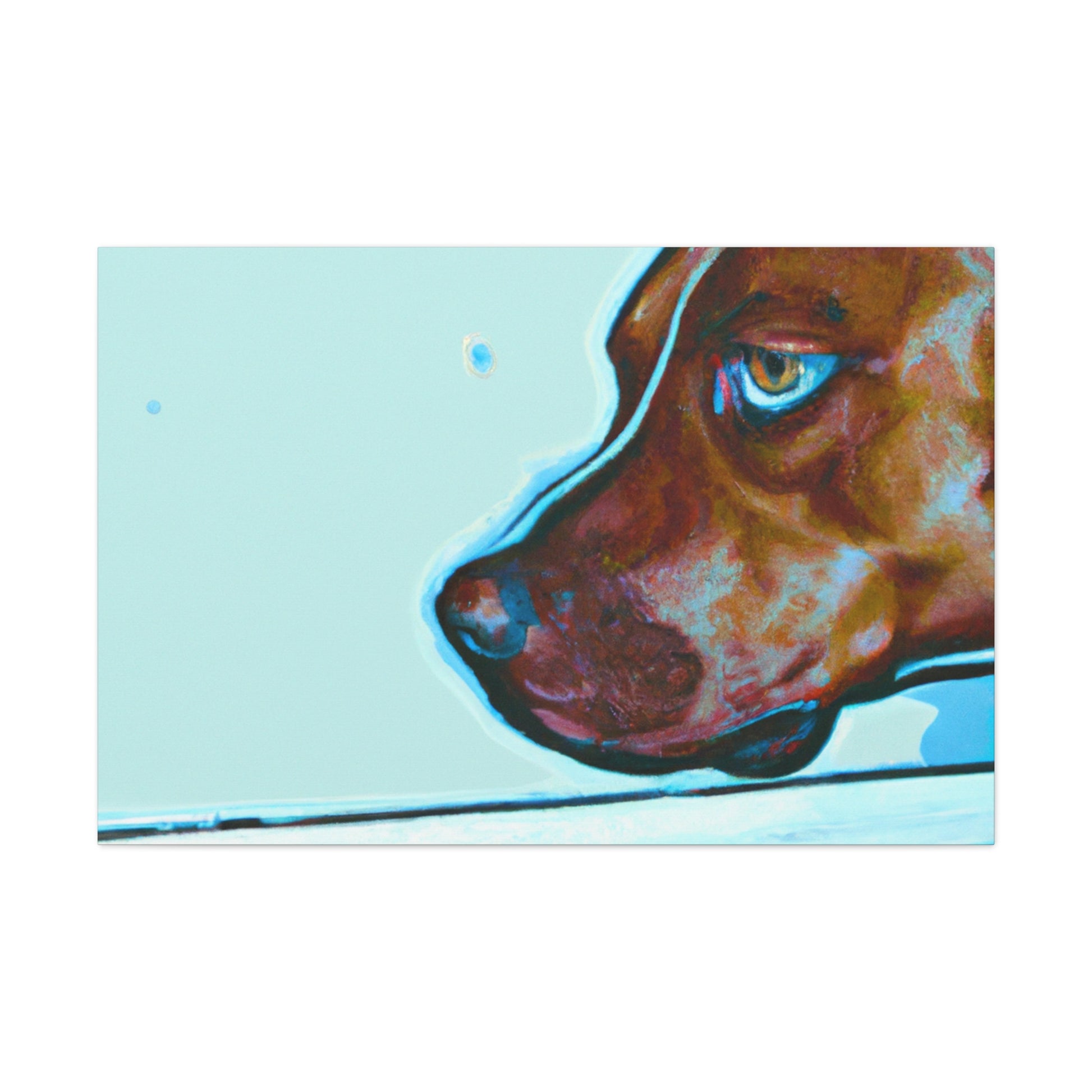 This canvas features an abstract representation of a young brown pit bull, looking out of the window with lots of life in his eyes. The colors are vibrant yet unique, creating a trippy yet classy look. The young pit bull stands out against the energy behind him, inviting the viewer to contemplate the mystery of life. #painting #abstract #art #canvas #dog #pitbull #young #vibrant #unique #trippy #classy