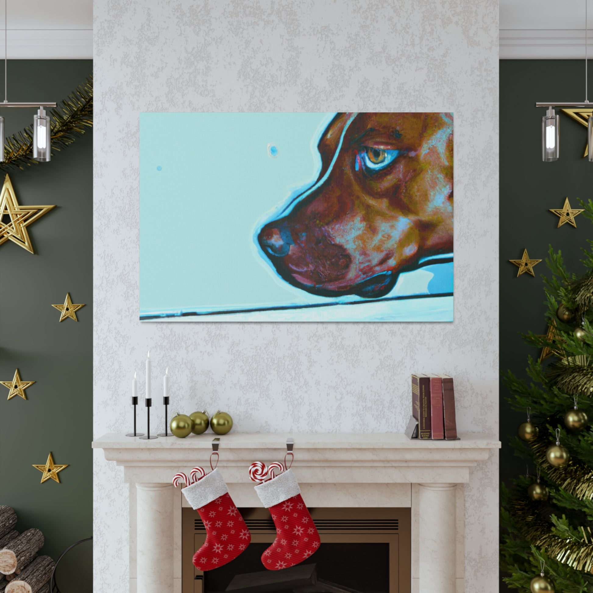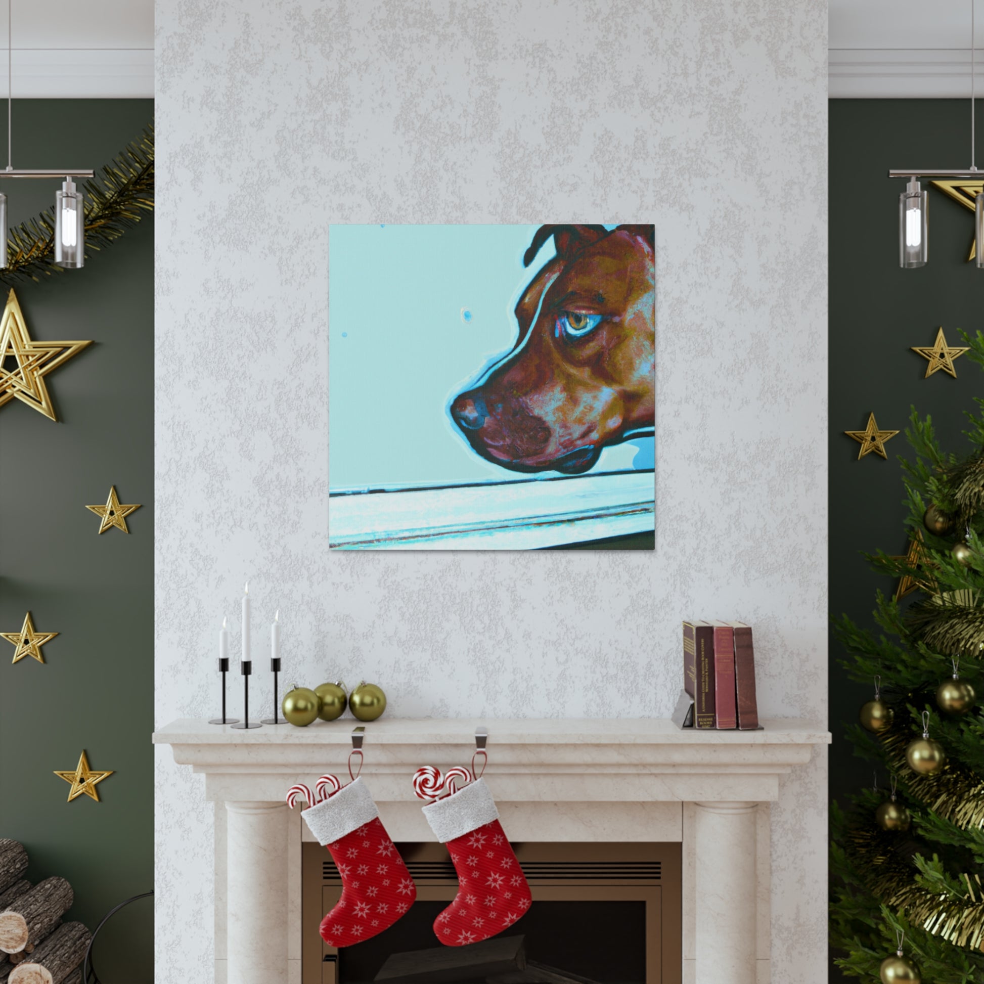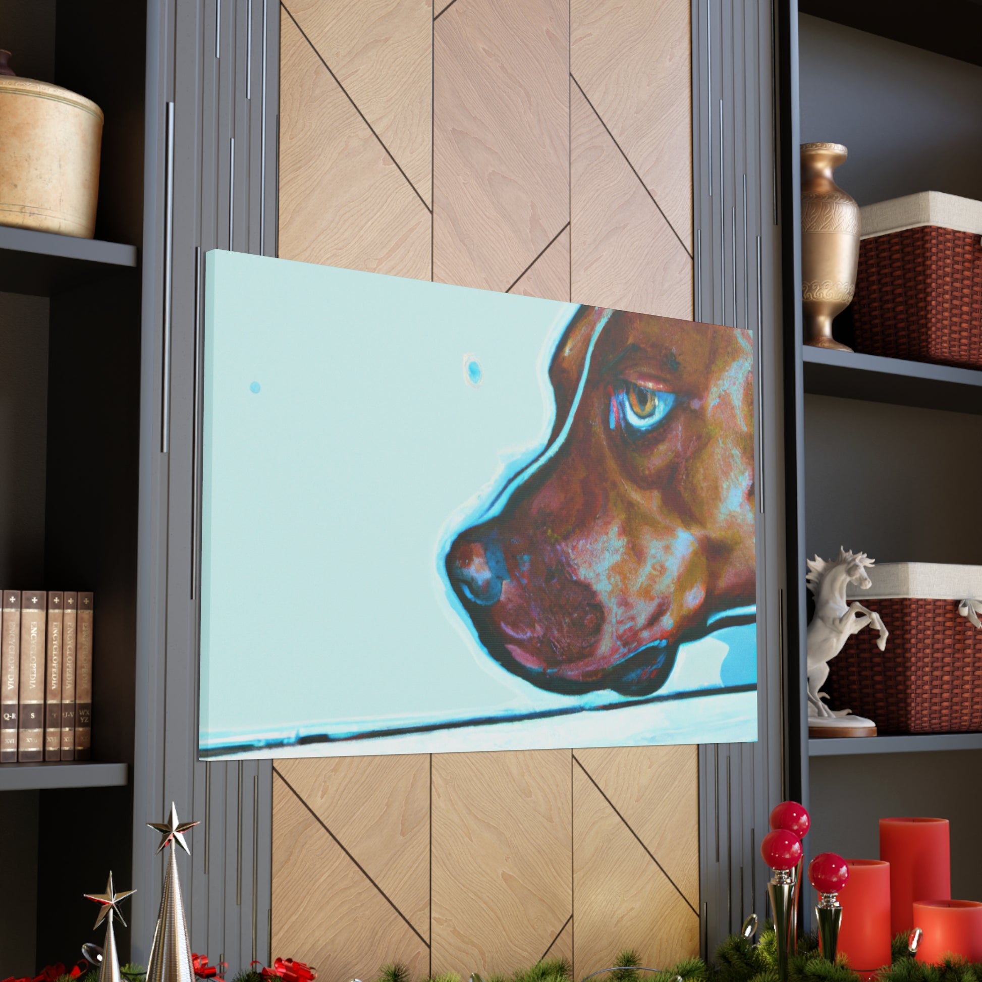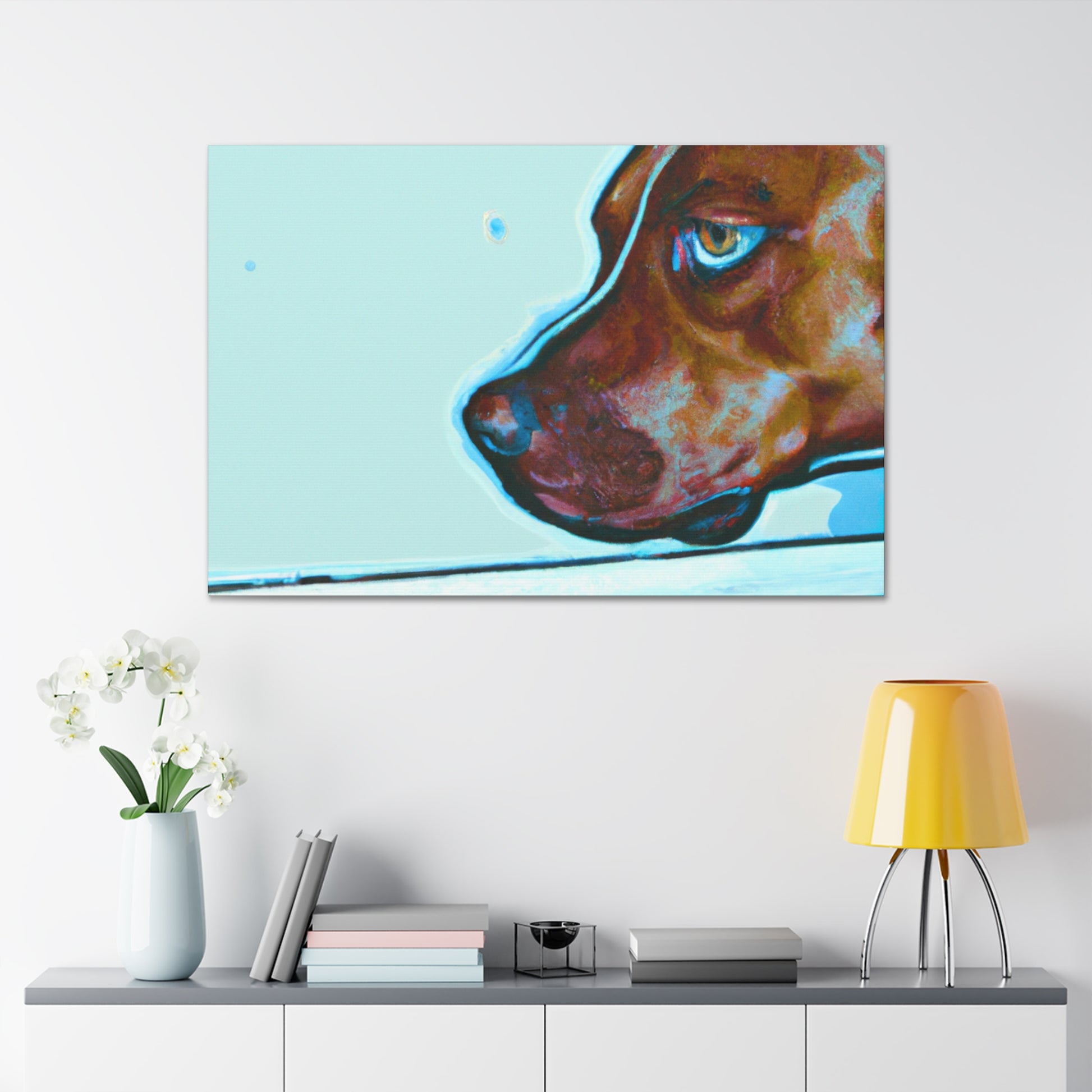 This canvas features an abstract representation of a young brown pit bull, looking out of the window with lots of life in his eyes. The colors are vibrant yet unique, creating a trippy yet classy look. The young pit bull stands out against the energy behind him, inviting the viewer to contemplate the mystery of life. #painting #abstract #art #canvas #dog #pitbull #young #vibrant #unique #trippy #classy