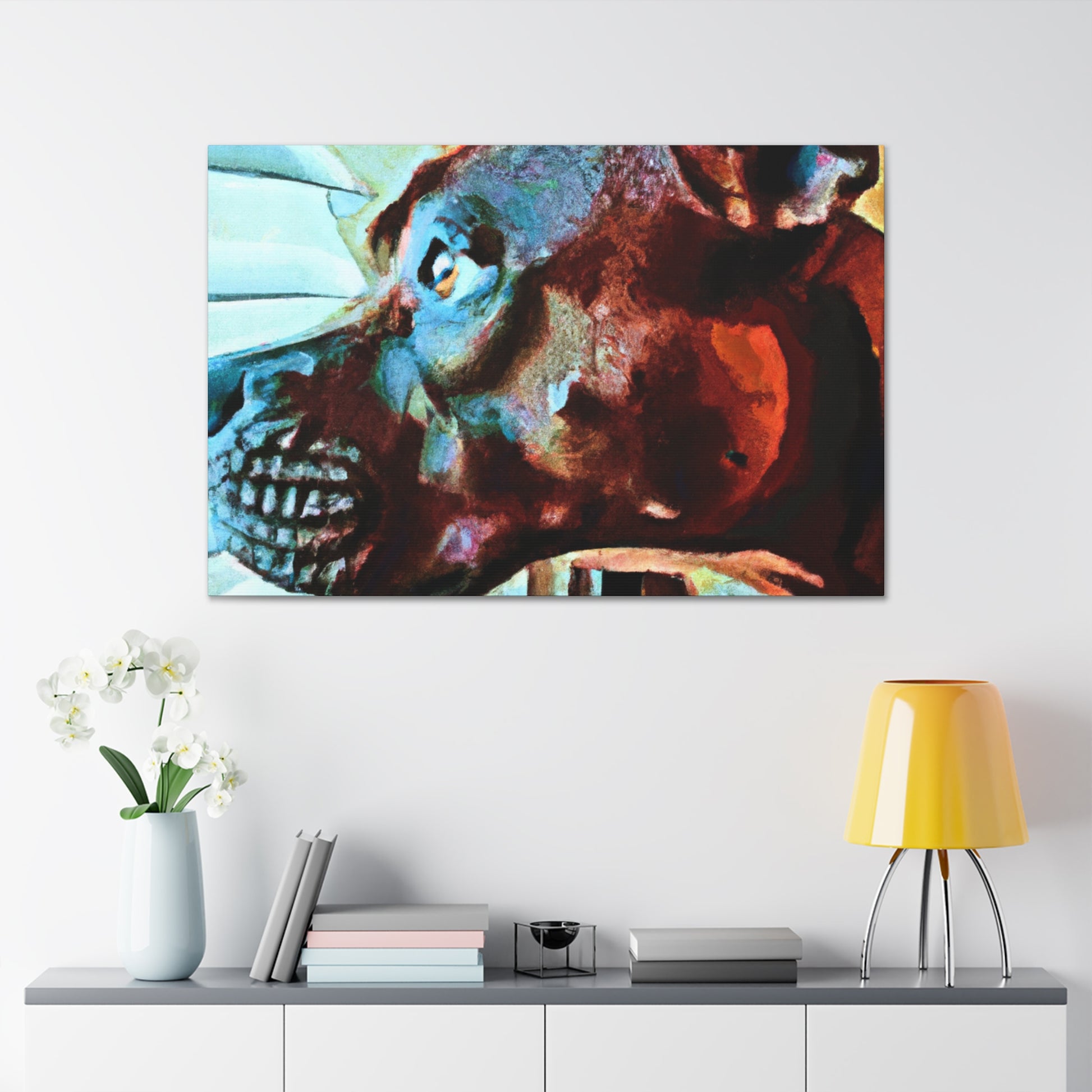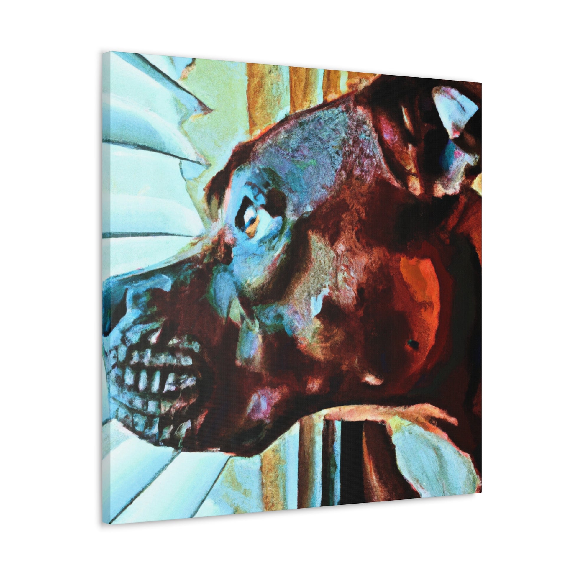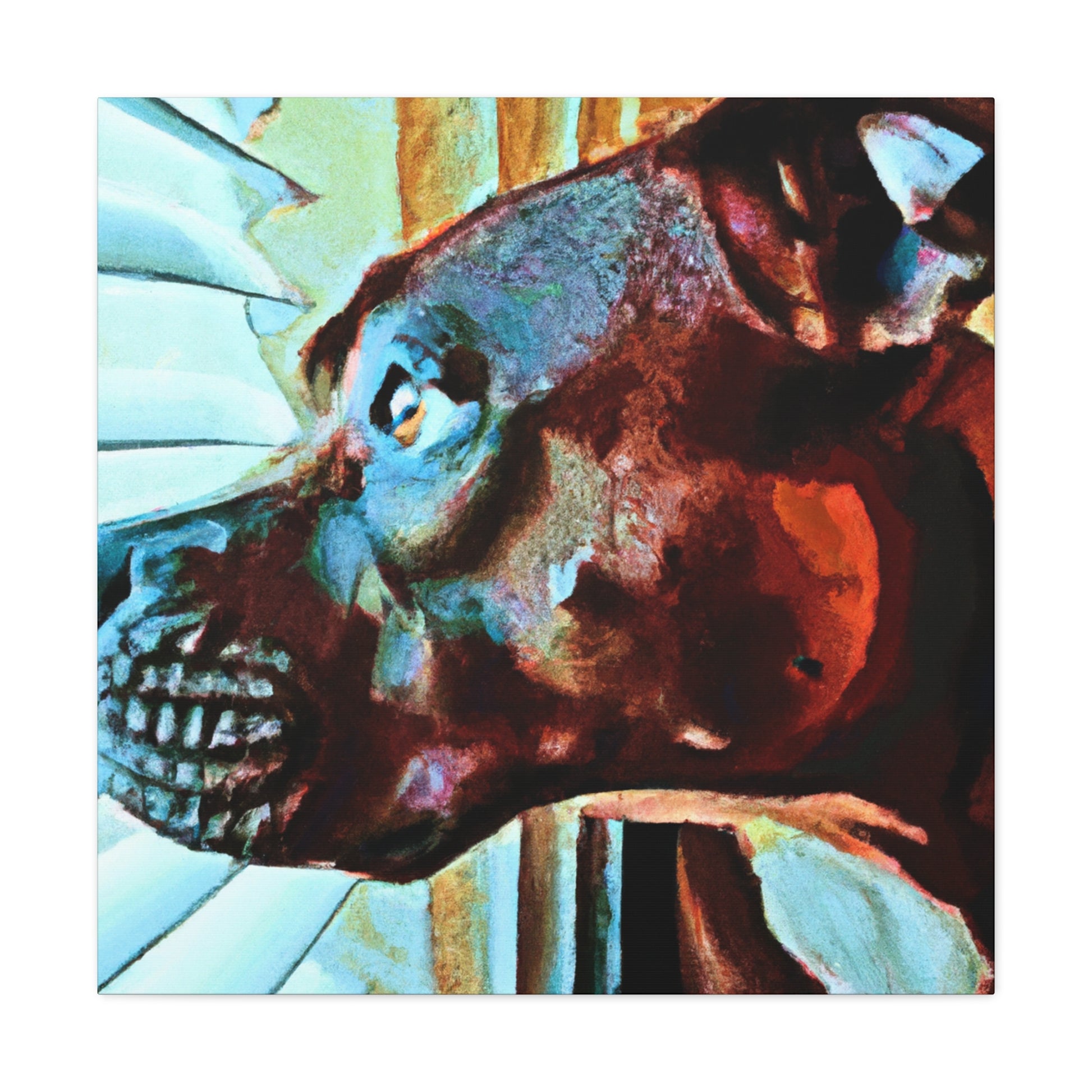This exquisite canvas will instantly become a focal point in any room. Set against a vibrant and trippy background, a brown pit bull looks out the window, full of longing and life in his eyes. Instilling a sense of emotion and natural beauty, this work of art will elevate any home and office decor. #abstractart #dogart #canvasart #brownpibull #contemporaryart #youngdog #trippy #colorfulpainting #expressionism #artforsale #roomdecor