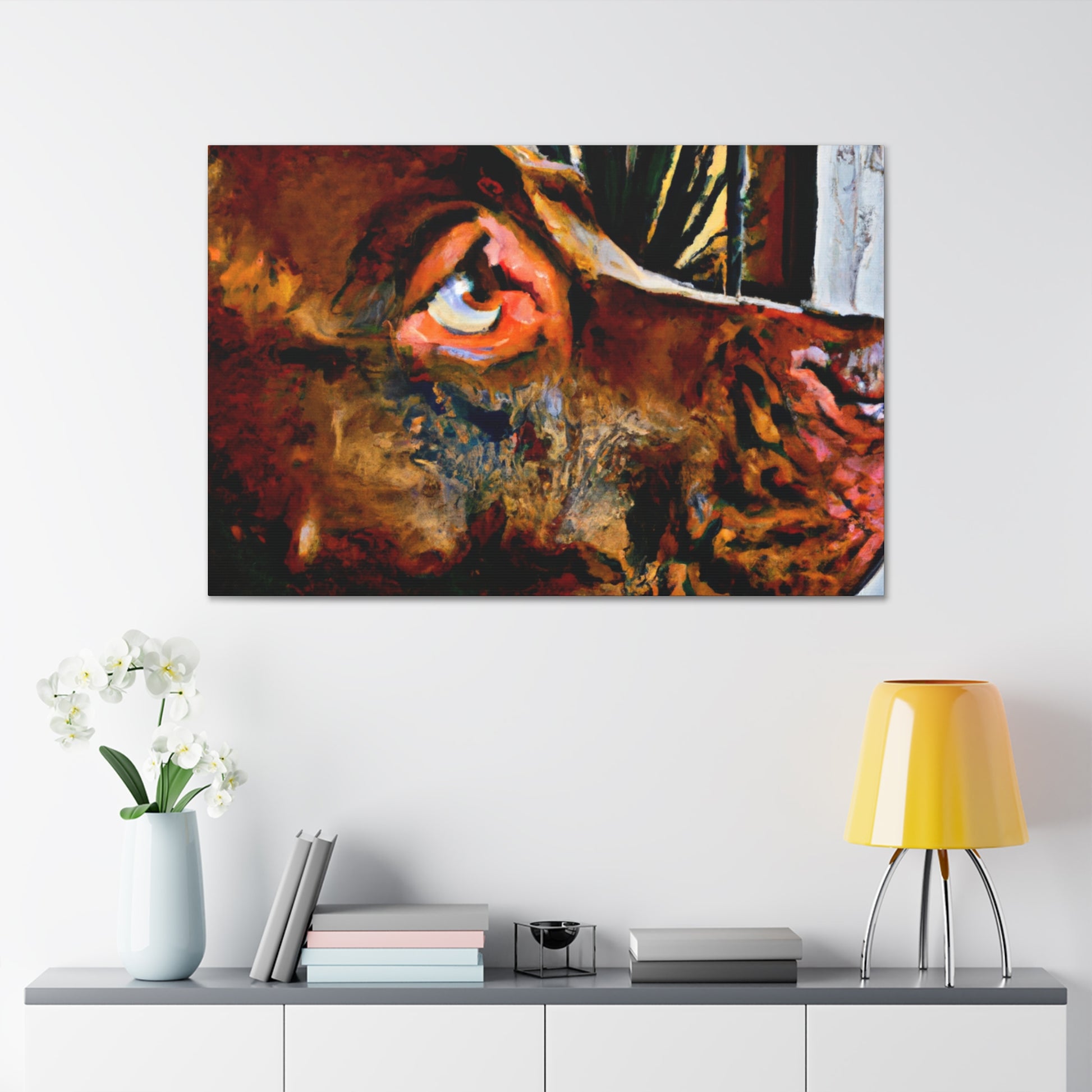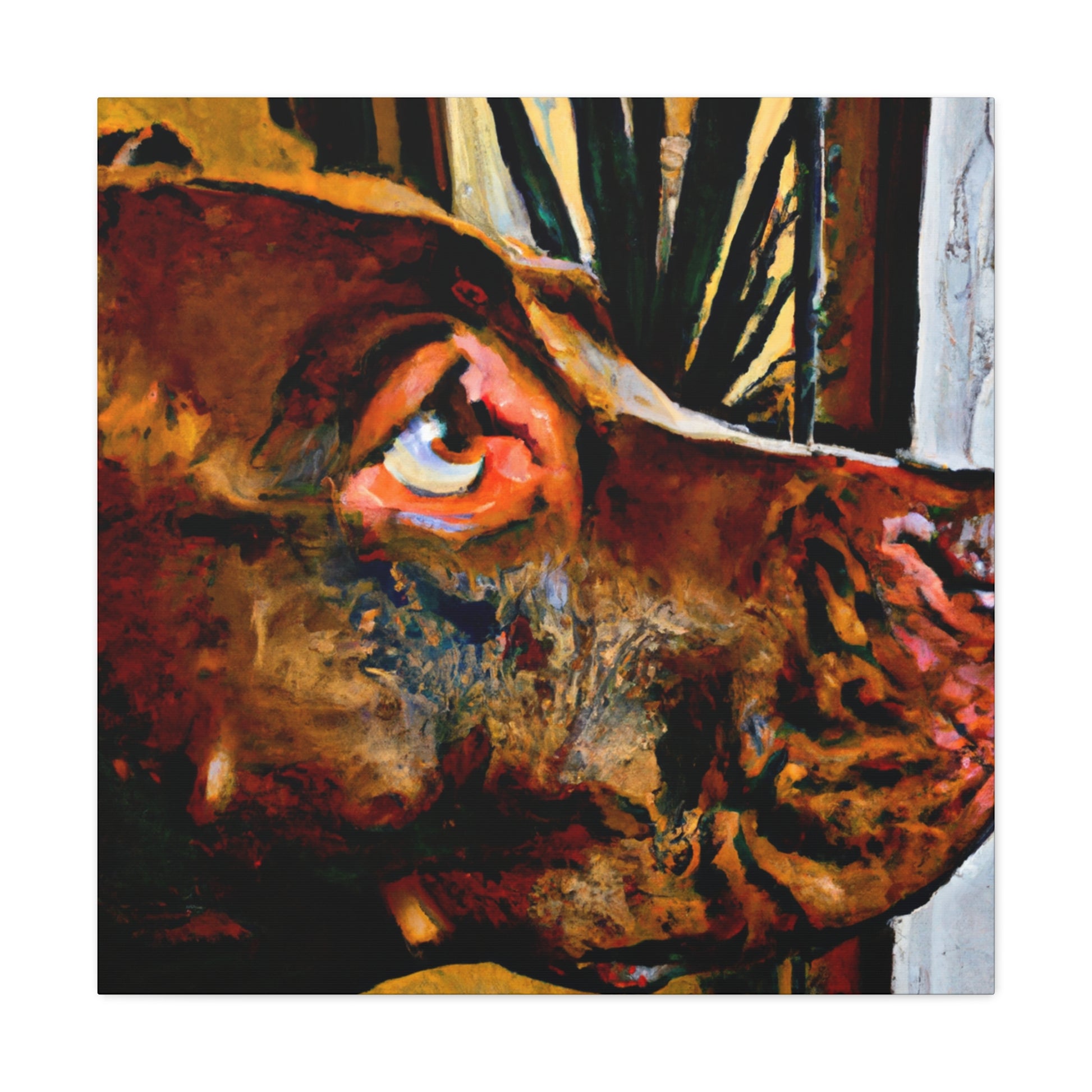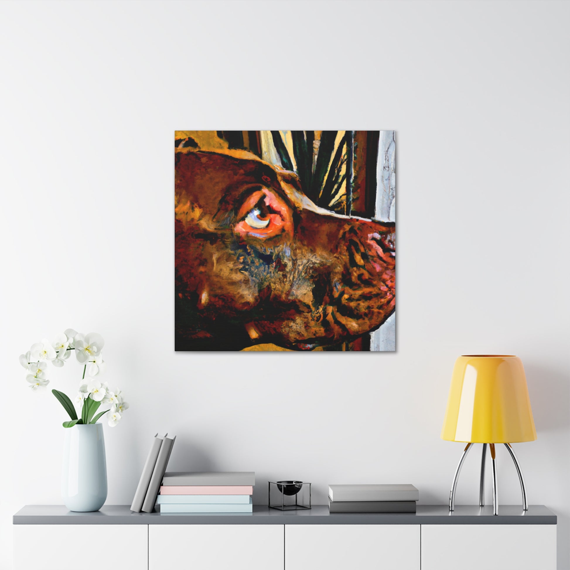 This incredible abstract painting features a young, brown pit bull looking longingly out of a window, with more life than most in his eyes. The background is filled with a dizzying array of colors and surreal forms: a boundary-pushing work of art that will spark conversation. This canvas presents a unique and daring take on the traditional animal portrait. #abstractart #pittbull #pittbullportrait #mentalhealthawareness #pitbulls #wallart #animalportraits #trippyart #canvasart #fineart #wallartdecor #contemporaryart