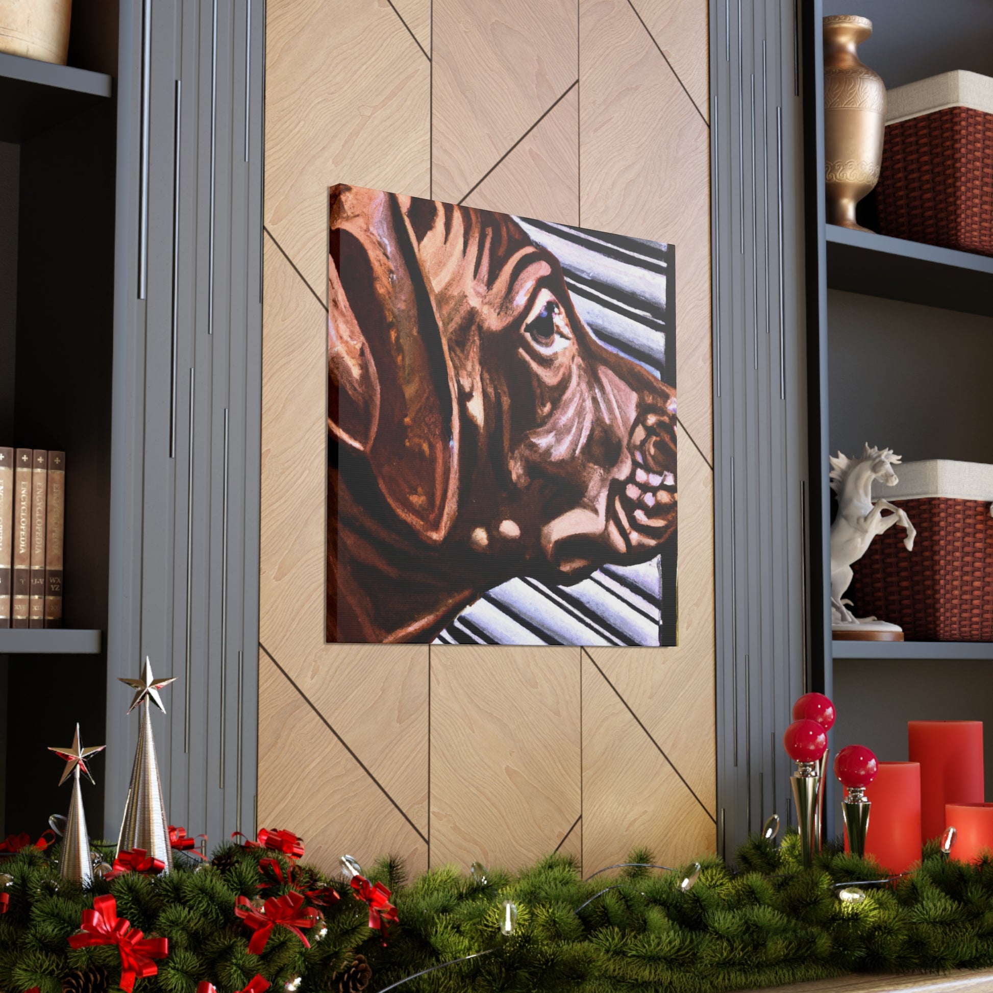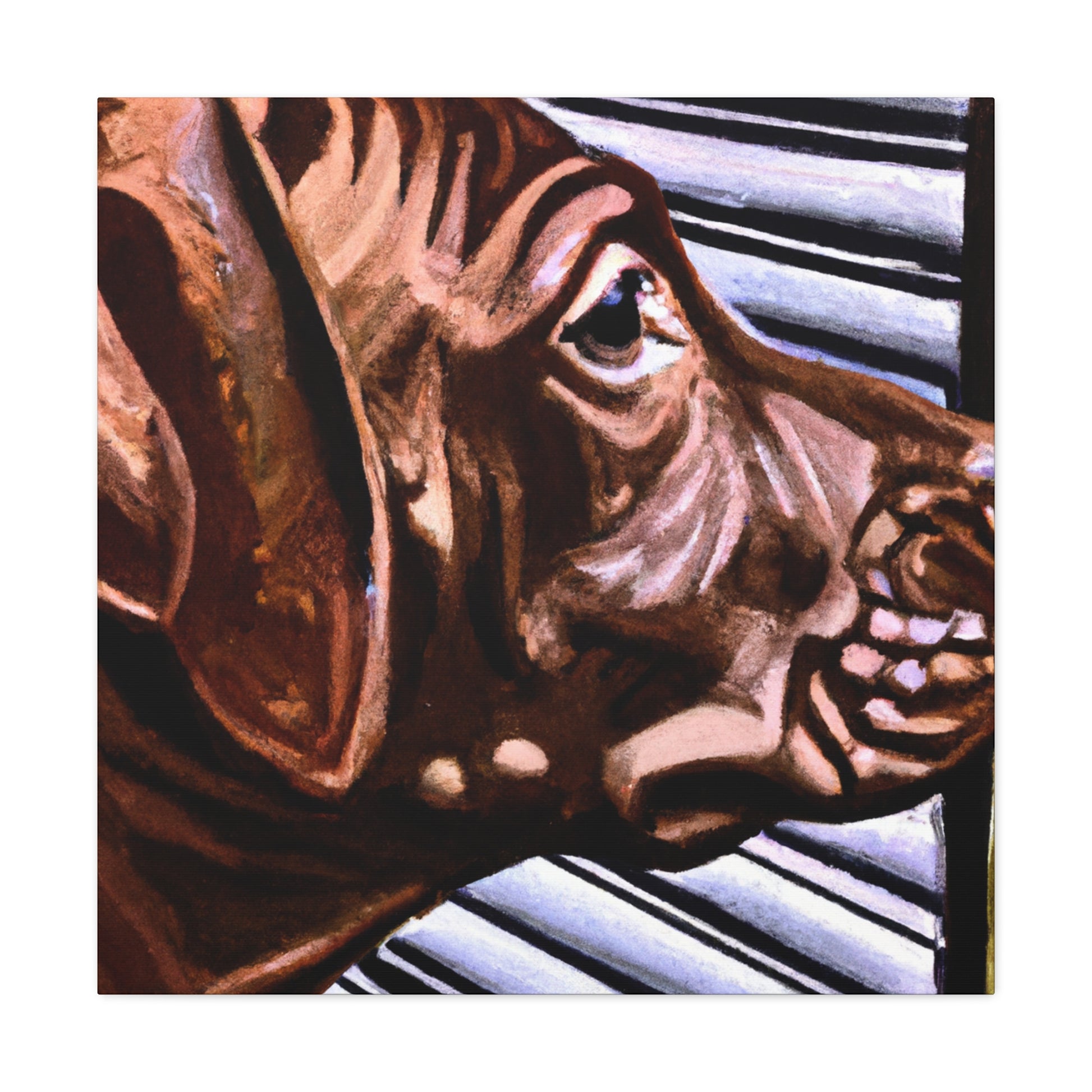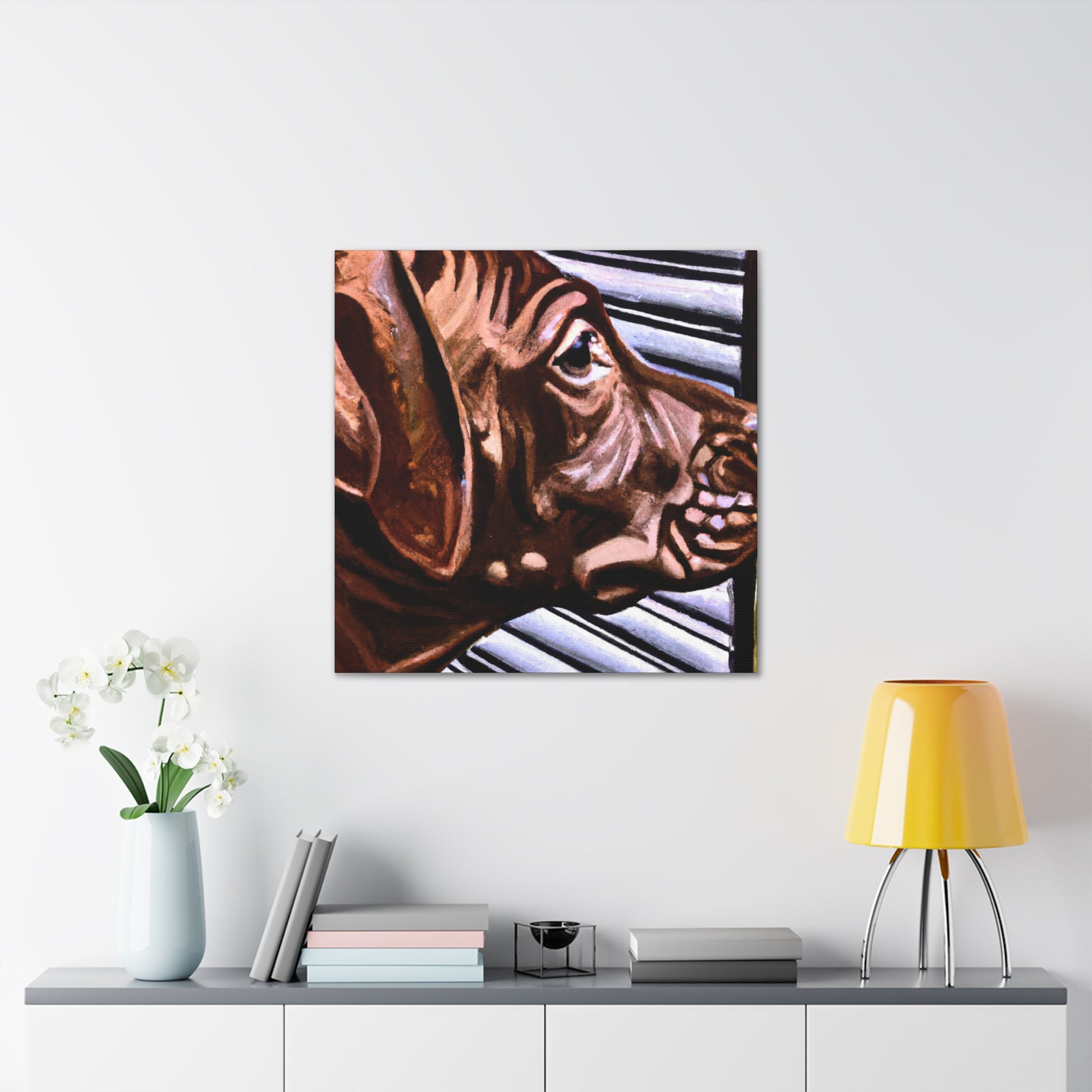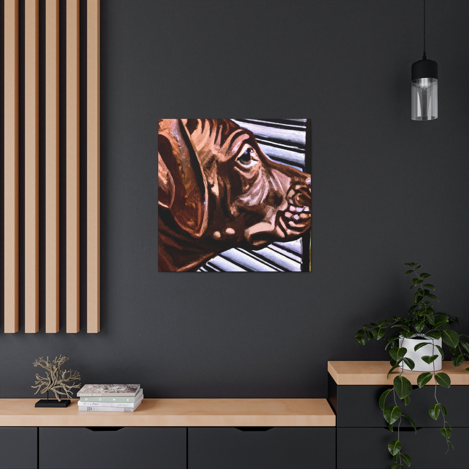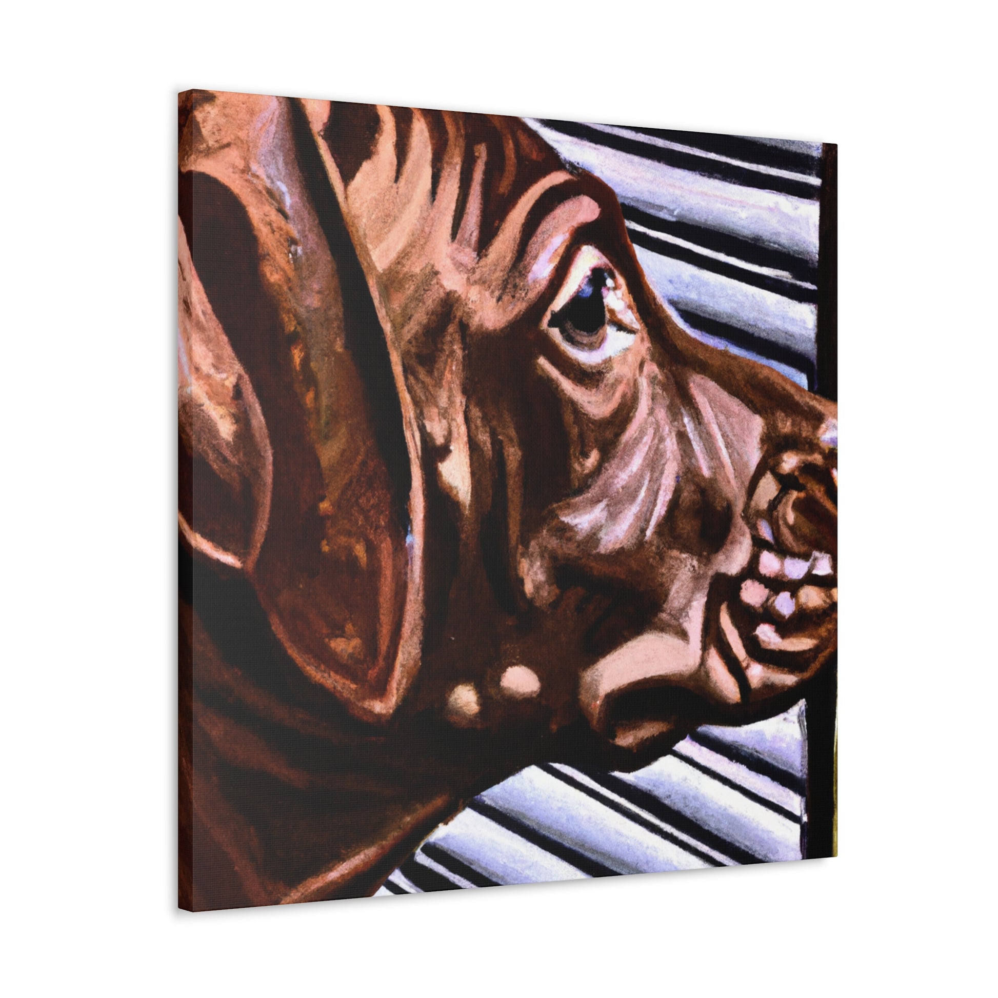This canvas showcases a young brown pit bull with vivid life in his eyes, looking out the window so longingly. All the other elements around the dog are abstract, adding to the mystique of the image. It's a mesmerizing yet classical piece perfect for any home. #dogart #pibbles #canvas #visualart #abstractart #abstructpainting #pitbulls #mysticart #renaissanceart #browndog #youngdog