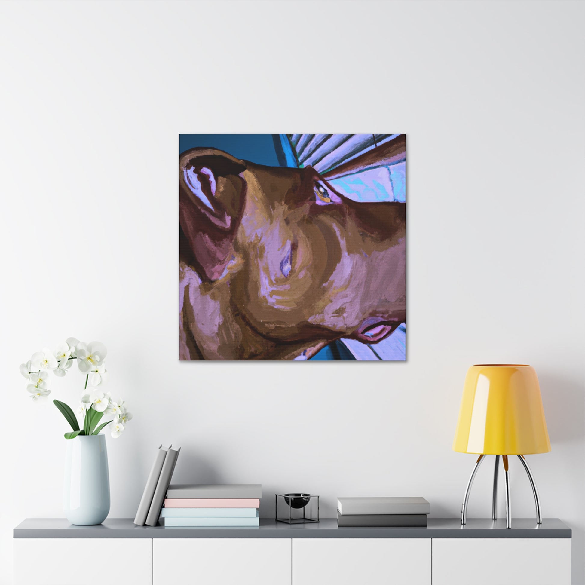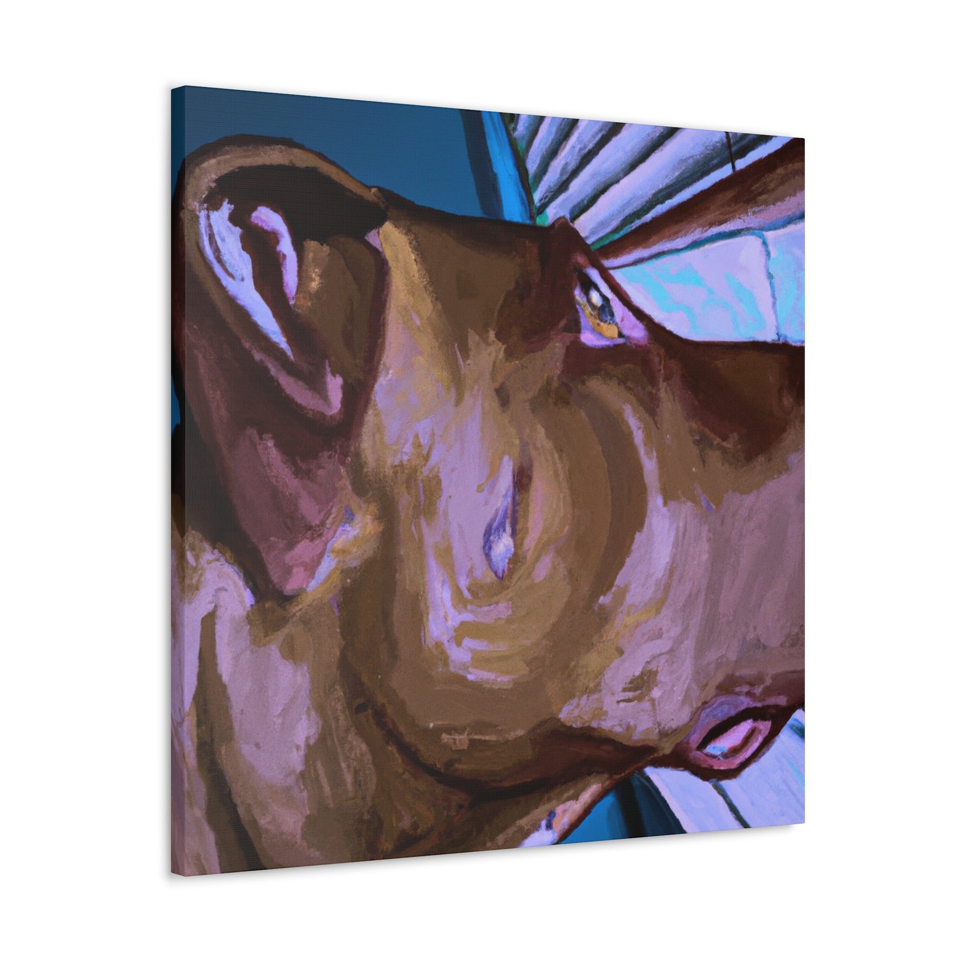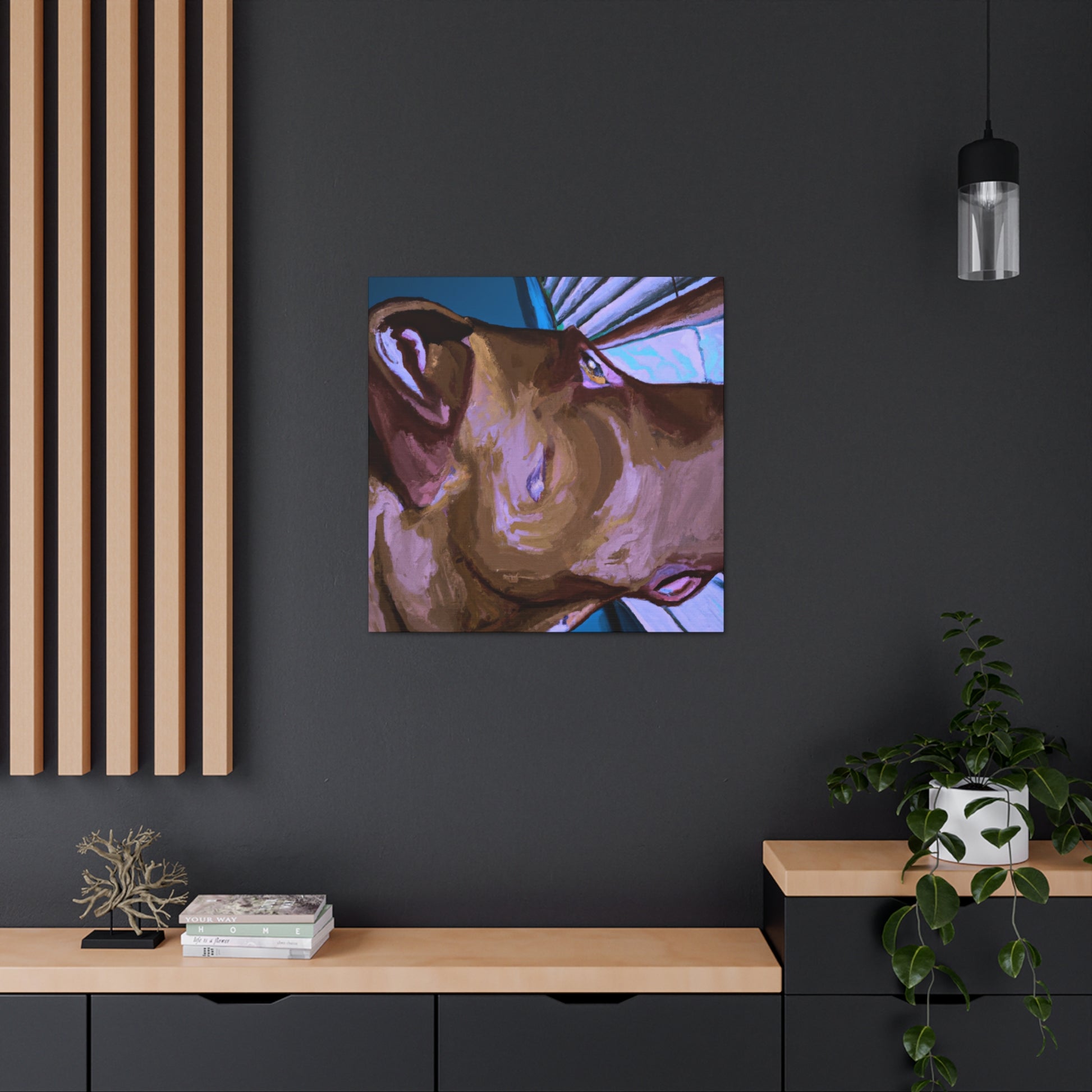 This abstract painting embraces the beauty of the unconditional bond between man and his best friend. The young brown pit bull looks longingly out a psychedelic window, his eyes alive and longing with the joy of life. Add this timeless piece to your home for a classy, yet unique touch. #abstractpainting #dogart #dogpaintings #canvasart #brownpitbull #psychedelicart #artwork #modernart #bondbetweenmananddogh #timelessart #doglovers #dogsmatter