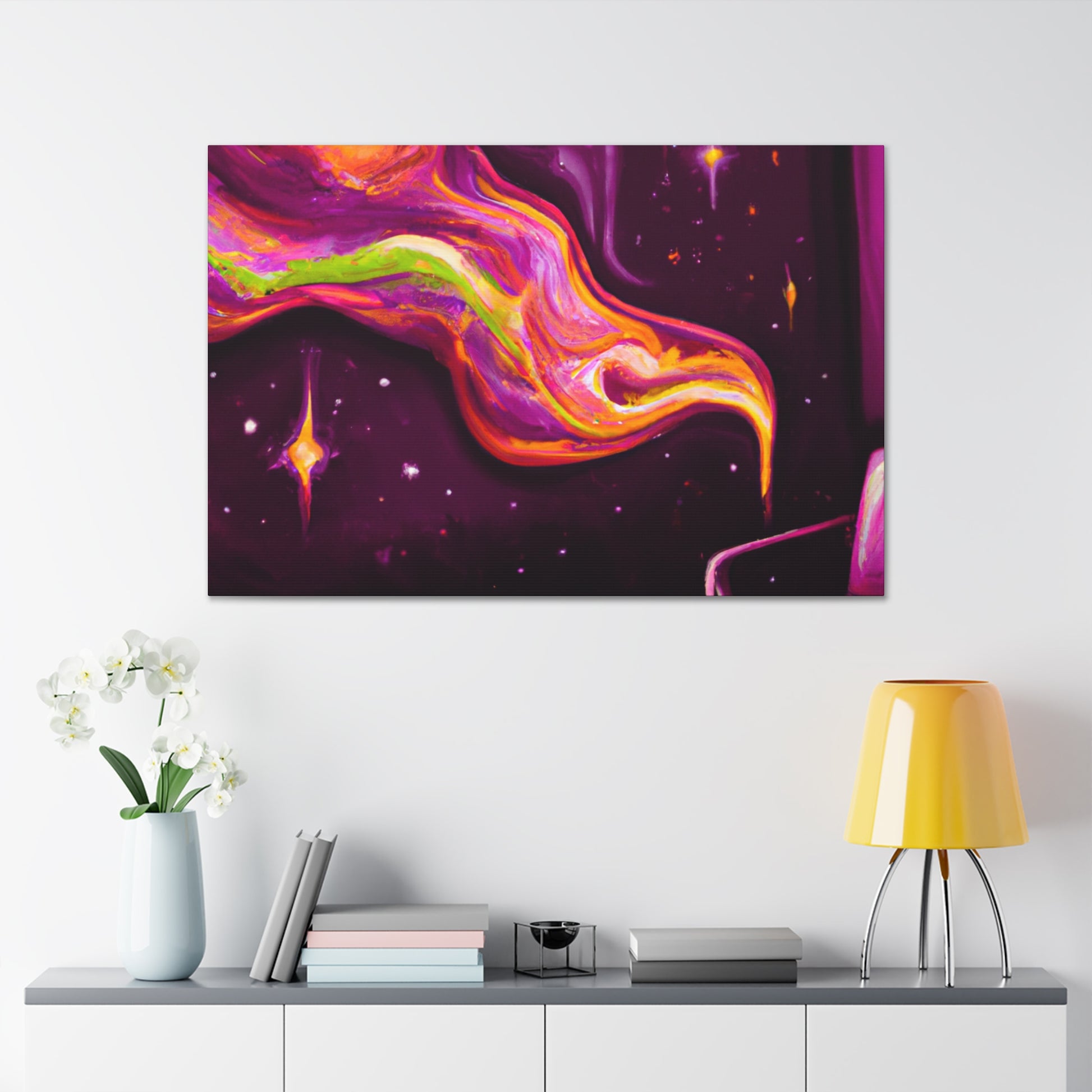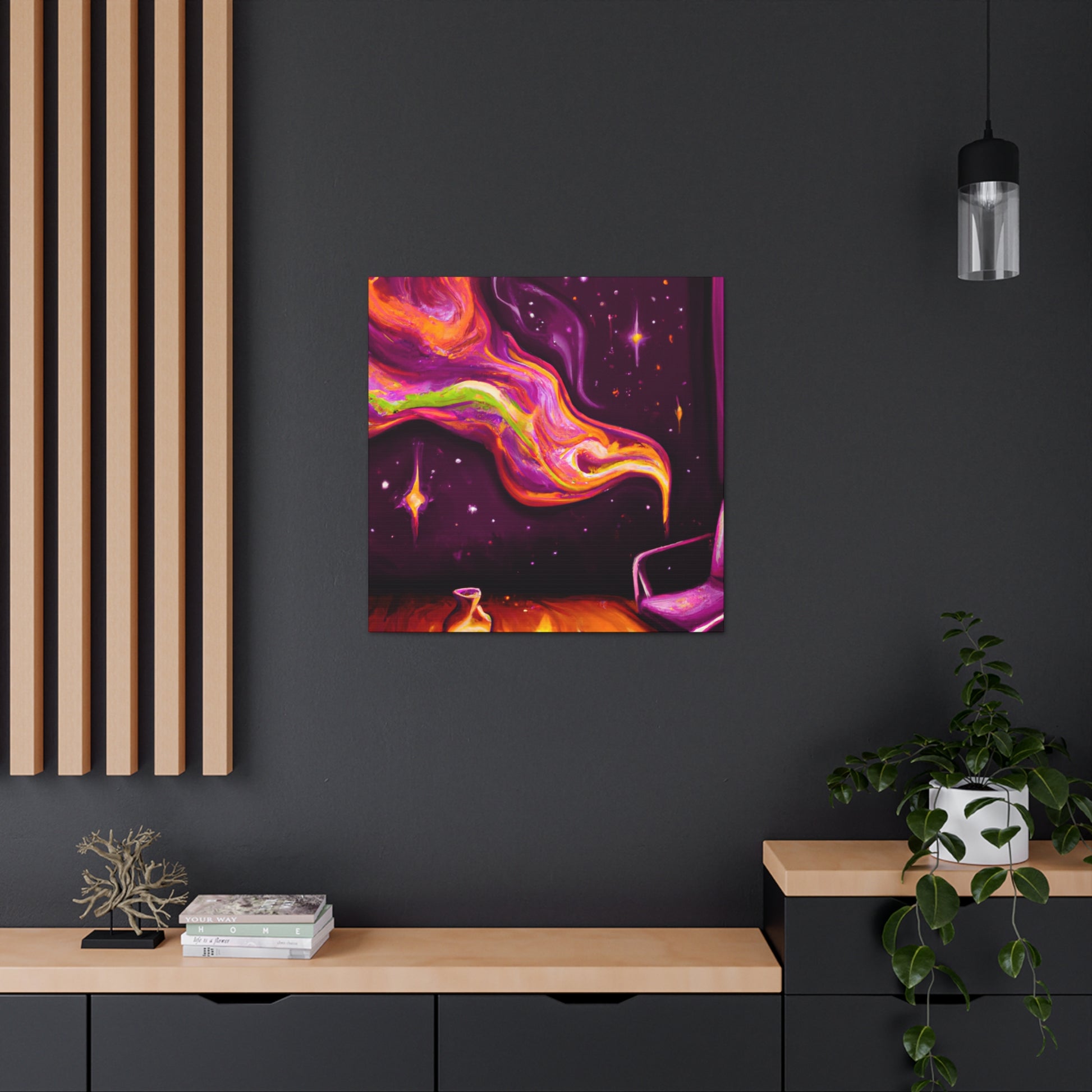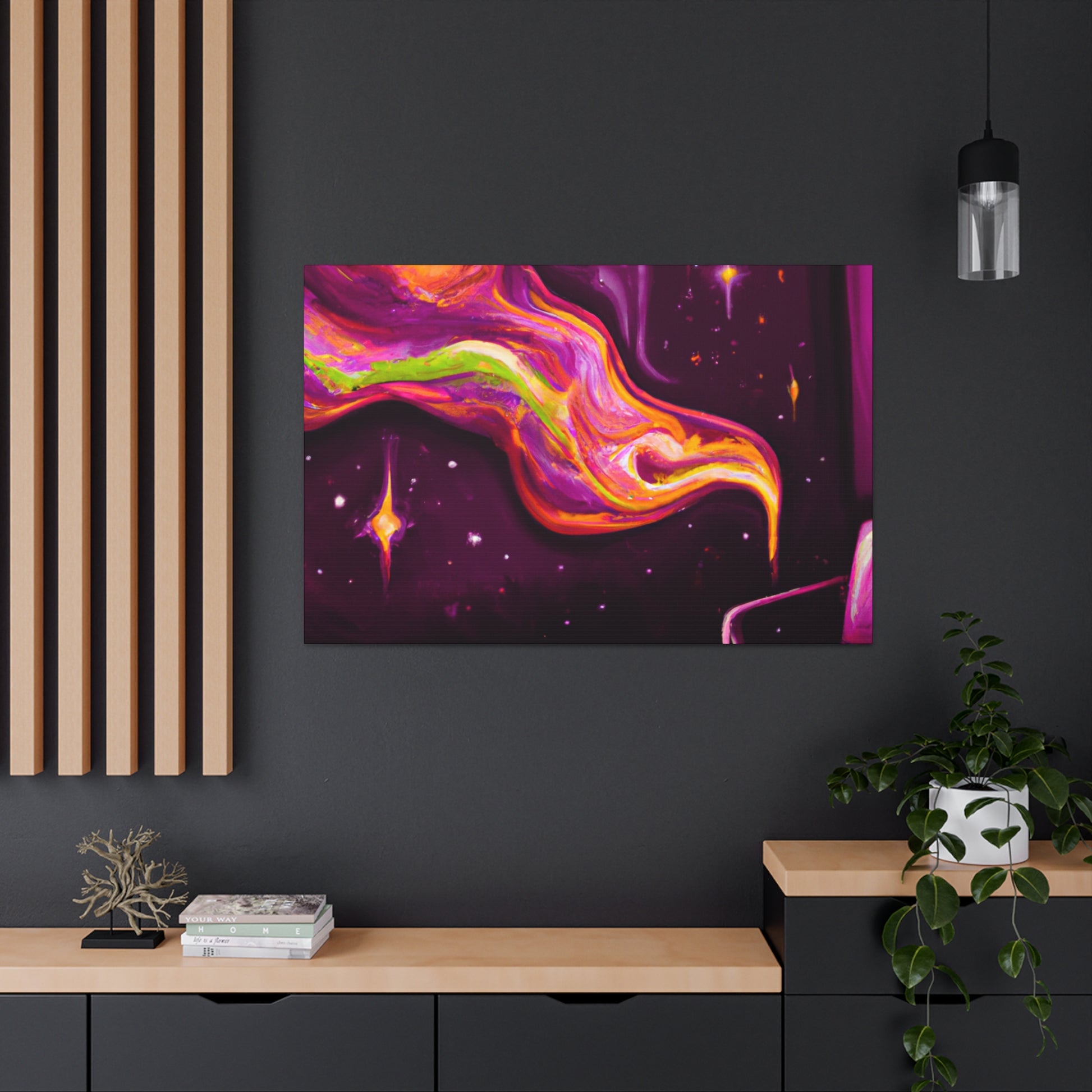 This vibrant canvas will bring a psychedelic pop of colour to your living room. With its abstract shapes and sharp geometry, this digital artwork will add a contemporary finish to your interior. Let your imagination take flight and enjoy this trippy painting. #digitalart #canvasart #abstractart #livingroomdecor #trippypainting #psychedelicart #vibrantart #trendyart #contemporaryart #geometricart #modernart