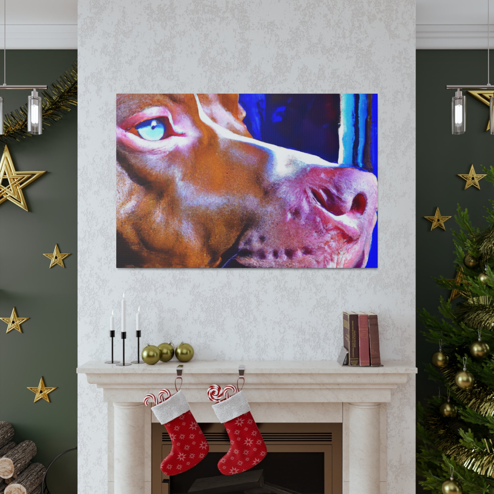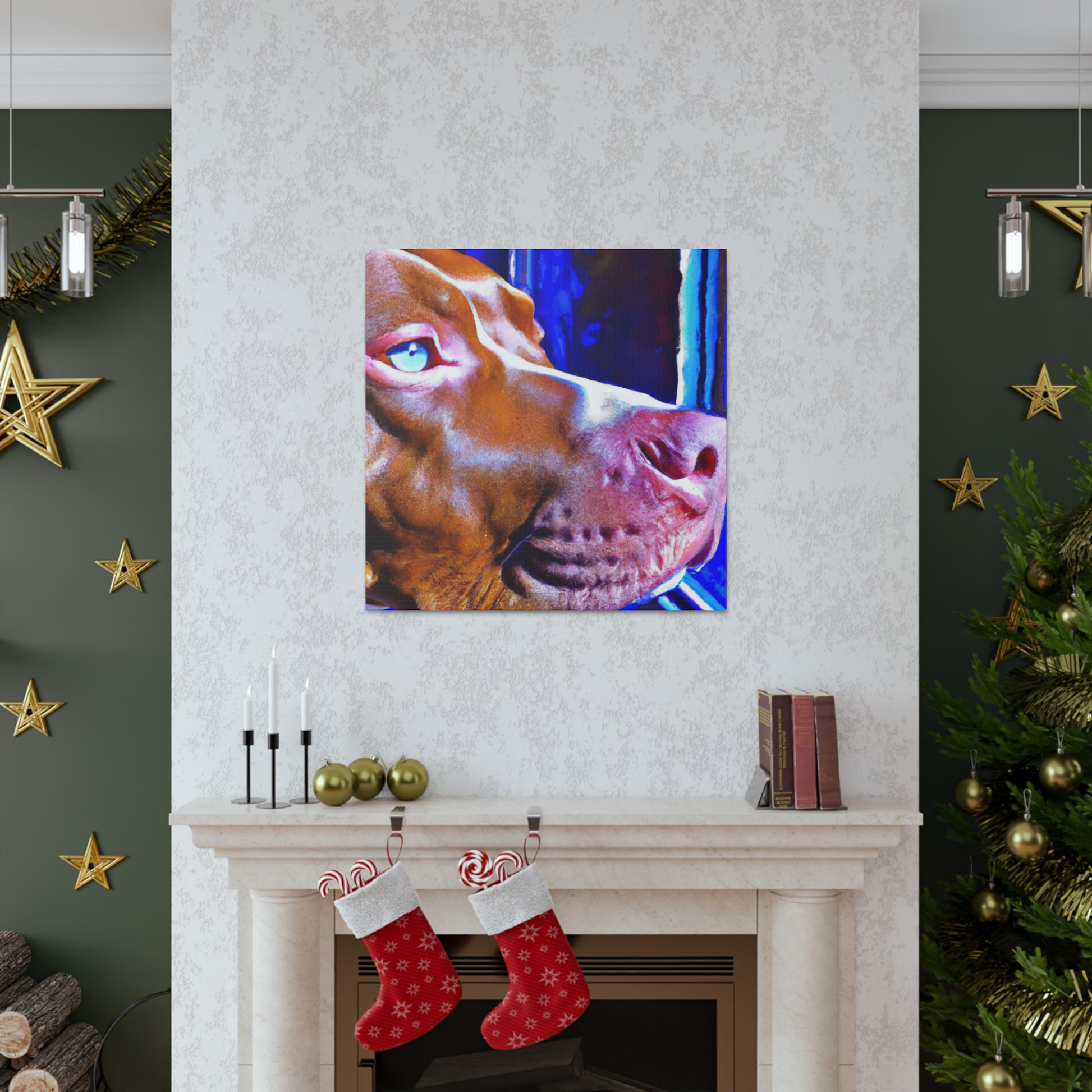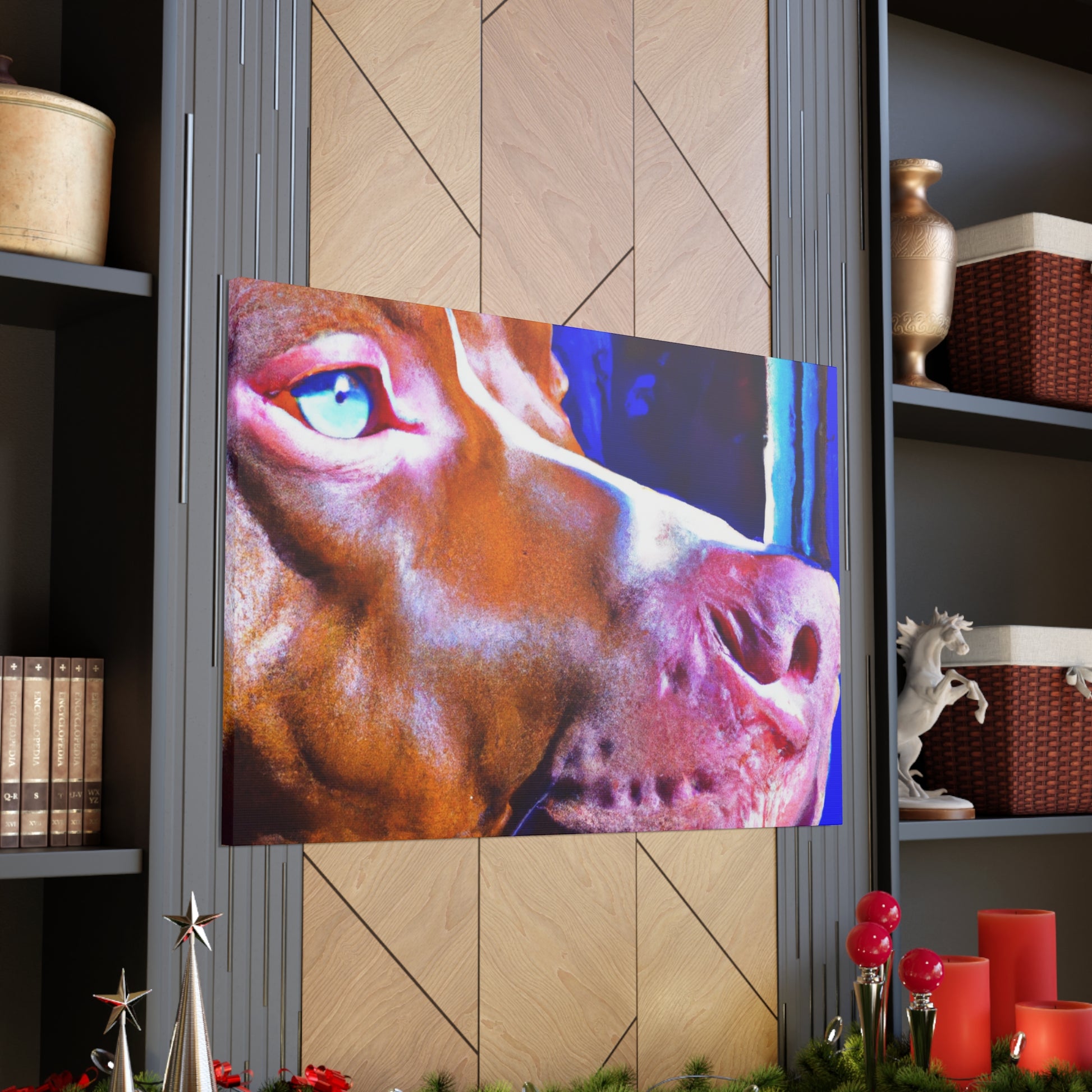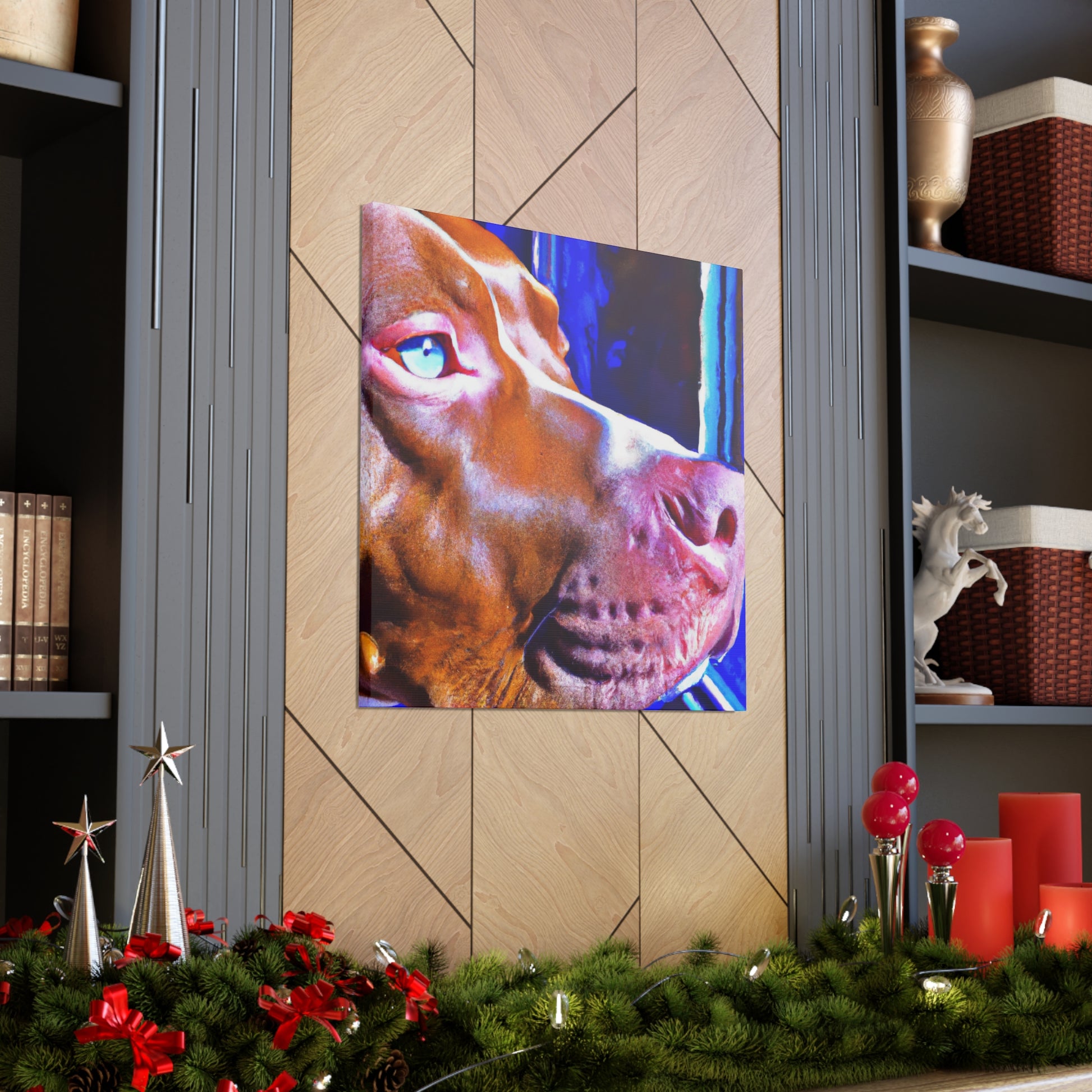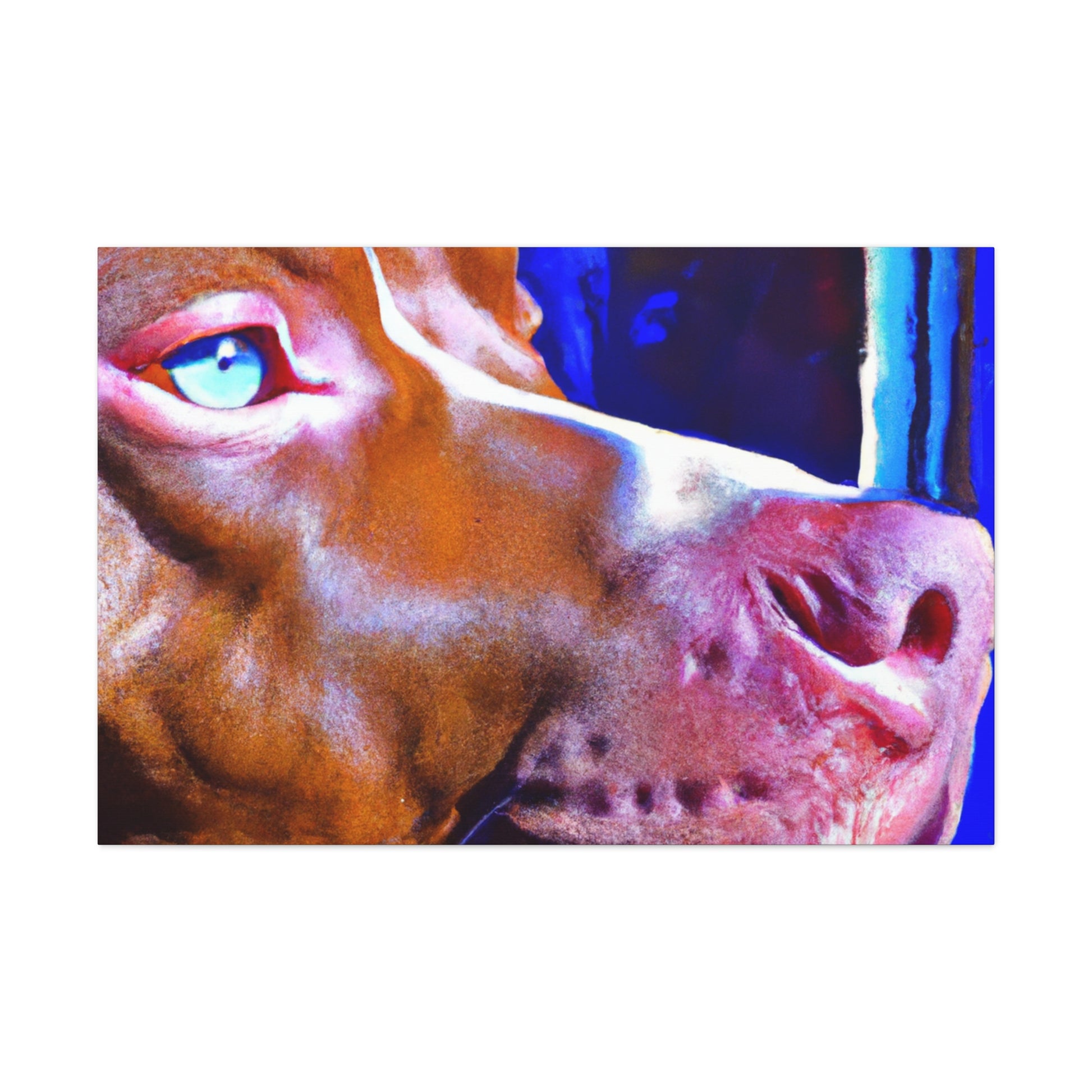 This dazzling abstract painting of a young brown pit bull gazing longingly out the window will add warmth and life to any room. Rarely will one find a canvas that teems with such subtle beauty, energy, and genuine emotion that this piece captures. The bright colors and soft lines create a surreal scene that is sure to leave your guests entranced. #abstractart #abstractcanvas #brownpittie #pittieeyes #lookingoutthewindow #hightechart #popart #bulldogsofig #classypicture #rarecanvas #artforthehome
