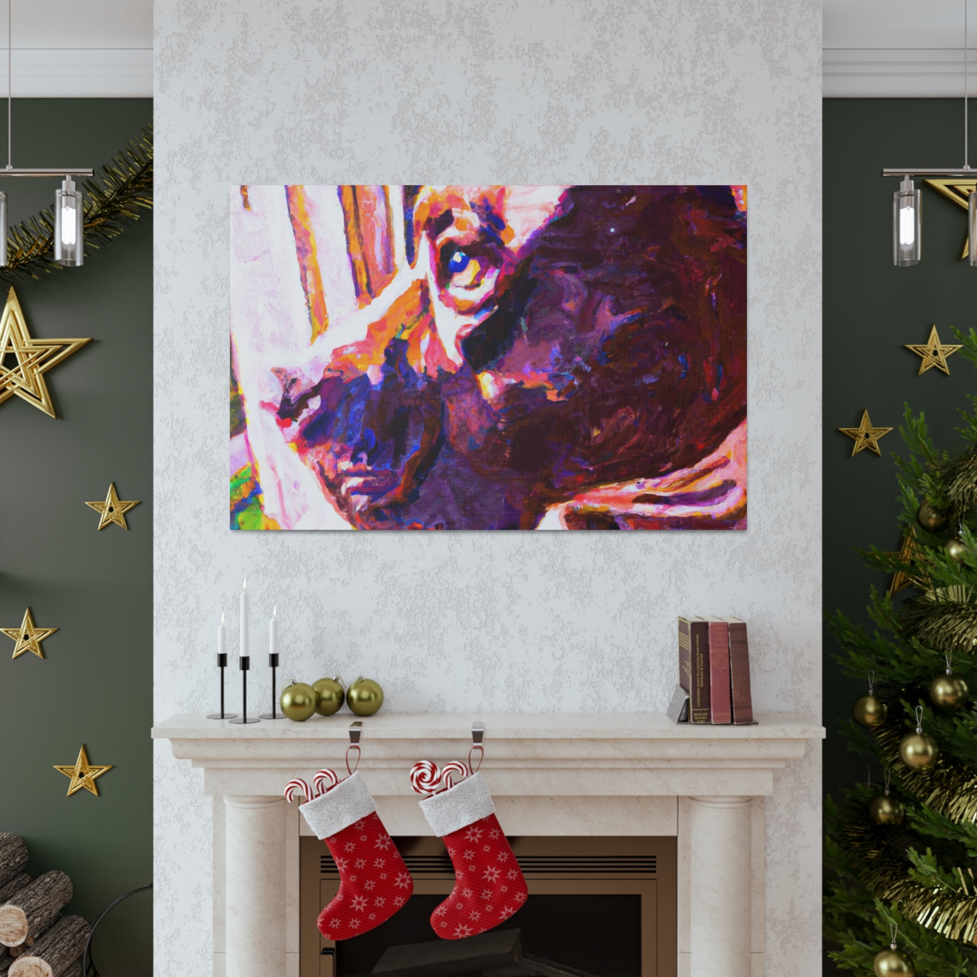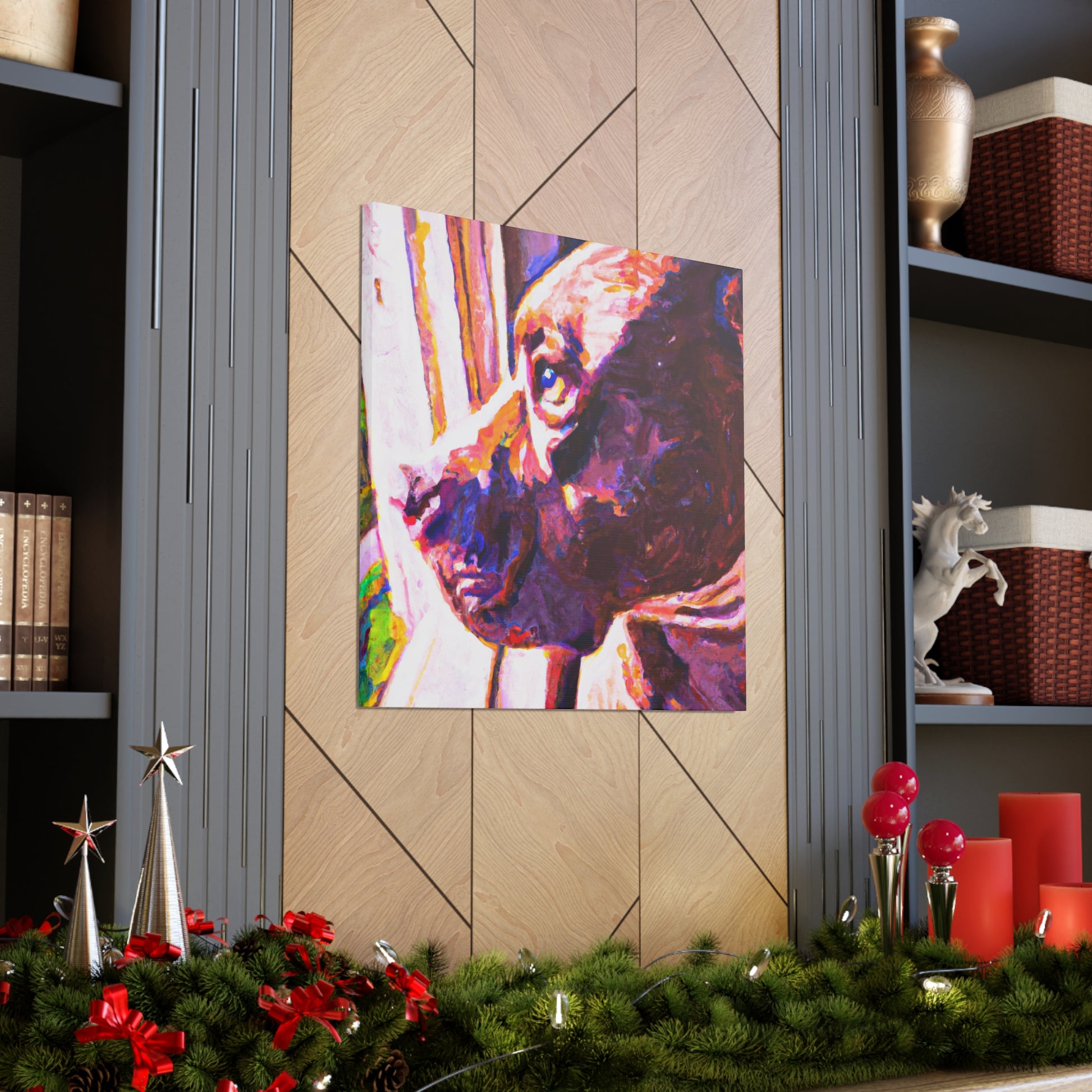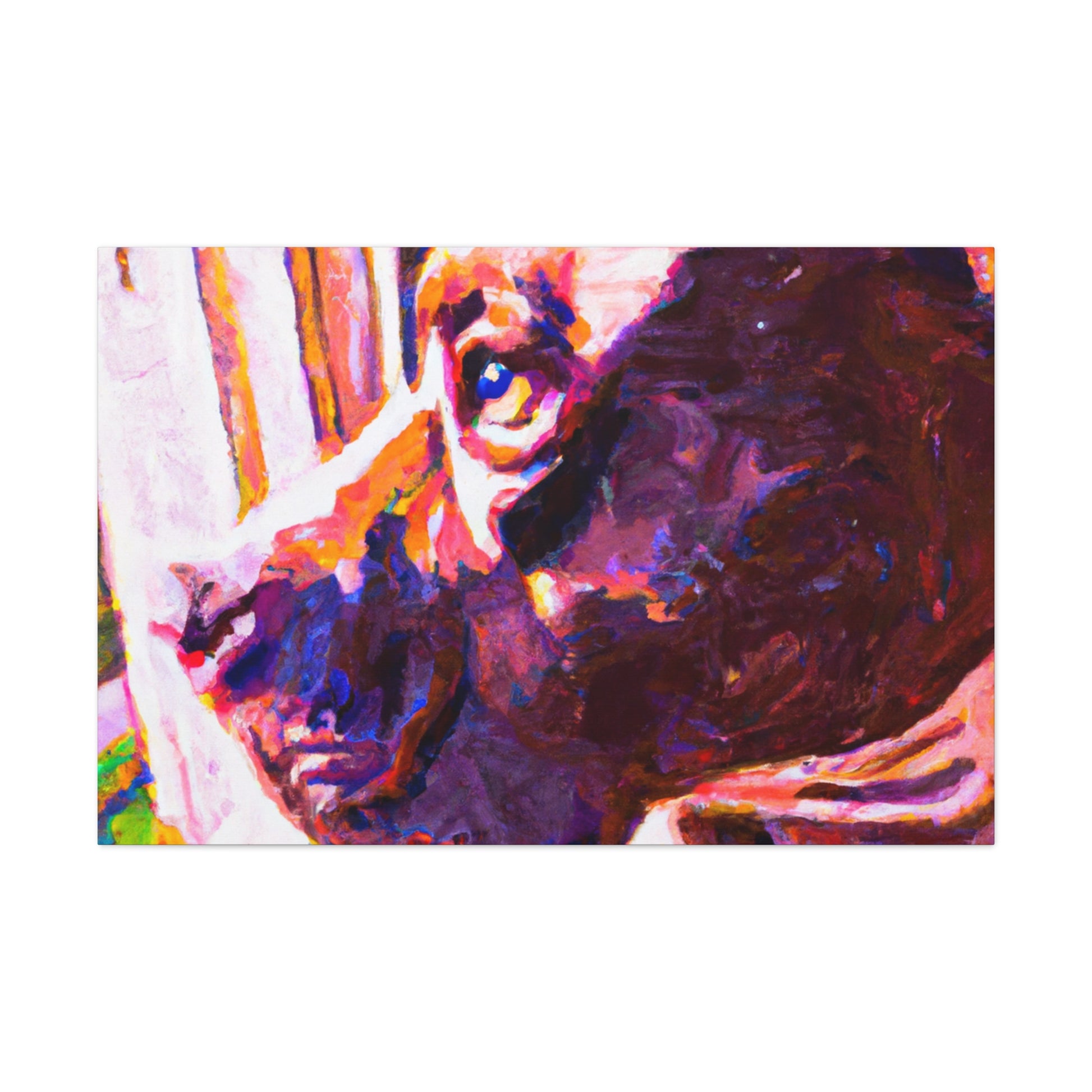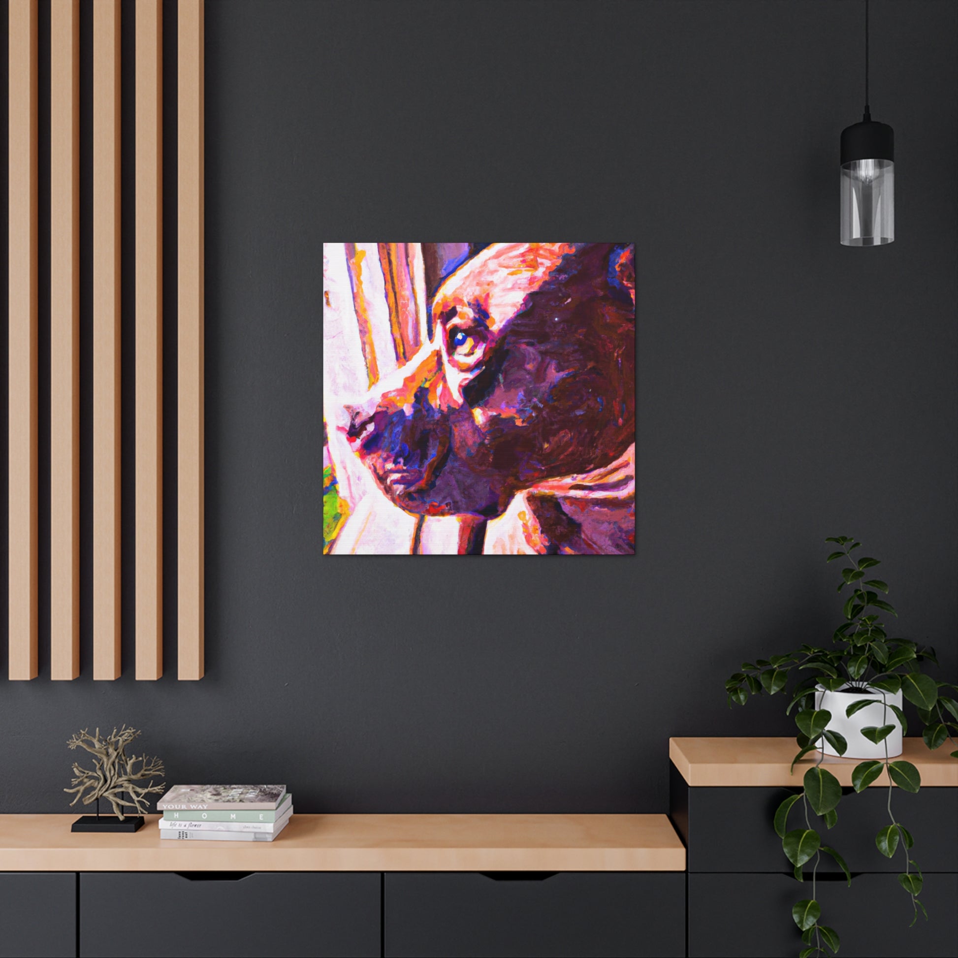 This cheerful canvas featuring an adorable young brown pit bull looking longingly out the window is sure to add life, color, & joy. This timeless piece captures the innocence of the pup, while the surrounding abstract elements remain trippy & hazy. Hang it up & create a lively atmosphere in any room. #abstractart #warmtones #contemporaryart #dogpainting #brownpitbull #eyeexpression #colorexplosion #varioustextures #livelyatmosphere #windowview #timelesspieces