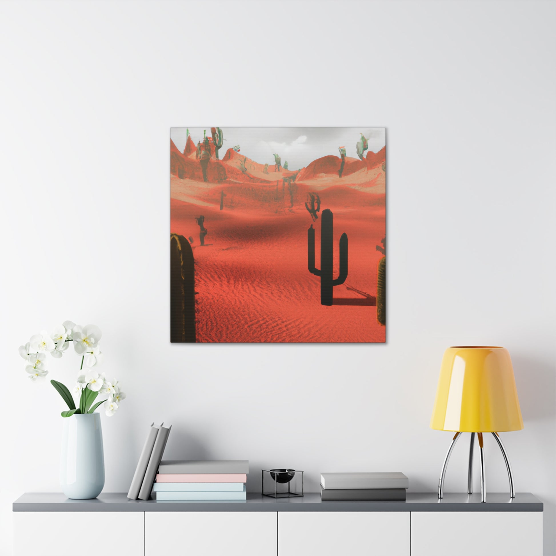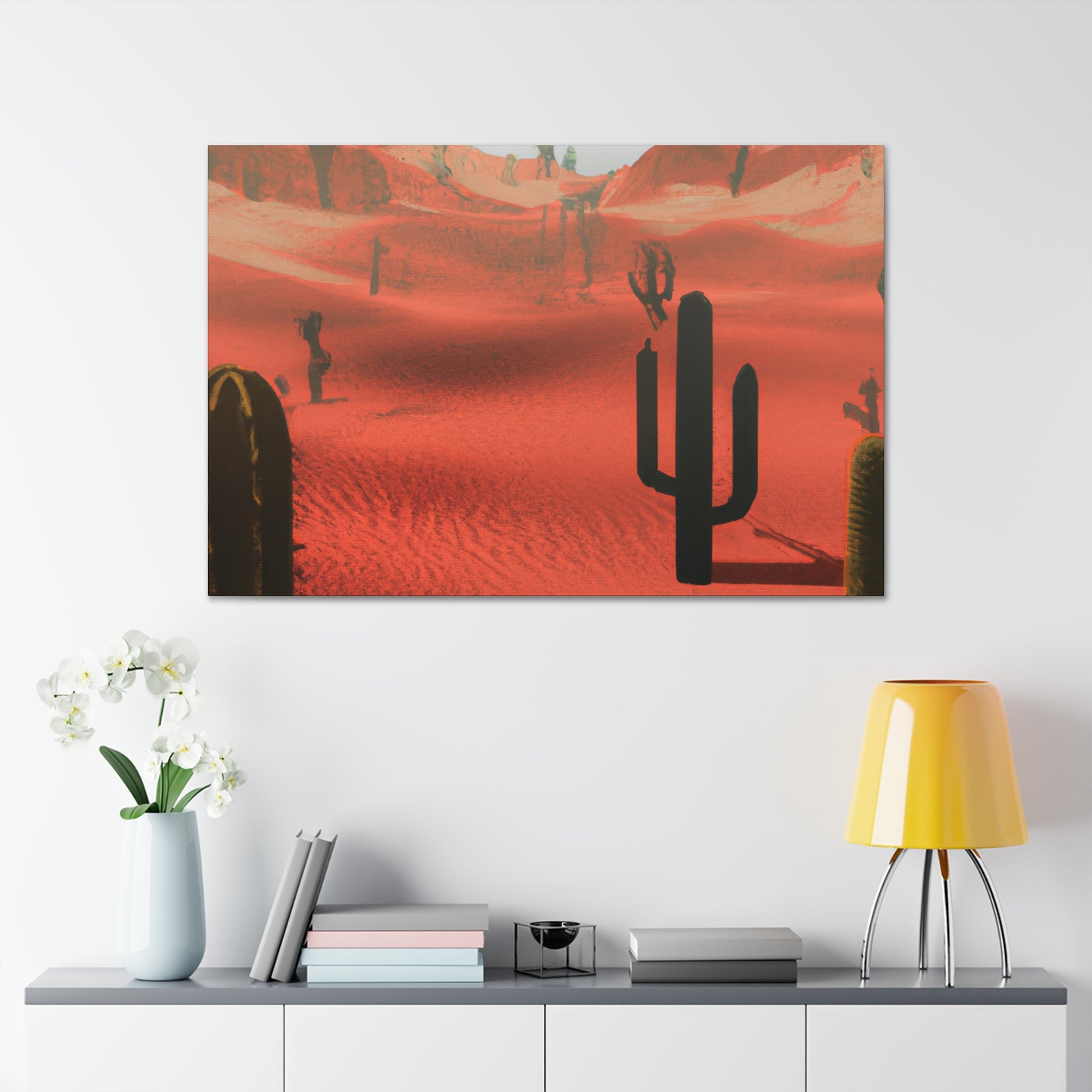Add a truly unique touch to your living room with an exquisite digitally-painted canvas in a modern desert theme. Bold and strong colors create an atmosphere of desert heat and ruggedness, perfect for any modern home. The crisp colors contrast against the hazy desert air to capture the essence of a sun-soaked expanse. Enhance your home with this eye-catching artwork! #DigitalArt #Canvas #ModernArt #LivingRoom #DesertArt #DesertTheme #InteriorDesign #ModernInterior #WallDecor #HomeDecor #RoomDecor