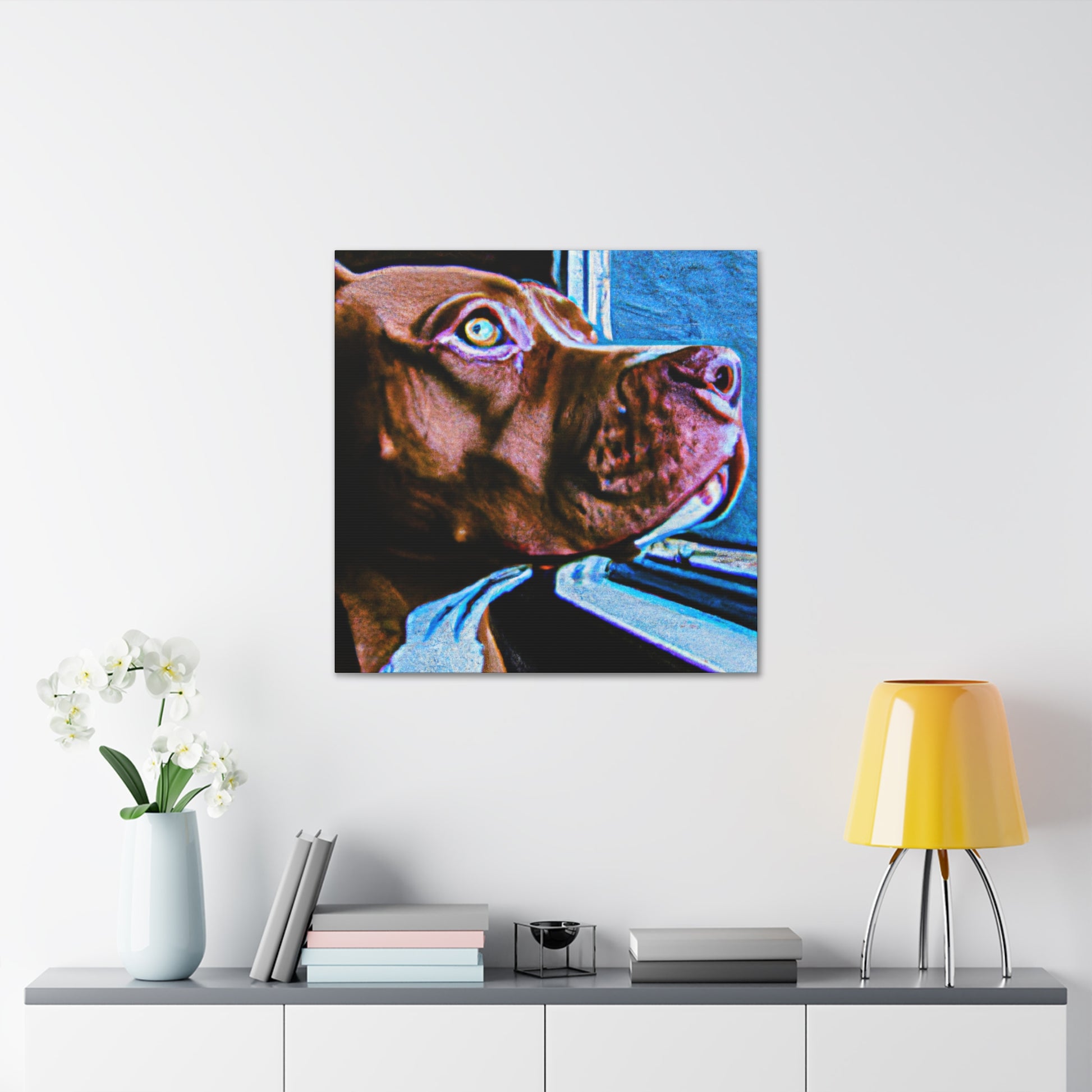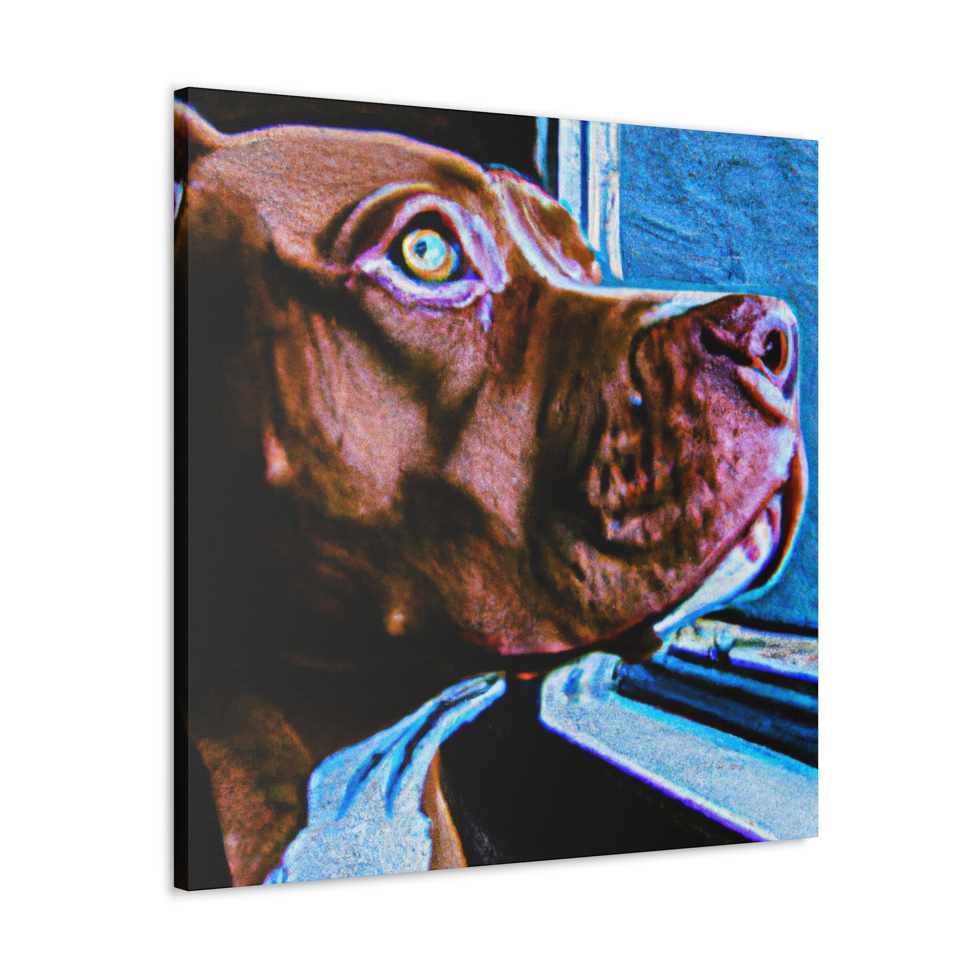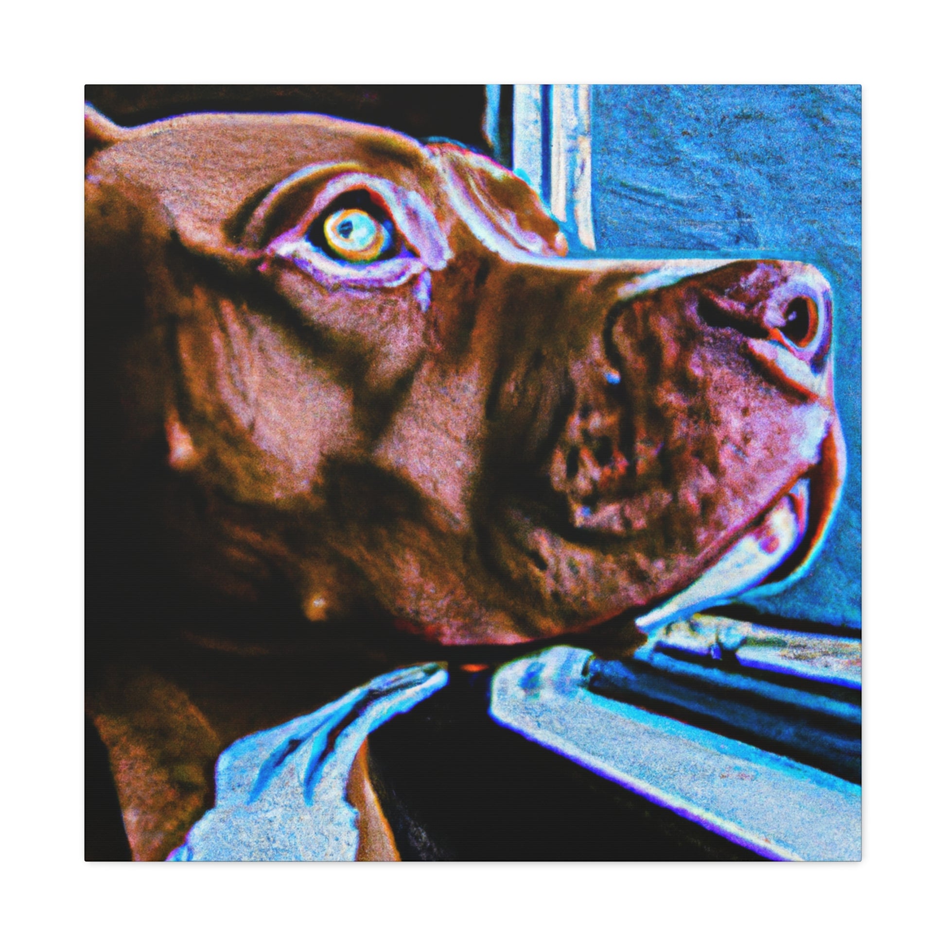 This beautiful painting will add a touch of class to any room. An abstract rendition of a young brown pit bull looking longingly out the window with life in his eyes, the kaleidoscope of colors and sharp edges will capture attention. Trippy shapes and colors fill the scape with the exception of the dog, the only still point in the painting. Dare to dream and grab your own piece of artwork today! #dog #pitbull #abstract #art #painting #canvas #kaleidoscope #trippy #dream #colorful #lively #young
