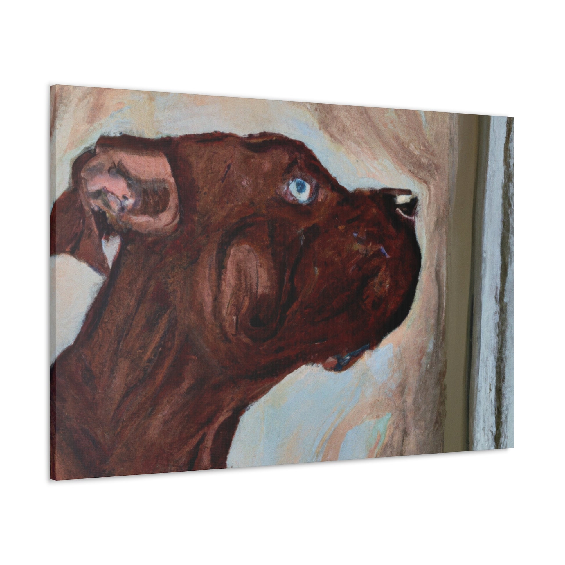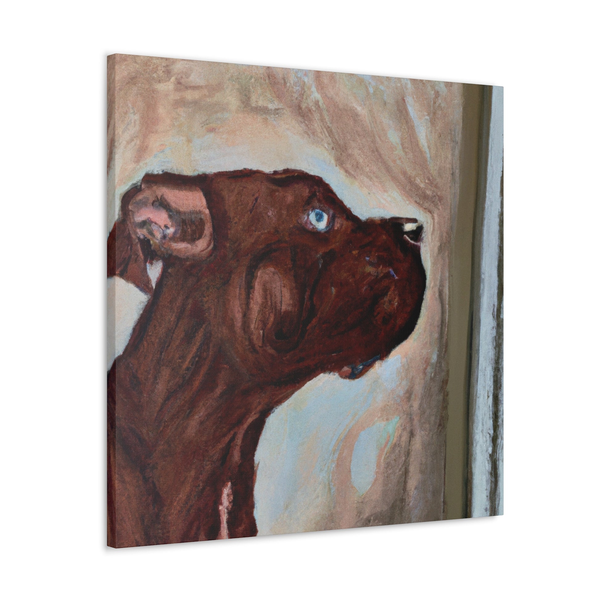 Take a look at this beautiful abstract canvas that will take you to a world of imagination. This painting features a young brown pit bull who is looking out the window longingly with lots of life in his eyes. The rest of the painting is trippy and surreal with bold colors and shapes, making for a truly unique piece of art. Add this canvas to your home or office to express your creative and individual style. #abstractart #artcanvas #dogpainting #wallhanging #longing #uniqueart #vividcolors #boldshapes #homedecor #classystyle #surreality