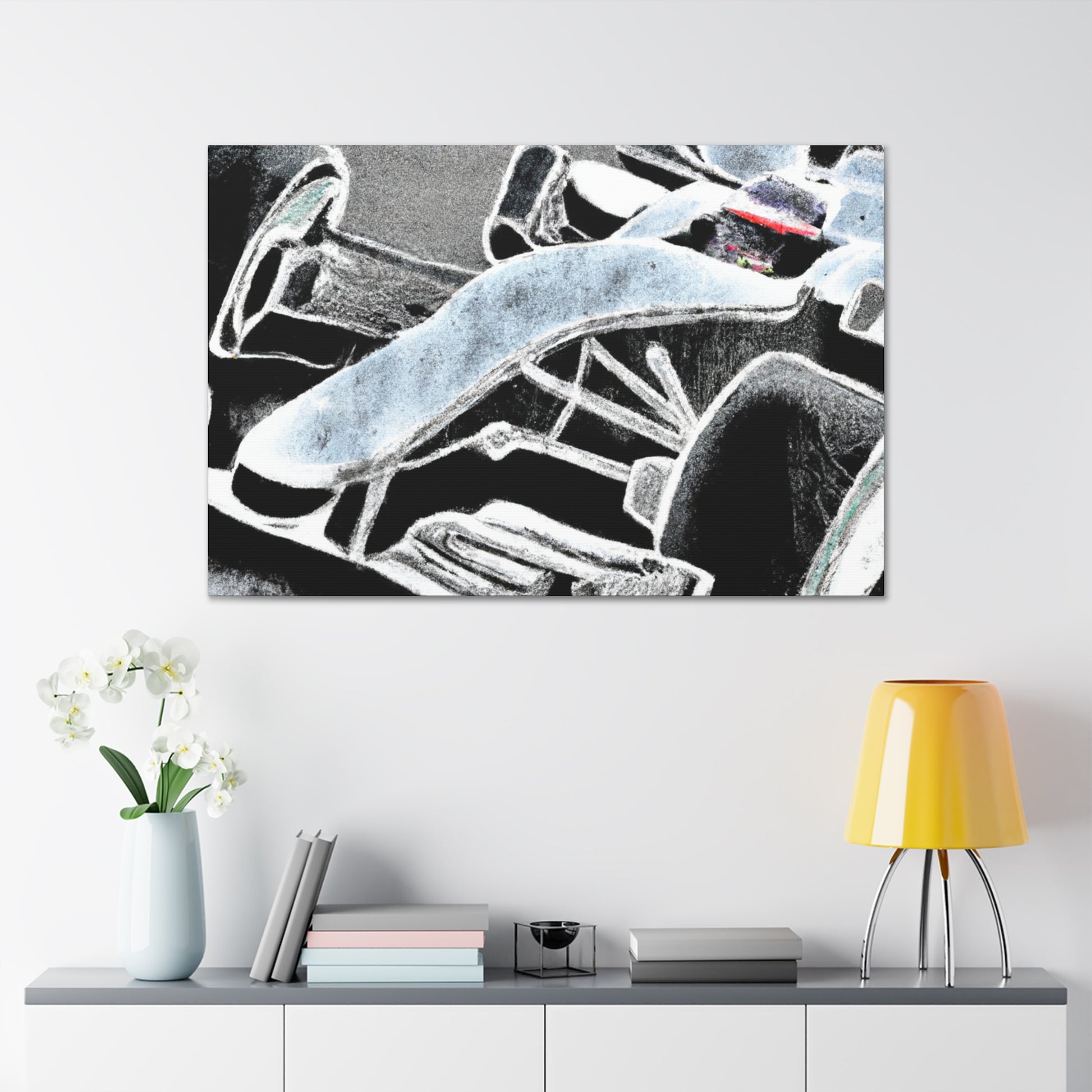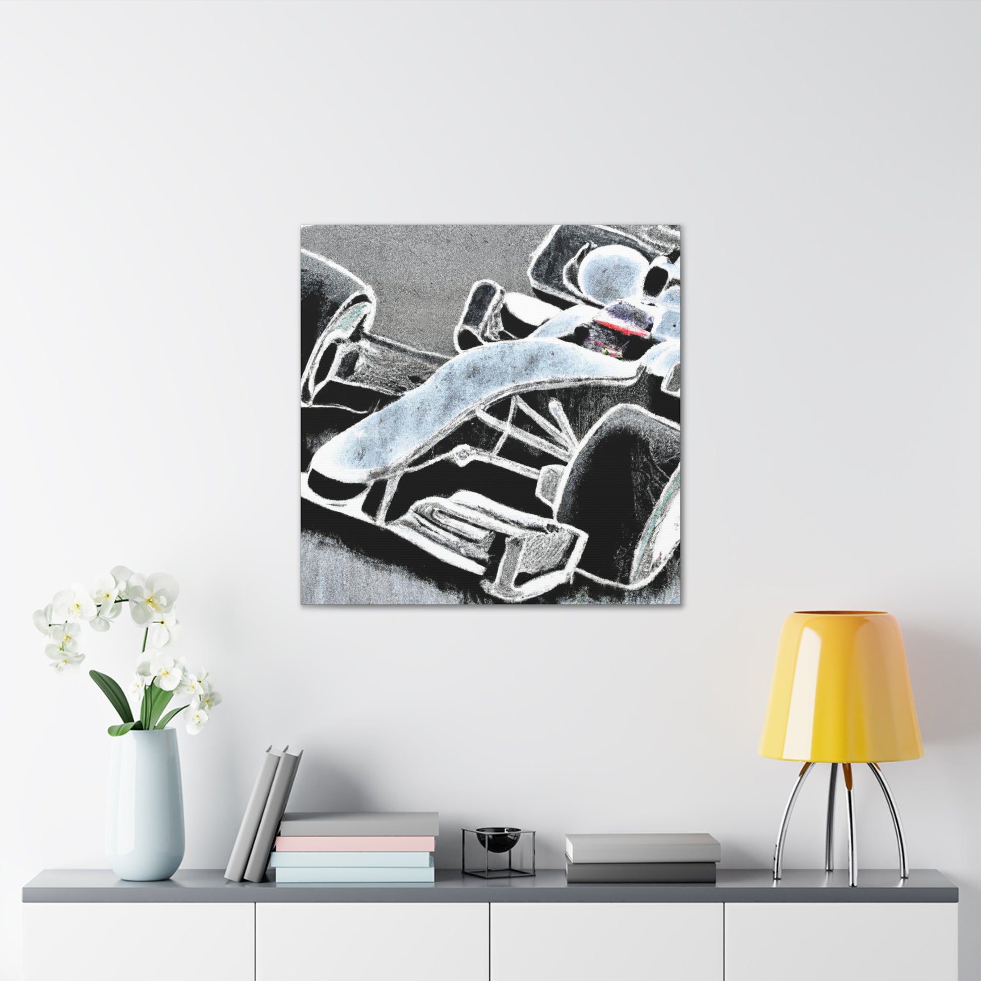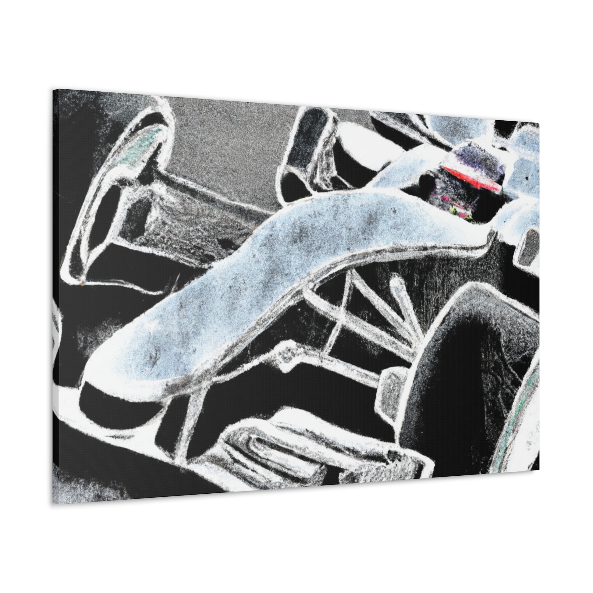 Art meets speed in this breathtaking canvas of a Formula One car, rendered in the stylish chalk art style for an incredible look. Set against a bold background to make a statement, this larger than life piece captures the essence of the race, and will fit in perfectly with any motorsport-inspired decor. #art #canvas #motorsport #chalkart #formulaone #decor #painting #racelife #speed #souvenir #wallart